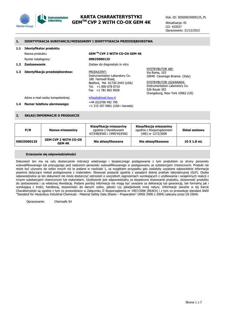 KARTA CHARAKTERYSTYKI GEMTM CVP 2 WITH CO-OX GEM 4K 1. IDENTYFIKACJA SUBSTANCJI/MIESZANINY I IDENTYFIKACJA PRZEDSIĘBIORSTWA 1.1 Identyfikator produktu Nazwa produktu: GEM TM CVP 2 WITH CO-OX GEM 4K Numer katalogowy: 00025000125 1.2 Zastosowanie Zestaw do diagnostyki in vitro 1.3 Identyfikacja przedsiębiorstwa: PRODUCENT: Instrumentation Laboratory Co. 180 Hartwell Road, Bedford, MA 01730-2443 (USA) Tel. +1 800 678 0710 Fax +1 781 863 9928 Adres e-mail osoby kompetentnej: 1.4 Numer telefonu alarmowego: 2. SKŁAD/INFORMACJE O PRODUKCIE Aktualizacja: 01 CO: 433537 Opracowano: 21/12/2012 DYSTRYBUTOR WE: Via Roma, 103 20040 Cavenago Brianza (Italy) DYSTRYBUTOR US/KANADA: Instrumentation Laboratory Co. 526 Route 303 Orangeburg, New York 10962 (US) [email protected] +44 (0)3700 492 795 +1 215 207 0061 (USA i Kanada) Nazwa mieszaniny Klasyfikacja mieszaniny zgodnie z Dyrektywami 67/548/EWG i 1999/45/EWG Klasyfikacja mieszaniny zgodnie z Rozporządzeniem (WE) nr 1272/2008 Skład zestawu GEM CVP 2 WITH CO-OX GEM 4K Nie sklasyfikowana Nie sklasyfikowana 10 X 1.8 mL P/N 00025000125 Dok. ID: SDS00025000125_PL Zrzeczenie się odpowiedzialności Dokument ten ma na celu dostarczenie instrukcji właściwego i bezpiecznego postępowania z tym produktem ze strony personelu wykwalifikowanego lub pracującego pod nadzorem personelu wykwalifikowanego w postępowaniu ze substancjami chemicznymi. Produkt nie może być używany do celów innych niż te podane w rozdziale 1, za wyjątkiem przypadku gdy zostałyby uzyskane odpowiednie informacje pisemne dotyczące metod postępowania z materiałem. Stosować preparat zgodnie z zasadami dobrej praktyki laboratoryjnej (GLP). Osoba odpowiedzialna za ten dokument nie może dostarczyć ostrzeżeń o wszystkich zagrożeniach wynikających z użytkowania i wzajemnych reakcji z innymi substancjami chemicznymi lub materiałami. Użytkownik jest odpowiedzialny za bezpieczne stosowanie produktu, stosowność produktu do zastosowania i za właściwą likwidację. Podane poniżej informacje nie mogą być uważane za deklarację lub gwarancję, tak formalną jak i wynikającą z treści, handlową, stosowności do danych celów, jakości czy jakiejkolwiek innej natury. Informacje zawarte w tej Karcie Charakterystyki są zgodne z tym co przewidziano w Załączniku II Rozporządzenia nr 1907/2006 (REACh) i z tym co przewiduje standard ANSI “Standard for Hazardous Industrial Chemicals - Material Safety Data Sheets – Preparation” (ANSI Z400.1-2004) zalecany przez US OSHA. Opracowanie: Chemsafe Srl Strona 1 z 7 KARTA CHARAKTERYSTYKI GEM CVP 2 WITH CO-OX GEM 4K Dok. ID: SDS00025000125_PL Aktualizacja: 01 CO: 431537 Opracowano: 21/12/2012 1. IDENTYFIKACJA SUBSTANCJI/MIESZANINY I IDENTYFIKACJA PRZEDSIĘBIORSTWA 1.1 Identyfikator produktu Nazwa produktu: GEM CVP 2 WITH CO-OX GEM 4K Numer katalogowy: 00025000125 1.2 Zastosowanie produktu do diagnostyki in vitro 1.3 Identyfikacja przedsiębiorstwa: PRODUCENT: Instrumentation Laboratory Co. 180 Hartwell Road, Bedford, MA 01730-2443 (USA) Tel. +1 800 678 0710 Fax +1 781 863 9928 Adres e-mail osoby kompetentnej: [email protected] 1.4 Numer telefonu alarmowego: +44 (0)3700 492 795 +1 215 207 0061 (USA i Kanada) 2. IDENTYFIKACJA ZAGROŻEŃ 2.1 Klasyfikacja substancji/ mieszaniny 2.2 3. DYSTRYBUTOR WE: Via Roma, 103 20040 Cavenago Brianza (Italy) DYSTRYBUTOR US/KANADA: Instrumentation Laboratory Co. 526 Route 303 Orangeburg, New York 10962 (US) (patrz rów nież punkt 15) Klasyfikacja: nie jest niebezpieczna zgodnie z Dyrektywami 67/548/EWG i 1999/45/EWG Klasyfikacja: nie jest niebezpieczna zgodnie z Rozporządzeniem (WE) nr 1272/2008 Potencjalny wpływ na zdrowie i środowisko Połknięcie: połknięta może być szkodliwa. Ekspozycja na inhalację: może powodować podrażnienie. Kontakt ze skórą: może powodować podrażnienie. Kontakt z oczami: może powodować podrażnienie. Uczulenie: może powodować uczulenie przy inhalacji lub kontakcie ze skórą. Wystawienie środowiskowe: może mieć negatywny wpływ na środowisko. SKŁAD /INFORMACJA O SKŁADNIKACH Skład: roztwór wodny zawierający składniki organiczne i nieorganiczne. 3.1 Niebezpieczne składniki: Nazwa Numer EINECS/ELINCS Numer CAS Zawartość % (w/w) Klasyfikacja 67/548/EWG Klasyfikacja 1272/2008/WE Dwuwodny chlorek wapnia (*) 233-140-8 (jako bezwodny chlorek wapnia) 10035-04-8 (10043-52-4 jako bezwodny chlorek wapnia) < 0.02 % Xi, R36 Eye Irrit. 2, H319 2-oktylo- 2H-izotiazol-3–on (*) 247-761-7 26530-20-1 < 0.003 % T; R23/24 Xn; R22 C; R34 R43: c ≥ 0,05 % N; R50-53 Acute Tox. 3, H331 Acute Tox. 3, H311 Acute Tox. 4, H302 Skin Corr. 1B, H314 Skin Sens. 1, H317: c ≥ 0,05 % Aquatic Acute 1, H400 Aquatic Chronic 1, H410 Brij 35 500-002-6 9002-92-0 < 0.03 % Xn, R22 Xi, R36 Acute Tox. Cat 4 , H302 Eye Irrit. 2, H319 Siarczan gentamycyny (sól) 215-778-9 1405-41-0 < 0.03 % Xn, R42/43 Resp. Sens. 1, H334 Skin Sens. 1, H317 Co do dopuszczalnych w artości narażenia patrz punkt 8, co do pełnego tekstu zw rotów R i w skazań zagrożenia patrz punkt 16. Strona 2 z 7 KARTA CHARAKTERYSTYKI GEM CVP 2 WITH CO-OX GEM 4K 4. 5. 6. Dok. ID: SDS00025000125_PL Aktualizacja: 01 CO: 431537 Opracowano: 21/12/2012 ŚRODKI PIERWSZEJ POMOCY Połknięcie: w przypadku połknięcia, przepłukać gardło dużą ilością wody, jeżeli osoba jest przytomna. W przypadku nagłej niedyspozycji skonsultować się z lekarzem. Ekspozycja na inhalację: przemieścić osobę na otwarte powietrze w przewiewne miejsce. W przypadku nagłej niedyspozycji skonsultować się z lekarzem. Kontakt ze skórą: Usunąć skażoną odzież. Obmyć zanieczyszczoną część ciała mydłem lub delikatnym detergentem i obficie opłukać wodą. W przypadku nagłej niedyspozycji skonsultować się z lekarzem. Kontakt z oczami: Natychmiast obficie przemyć wodą lub roztworem soli fizjologicznej. Trzymać dobrze otwarte powieki podczas przemywania. W przypadku nagłej niedyspozycji skonsultować się z lekarzem. 