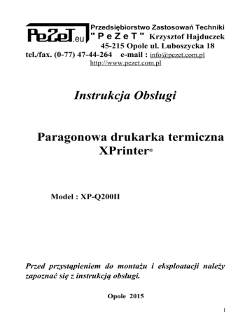 Przedsiębiorstwo Zastosowań Techniki " P e Z e T " Krzysztof Hajduczek 45-215 Opole ul. Luboszycka 18 tel./fax. (0-77) 47-44-264 e-mail : [email protected] http://www.pezet.com.pl Instrukcja Obsługi Paragonowa drukarka termiczna XPrinter ® Model : XP-Q200II Przed przystąpieniem do montażu i eksploatacji należy zapoznać się z instrukcją obsługi. Opole 2015 1 1.Uwagi odnośnie użytkowania-bezpieczeństwo – – – – – – – – – stawiać drukarkę na równym stabilnym podłożu, aby uniknąć wibracji nie używać i przechowywać w miejscach bardzo ciepłych, bardzo wilgotnych oraz silnie zabrudzonych zasilacz podłączać do gniazda z uziemieniem, nie podłączać do gniazd do których są podłączone duże obciążenia aby uniknąć wahań napięcia drukowanie bez założonego papieru spowoduje uszkodzenie głowicy odłączyć drukarkę z zasilania gdy będzie długo nie używana używać tylko oryginalnych akcesoriów, nie rozbierać, nie naprawiać, nie przerabiać drukarki używać tylko oryginalnego zasilacza aby zachować długą żywotność używać tylko wysokiej jakości papieru wyłączyć z prądu przed podłączaniem / odłączaniem przewodów 2. Przeznaczenie Drukarka stosowana może być w : – systemach kasowych – systemach kuchennych, hotelowych – sprzęcie laboratoryjnym 3. Zawartość Komplet powinien zawierać : 1. Drukarkę 2. Tą instrukcję 3. CD z oprogramowaniem 4. Zasilacz 5. Kabel zasilający 6. Kabel USB 7. Rolkę papieru (założona w drukarce z wydrukiem testowym) 2 4. Specyfikacja – dane techniczne Metoda druku Termiczna Szybkość druku 200mm/sek Szerokość papieru 79,5 +/- 0,5mm Grubość papieru 0,06..0,08mm Ilość pixeli w linii 576 Rozmiar znaku A-12x24 pixeli B-9x17 pixeli Komendy Zgodne z ESC/POS Interfejs USB+Serial / Ethernet Automatyczny obcinacz papieru Nacinanie częściowe Trwałość Głowica 100km druku Kody kreskowe UPC-A/UPC-E/EAN13/EAN8/CODE39/ ITF/CODABAR/CODE93/CODE128 Kody 2D QR-CODE Pamięć Flash 256kB Bufor danych 2048kB Napięcie wejściowe zasilacza 110/230V 50/60Hz Napięcie wejściowe drukarki 24V DC 2,5A Warunki pracy Temperatura (0-45oC) wilgotność (10-80%) Warunki przechowywania Temperatura (-10-60oC) wilgotność (10-90%) Sterowniki Win9X/Win2000/Win2003/Win XP/Win 7/ Win 8/Win 8.1/Linux 3 5. Podłączenia A – podłącz kabel zasilający (power cord) do drukarki a następnie zasilacz (power adaptor) do gniazdka zasilającego. B – podłącz drukarkę kablem USB lub szeregowym do komputera. C – opcjonalnie do drukarki można podłączyć szufladę kasową 6. Panel sterujący 1. Przycisk FEED – ręczne wysuwanie papieru 2. Dioda PAPER – gdy świeci na niebiesko lub czerwono oznacza brak papieru. 3. Dioda POWER – świeci na niebiesko gdy drukarka jest włączona. 4. Dioda ERROR – gdy brak papieru, zablokowany obcinacz lub przegrzana głowica dioda mruga. Wydruk testu drukarki Gdy drukarka jest podłączona wyłącz ją wyłącznikiem na 0, wciśnij przycisk FEED i trzymając go włącz drukarkę na 1, po 2sek puść klawisz FEED wtedy zostanie wydrukowany test drukarki. 4 7. Zakładanie papieru Należy używać wyłącznie papieru o szerokości 79..80mm Aby założyć papier należy kolejno : a – otworzyć pokrywę górną naciskając dźwignię w dół w otworze z lewego boku. b – włożyć nową rolkę papieru zgodnie z rysunkiem wyjmując wcześniej pustą rolkę z drukarki. Należy rozwinąć pierwszy zwój papieru tak aby wystawał przed drukarkę aby nie zanieczyścić głowicy klejem zaklejającym rolkę. c – przytrzymując wyciągnięty papier do przodu zamknąć pokrywę. d – opcjonalnie wydrukować test drukarki 5 Odblokowane obcinacza papieru Gdy obcinacz zablokuje się należy : 1. Wyłączyć drukarkę i włączyć ponownie Jeżeli nie pomoże 2. Przekręć zębatką przy głowicy – nóż powróci na swoje miejsce. Uwaga : aby nie uszkodzić noża lub głowicy nie należy otwierać pokrywy gwałtownie Czyszczenie głowicy Gdy : – – – – wydruk nie jest czysty nie wszystkie kolumny są drukowane prawidłowo drukarka pracuje głośno nieregularnie wysuwa papier należy wyczyścić głowicę : – – – – – 6 wyłączyć zasilanie i odłączyć kabel zasilający poczekać aż głowica ostygnie po drukowaniu wyczyścić głowicę wacikiem z alkoholem (IPA – izopropanol lub czysty spirytus) po całkowitym odparowaniu alkoholu zamknąć pokrywę włączyć zasilanie i wydrukować test 8. Instalacja sterownika w Windows Podłączyć drukarkę do komputera kablem USB – system Windows automatycznie zainstaluje port drukarki USB jako Uniwersalna drukarka USB. – Należy zainstalować sterownik drukarki używając funkcji Dodaj drukarkę w manu drukarki i faksy – Po wybraniu dodaj drukarkę należy potwierdzić przyciskiem dalej. – Wybrać opcję drukarka lokalna podłączona do tego komputera. – Odznaczyć opcję automatycznie wykryj i zainstaluj moją drukarkę Plug & Play – Nacisnąć opcję Dalej – Wybrać z listy port do którego jest podłączona drukarka – standardowo USB001(Virtual printer port for USB) – Nacisnąć opcję Dalej – Wybrać opcję instalacji Z Dysku – Wskazać lokalizację sterownika na CD w katalogu : Xprinter/XP80 Driver V7.11/Windows NT x86/XPDRV – dla systemów 32 bitowych Xprinter/XP80 Driver V7.11/Windows x64/XPDRVx64 – dla systemów 64 bitowych – Zatwierdzić lokalizację OK – Wybrać model drukarki XP-80C – Nacisnąć Dalej – Nazwa drukarki – pozostawić XP-80C – Na pytanie czy chcesz użyć tej drukarki jako domyślnej najlepiej odpowiedzieć nie, chyba że jest to jedyna drukarka podłączona do komputera – Nacisnąć Dalej – Wydrukować stronę testową – jeżeli pojawi się wydruk – drukarka jest zainstalowana poprawnie potwierdzić i zamknąć okna. 7 9. Konfiguracja programu KANTOR2000 do współpracy z drukarką XPrinter Aby drukarka prawidłowo współpracowała z programem