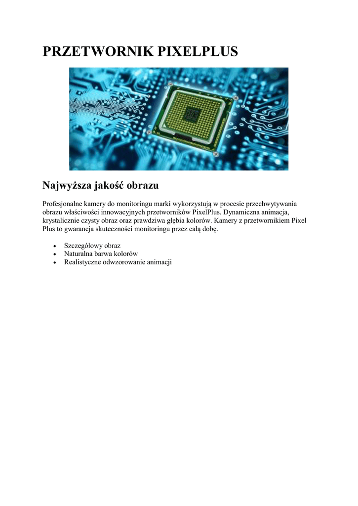 PRZETWORNIK PIXELPLUS Najwyższa jakość obrazu Profesjonalne kamery do monitoringu marki wykorzystują w procesie przechwytywania obrazu właściwości innowacyjnych przetworników PixelPlus. Dynamiczna animacja, krystalicznie czysty obraz oraz prawdziwa głębia kolorów. Kamery z przetwornikiem Pixel Plus to gwarancja skuteczności monitoringu przez całą dobę. • • • Szczegółowy obraz Naturalna barwa kolorów Realistyczne odwzorowanie animacji