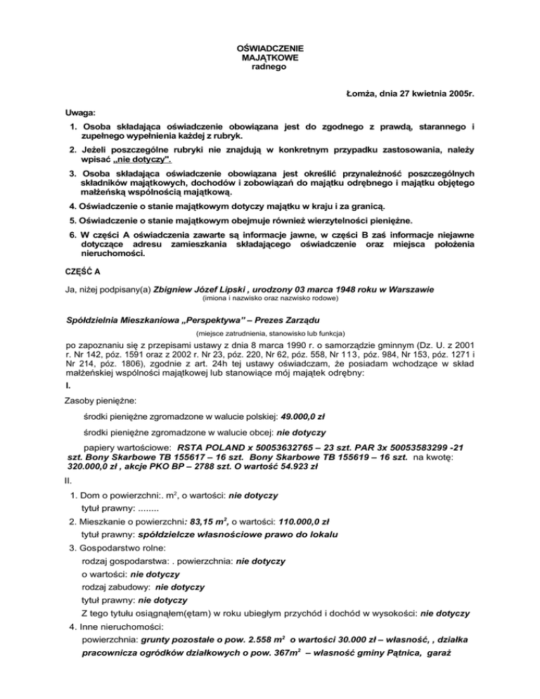 OŚWIADCZENIE MAJĄTKOWE radnego Łomża, dnia 27 kwietnia 2005r. Uwaga: 1. Osoba składająca oświadczenie obowiązana jest do zgodnego z prawdą, starannego i zupełnego wypełnienia każdej z rubryk. 2. Jeżeli poszczególne rubryki nie znajdują w konkretnym przypadku zastosowania, należy wpisać „nie dotyczy". 3. Osoba składająca oświadczenie obowiązana jest określić przynależność poszczególnych składników majątkowych, dochodów i zobowiązań do majątku odrębnego i majątku objętego małżeńską wspólnością majątkową. 4. Oświadczenie o stanie majątkowym dotyczy majątku w kraju i za granicą. 5. Oświadczenie o stanie majątkowym obejmuje również wierzytelności pieniężne. 6. W części A oświadczenia zawarte są informacje jawne, w części B zaś informacje niejawne dotyczące adresu zamieszkania składającego oświadczenie oraz miejsca położenia nieruchomości. CZĘŚĆ A Ja, niżej podpisany(a) Zbigniew Józef Lipski , urodzony 03 marca 1948 roku w Warszawie (imiona i nazwisko oraz nazwisko rodowe) Spółdzielnia Mieszkaniowa „Perspektywa” – Prezes Zarządu (miejsce zatrudnienia, stanowisko lub funkcja) po zapoznaniu się z przepisami ustawy z dnia 8 marca 1990 r. o samorządzie gminnym (Dz. U. z 2001 r. Nr 142, póz. 1591 oraz z 2002 r. Nr 23, póz. 220, Nr 62, póz. 558, Nr 113, póz. 984, Nr 153, póz. 1271 i Nr 214, póz. 1806), zgodnie z art. 24h tej ustawy oświadczam, że posiadam wchodzące w skład małżeńskiej wspólności majątkowej lub stanowiące mój majątek odrębny: I. Zasoby pieniężne: środki pieniężne zgromadzone w walucie polskiej: 49.000,0 zł środki pieniężne zgromadzone w walucie obcej: nie dotyczy papiery wartościowe: RSTA POLAND x 50053632765 – 23 szt. PAR 3x 50053583299 -21 szt. Bony Skarbowe TB 155617 – 16 szt. Bony Skarbowe TB 155619 – 16 szt. na kwotę: 320.000,0 zł , akcje PKO BP – 2788 szt. O wartość 54.923 zł II. 1. Dom o powierzchni:. m2, o wartości: nie dotyczy tytuł prawny: ........ 2. Mieszkanie o powierzchni: 83,15 m2, o wartości: 110.000,0 zł tytuł prawny: spółdzielcze własnościowe prawo do lokalu 3. Gospodarstwo rolne: rodzaj gospodarstwa: . powierzchnia: nie dotyczy o wartości: nie dotyczy rodzaj zabudowy: nie dotyczy tytuł prawny: nie dotyczy Z tego tytułu osiągnąłem(ętam) w roku ubiegłym przychód i dochód w wysokości: nie dotyczy 4. Inne nieruchomości: powierzchnia: grunty pozostałe o pow. 2.558 m2 o wartości 30.000 zł – własność, , działka pracownicza ogródków działkowych o pow. 367m2 – własność gminy Pątnica, garaż samochodowy szt. 2 tytuł prawny: wszystkie nieruchomości współwłasność III. 1. Posiadam udziały w spółkach handlowych z udziałem gminnych osób prawnych lub przedsiębiorców, w któ- rych uczestniczą takie osoby — należy podać liczbę i emitenta udziałów: nie dotyczy udziały te stanowią pakiet większy niż 10% udziałów w spółce: nie dotyczy. Z tego tytułu osiągnąłem(ęłam) w roku ubiegłym dochód w wysokości: nie dotyczy 2. Posiadam udziały w innych spółkach handlowych — należy podać liczbę nie dotyczy IV. 1. Posiadam akcje w spółkach handlowych z udziałem gminnych osób prawnych lub przedsiębiorców, w których uczestniczą takie osoby — należy podać liczbę i emitenta akcji: akcje te stanowią pakiet większy niż 10% akcji w spółce: nie dotyczy Z tego tytułu osiągnątem(ętam) w roku ubiegłym dochód w wysokości: nie dotyczy 2. Posiadam akcje w innych spółkach handlowych — należy podać liczbę i emitenta akcji: nie dotyczy Z tego tytułu osiągnątem(ętam) w roku ubiegłym dochód w wysokości: nie dotyczy V. Nabytem(am) (nabył mój małżonek, z wyłączeniem mienia przynależnego do jego majątku odrębnego) od Skarbu Państwa, innej państwowej osoby prawnej, jednostek samorządu terytorialnego, ich związków lub od komunalnej osoby prawnej następujące mienie, które podlegało zbyciu w drodze przetargu — należy podać opis mienia i datę nabycia, od kogo: nie dotyczy VI. 1.Prowadzę działalność gospodarczą (należy podać formę prawną i przedmiot działalności): nie dotyczy — osobiście nie dotyczy — wspólnie z innymi osobami nie dotyczy Z tego tytułu osiągnątem(ęłam) w roku ubiegłym przychód i dochód w wysokości: nie dotyczy 2. Zarządzam działalnością gospodarczą lub jestem przedstawicielem pełnomocnikiem takiej działalności (należy podać formę prawną i przedmiot działalności: — osobiście nie dotyczy — wspólnie z innymi osobami nie dotyczy Z tego tytułu osiągnąłem(ętam) w roku ubiegłym dochód w wysokości: nie dotyczy VII. W spółkach handlowych (nazwa, siedziba spółki): nie dotyczy .— jestem członkiem zarządu (od kiedy): nie dotyczy — jestem członkiem rady nadzorczej (od kiedy): nie dotyczy — jestem członkiem komisji rewizyjnej (od kiedy): nie dotyczy Z tego tytułu osiągnąłem(łam) w roku ubiegłym dochód w wysokości:. VIII. Inne dochody osiągane z tytułu zatrudnienia lub innej działalności zarobkowej lub zajęć, z podaniem kwot uzyskiwanych z każdego tytułu; dieta radnego – 7.913,43 zł IX. Składniki mienia ruchomego o wartości powyżej 10 000 złotych (w przypadku pojazdów mechanicznych należy podać markę, model i rok produkcji): VOLVO S 40 – 2002 rok – wartość 55.000,0 zł X. Zobowiązania pieniężne o wartości powyżej 10 000 złotych, w tym zaciągnięte kredyty i pożyczki oraz warunki, na jakich zostały udzielone (wobec kogo, w związku z jakim zdarzeniem, w jakiej wysokości): nie dotyczy