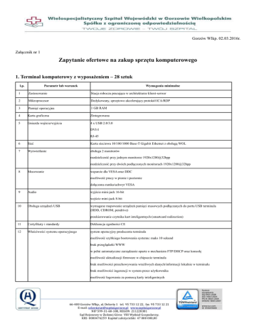 Gorzów Wlkp. 02.03.2016r. Załącznik nr 1 Zapytanie ofertowe na zakup sprzętu komputerowego 1. Terminal komputerowy z wyposażeniem – 28 sztuk l.p. Parametr lub warunek Wymagania minimalne 1 Zastosowanie Stacja robocza pracująca w architekturze klient-serwer 2 Mikroprocesor Dedykowany, sprzętowo akcelerujący protokół ICA/RDP 3 Pamięć operacyjna 1 GB RAM 4 Karta graficzna Zintegrowana 5 Gniazda wejścia/wyjścia 4 x USB 2.0/3.0 DVI-I RJ-45 6 Sieć Karta sieciowa 10/100/1000 Base-T Gigabit Ethernet z obsługą WOL 7 Wyświetlanie obsługa 2 monitorów rozdzielczość przy jednym monitorze 1920x1200@32bpp rozdzielczość przy dwóch podłączonych monitorach 1920x1200@32bpp 8 Mocowanie wsparcie dla VESA oraz DDC możliwość pracy w pionie i poziomie dołączona ramka/uchwyt VESA 9 wyjście mini-jack 16-bit Audio wejście mini-jack 8-bit 10 Obsługa urządzeń USB wymagane mapowanie urządzeń pamięci masowych podłączanych do portu USB terminala (HDD, CDROM, pendrive) przekierowanie czytnika kart inteligentnych (smartcard redirection) 11 Certyfikaty i standardy Deklaracja zgodności CE 12 Właściwości systemu operacyjnego system operacyjny producenta terminala możliwość szybkiego bootowania systemu: maks 10 sekund brak przeglądarki WWW w pełni automatyczne zarządzanie oparte o mechanizm FTP/DHCP oraz konsolę możliwość aktualizacji firmware w chipsecie terminala brak możliwości przechowywania wrażliwych danych/informacji lokalnie w terminalu brak możliwości ingerencji w system przez użytkownika możliwość logowania za pomocą karty inteligentnych 66-400 Gorzów Wlkp., ul. Dekerta 1 tel. 95 733 12 22, fax 95 733 12 21 E-mail: [email protected] www.szpital.gorzow.pl NIP 599-31-68-108, REGON 211228381 Sąd Rejonowy w Zielonej Górze VIII Wydział Gospodarczy, KRS 0000476259 Kapitał założycielski 47 000 000,00 l.p. 13 Parametr lub warunek Wymagania minimalne Zasilacz uniwersalny z autodetekcją napięcia wejściowego 100240 VAC, 50/60 Hz. Zasilanie Kompatybilność zasilacza z normą Energy Star V.5.0 maksymalny pobór mocy < 8W Zarządzanie 14 W cenie licencja na oprogramowanie do zarządzania umożliwiające: - obsługę min. 500 terminali - inwentaryzację, konfigurację i upgrade/downgrade firmware terminala - Zdalne zarządzanie zasilaniem terminala (WOL/off/restart) - Zdalna konsola (VNC) - wysyłanie informacji i powiadomień do terminali - resetowanie do ustawień fabrycznych - zdalne zarządzanie politykami mapowania USB w terminalach - możliwość jednoczesnego flashowania wielu terminali 15 Szerokość maksymalna: 180mm Wymiary Głębokość maksymalna: 120mm Wysokość maksymalna: 25mm 16 Waga < 0,5kg 17 Wyposażenie w zestawie uchwyt zgodny ze standardem VESA oraz śruby montażowe zasilacz oraz kabel zasilający klawiatura USB w układzie QWERTY z wbudowanym czytnikiem SmartCard mysz komputerowa optyczna USB konwerter DVI-VGA (DB-15) kabel sieciowy (patchcord) UTP cat. 5e – 3m 18 3 lata gwarancji z serwisem w miejscu instalacji sprzętu Gwarancja 2. Monitor LCD – 28 sztuk l.p. Parametr lub warunek Wymagania minimalne 1 Format ekranu monitora Panoramiczny 2 Przekątna ekranu 21,5” 3 Technologia podświetlenia LED 4 Czas reakcji matrycy 5 ms 5 Matryca typu glare (błyszcząca) Nie 6 Jasność 250 cd/m2 7 Kąt widzenia poziomy 160 stopni 8 Kąt widzenia pionowy 160 stopni 9 Liczba wyświetlanych kolorów 16,7 mln 10 Certyfikaty Deklaracja zgodności CE Energy Star 11 Regulacja cyfrowa Tak 12 Złącza wejściowe DVI 13 Wbudowany zasilacz Tak 14 Pobór mocy w czasie pracy <20W l.p. Parametr lub warunek Wymagania minimalne 15 Możliwość pochylenia panela Tak 16 Montaż na ścianie (VESA) Tak 17 Gwarancja 3 lata gwarancji 3. Licencje dostępowe do serwera terminali – 28 sztuk l.p. Parametr lub warunek Wymagania minimalne 1 Licencja terminalowa do połączenia z serwerem terminali Licencja umożliwiająca dostęp do usług pulpitu zdalnego serwera terminali zamawiającego, opartego o system Windows 2012 Server 2 Sposób licencjonowania urządzenie 4. Karta inteligentna z modułem Mifare– 100 sztuk l.p. Parametr lub warunek Wymagania minimalne 1 Zgodność z infrastrukturą zamawiającego Karta musi prawidłowo pracować z zaproponowanym terminalem oraz czytnikiem umieszczonym w klawiaturze terminala. Ponadto karta musi umożliwiać integrację z PKI Zamawiającego opartym na Windows Server 2012 R2 umożliwiając wgrywanie certyfikatów oraz uwierzytelnianie do systemu Windows 7 (32/64b) oraz usług terminalowych (RDP) opartych o Windows Server 2012 R2. Zamawiający wymaga współpracy kart z farmą min. 2 serwerów terminalowych zarządzanych przez brokera sesji terminalowych 2 Typ karty Karta dualna lub hybrydowa (z mikroprocesorem oraz modułem transmisji bezdotykowej Mifare Standard 1K) 3 Przechowywane informacje Karta musi umożliwiać przechowywanie kluczy szyfrujących, cyfrowych certyfikatów standardu X.509 oraz innych danych kryptograficznych 4 Wykorzystywane algorytmy Karta musi umożliwiać generację kluczy i sygnatur z wykorzystaniem algorytmów: RSA 1024 oraz 2048-bity, DES, 3DES oraz SHA1 5 Poziom bezpieczeństwa Poziom bezpieczeństwa urządzenia potwierdzony certyfikatem FIPS 140-2 jak również Common Criteria EAL4+ PP-SSCD. Dla mikrokontrolera (smart cad chip) także Common Criteria EAL4+. 6 Wspierane standardy Karta musi wspierać standardy i API: PKCS#11 v2.01, Microsoft CAPI, PC/SC, X.509 v3 dla obsługi standardów SSL v3, IPSec/IKE 7 Zgodność z normą Karta musi być zgodna ze specyfikacją ISO 7816-1 do 4 8 Szyfrowanie Karta musi zapewniać szyfrowanie danych uniemożliwiające odczyt w przypadku kradzieży 9 Uwierzytelnianie Karta musi zapewniać silne uwierzytelnianie użytkowników oraz łatwą integrację w architekturze Public Key Infrastructure (PKI) 10 Trwałość Gwarantowana ilość zapisów/odczytów pamięci karty – co najmniej 500000 Czas przechowywania danych w pamięci urządzenia – co najmniej 
