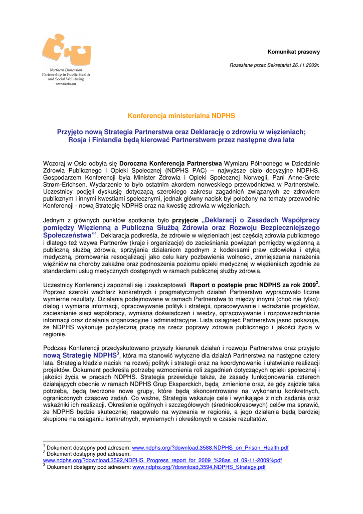 Komunikat prasowy Rozesłane przez Sekretariat 26.11.2009r. Konferencja ministerialna NDPHS Przyjęto nową Strategia Partnerstwa oraz Deklarację o zdrowiu w więzieniach; Rosja i Finlandia będą kierować Partnerstwem przez następne dwa lata Wczoraj w Oslo odbyła się Doroczna Konferencja Partnerstwa Wymiaru Północnego w Dziedzinie Zdrowia Publicznego i Opieki Społecznej (NDPHS PAC) – najwyższe ciało decyzyjne NDPHS. Gospodarzem Konferencji była Minister Zdrowia i Opieki Społecznej Norwegii, Pani Anne-Grete Strøm-Erichsen. Wydarzenie to było ostatnim akordem norweskiego przewodnictwa w Partnerstwie. Uczestnicy podjęli dyskusję dotyczącą szerokiego zakresu zagadnień związanych ze zdrowiem publicznym i innymi kwestiami społecznymi, jednak główny nacisk był położony na tematy przewodnie Konferencji - nową Strategię NDPHS oraz na kwestię zdrowia w więzieniach. Jednym z głównych punktów spotkania było przyjęcie „Deklaracji o Zasadach Współpracy pomiędzy Więzienną a Publiczna Służbą Zdrowia oraz Rozwoju Bezpieczniejszego Społeczeństwa”1. Deklaracja podkreśla, że zdrowie w więzieniach jest częścią zdrowia publicznego i dlatego też wzywa Partnerów (kraje i organizacje) do zacieśniania powiązań pomiędzy więzienną a publiczną służbą zdrowia, sprzyjania działaniom zgodnym z kodeksami praw człowieka i etyką medyczną, promowania resocjalizacji jako celu kary pozbawienia wolności, zmniejszania narażenia więźniów na choroby zakaźne oraz podnoszenia poziomu opieki medycznej w więzieniach zgodnie ze standardami usług medycznych dostępnych w ramach publicznej służby zdrowia. 2 Uczestnicy Konferencji zapoznali się i zaakceptowali Raport o postępie prac NDPHS za rok 2009 . Poprzez szeroki wachlarz konkretnych i pragmatycznych działań Partnerstwo wypracowało liczne wymierne rezultaty. Działania podejmowane w ramach Partnerstwa to między innymi (choć nie tylko): dialog i wymiana informacji, opracowywanie polityk i strategii, opracowywanie i wdrażanie projektów, zacieśnianie sieci współpracy, wymiana doświadczeń i wiedzy, opracowywanie i rozpowszechnianie informacji oraz działania organizacyjne i administracyjne. Lista osiągnięć Partnerstwa jasno pokazuje, że NDPHS wykonuje pożyteczną pracę na rzecz poprawy zdrowia publicznego i jakości życia w regionie. Podczas Konferencji przedyskutowano przyszły kierunek działań i rozwoju Partnerstwa oraz przyjęto nową Strategię NDPHS3, która ma stanowić wytyczne dla działań Partnerstwa na następne cztery lata. Strategia kładzie nacisk na rozwój polityk i strategii oraz na koordynowanie i ułatwianie realizacji projektów. Dokument podkreśla potrzebę wzmocnienia roli zagadnień dotyczących opieki społecznej i jakości życia w pracach NDPHS. Strategia przewiduje także, że zasady funkcjonowania czterech działających obecnie w ramach NDPHS Grup Eksperckich, będą zmienione oraz, że gdy zajdzie taka potrzeba, będą tworzone nowe grupy, które będą skoncentrowane na wykonaniu konkretnych, ograniczonych czasowo zadań. Co ważne, Strategia wskazuje cele i wynikające z nich zadania oraz wskaźniki ich realizacji. Określenie ogólnych i szczegółowych (średniookresowych) celów ma sprawić, że NDPHS będzie skuteczniej reagowało na wyzwania w regionie, a jego działania będą bardziej skupione na osiąganiu konkretnych, wymiernych i określonych w czasie rezultatów. 1 Dokument dostępny pod adresem: www.ndphs.org/?download,3588,NDPHS_on_Prison_Health.pdf Dokument dostępny pod adresem: www.ndphs.org/?download,3592,NDPHS_Progress_report_for_2009_%28as_of_09-11-2009%pdf 3 Dokument dostępny pod adresem: www.ndphs.org/?download,3594,NDPHS_Strategy.pdf 2 Podkreślając znaczenie wysiłków Partnerstwa na rzecz skutecznej realizacji nowej Strategii, PAC 4 przyjęła Plan Pracy NDPHS na rok 2010 . Na koniec, dziękując Norwegii za przewodniczenie Partnerstwu podczas ubiegłych dwóch lat, PAC wybrała Rosję na Przewodniczącego oraz Finlandię na Współprzewodniczącego Partnerstwa na nadchodzące dwa lata. Rosja pełniła, pod przewodnictwem Norwegii, funkcję współprzewodniczącego NDPHS w ciągu ubiegłych dwóch lat. Rząd Norwegii wysoko ceni współpracę w regionie dalekiej północy. Każdego roku przeznaczamy znaczne środki na rozwój i wzmacnianie współpracy w zakresie zdrowia pomiędzy Norwegią a Północno-Zachodnią Rosją. Ważne jest, że nasze stosunki z Federacją Rosyjską na szczeblu federalnym również są dobre, do czego przyczynił się także okres wspólnego przewodnictwa w NDPHS, powiedziała Minister Strøm-Erichsen. Bardzo doceniam, że Rosja przejmuje teraz przewodnictwo w Partnerstwie oraz, że pokazuje znaczenie Partnerstwa tworzącego istotne ramy dla współpracy w zakresie zdrowia pomiędzy UE i państwami sąsiednimi. Wystąpienie Przewodniczącej NDPHS, podsumowujące krótko wynik Konferencji, jest dostępne na 5 stronie internetowej NDPHS . NDPHS to… NDPHS jest formą współpracy trzynastu rządów, Komisji Europejskiej oraz ośmiu międzynarodowych organizacji. Stanowi forum dla konkretnych działań podejmowanych wobec wyzwań stojących przed systemami opieki społecznej i zdrowotnej na obszarze Wymiaru Północnego. Misją Partnerstwa jest promowanie zrównoważonego rozwoju regionu poprzez podejmowanie działań na rzecz poprawy zdrowia i jakości życia mieszkańców. Partnerstwo chce przyczynić się do tego poprzez wzmacnianie współpracy, wspieranie Partnerów w budowaniu ich zdolności instytucjonalnej oraz zapewnianie koordynacji pomiędzy działaniami podejmowanymi w regionie. Odwiedź naszą stronę www.ndphs.org aby być na bieżąco z prowadzonymi działaniami oraz poznać świat NDPHS - partnerstwa zaangażowanego w osiąganie widocznych rezultatów! Zachęcamy również do zapoznania się z ulotką NDPHS, dostępną w kilki wersjach językowych na stronie www.ndphs.org/?leaflet. 