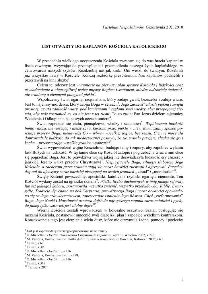 Pustelnia Niepokalanów, Grzechynia 2 XI 2010 LIST OTWARTY DO KAPŁANÓW KOŚCIOŁA KATOLICKIEGO W przededniu wielkiego oczyszczenia Kościoła zwracam się do was bracia kapłani w liście otwartym, wzywając do przemyślenia i przemodlenia naszego życia kapłańskiego, w celu zwarcia naszych szyków. Rozdziobią nas jak kruki. Oni weszli do świątyni. Rozebrali już wszystkie nawy w Kościele. Kończą rozbiórkę prezbiterium. Nas kapłanów podzielili i przestawili na inną służbę1. Celem tej odezwy jest wysunięcie na pierwszy plan sprawy Kościoła i ludzkości oraz uświadomienie o nieustępliwej walce między Bogiem i szatanem, między ludzkością śmiertelnie zranioną a ciemnymi potęgami piekła2. Współczesny świat ogarnął racjonalizm, który zadaje gwałt, bezcześci i zabija wiarę. Jest to najemny morderca, który zabija Boga w sercach 3. Jego „uczeni” zdusili piękną i świętą prostotę, czystą zdolność wiary, pod kamieniami i cegłami swej wiedzy, zbyt przepojonej ziemią, aby móc zrozumieć to, co nie jest z tej ziemi. To co zasiał Pan Jezus dziełem tajemnicy Wcielenia i Odkupienia na naszych oczach umiera4. Świat zaprzedał się ciału, pieniądzowi, władzy i szatanowi5. Współczesna ludzkość buntownicza, niewierzącą i ateistyczna, kuszona przez piekło w niewytłumaczalny sposób powstaje przeciw Bogu; nienawidzi Go – wbrew wszelkiej logice, bez sensu. Ciemne moce zła doprowadziły ludzkość do tak niedorzecznej postawy, że zło zostało przyjęte, słucha się go i kocha – przekraczając wszelkie granice wyobraźni6. Świat wypowiedział wojnę Kościołowi, budując tamy i zapory, aby zapobiec wylaniu łask Bożych na ludzkość. W tej tamie chce się Kościół zatopić i pogrzebać, a wraz z nim chce się pogrzebać Boga. Jest to prawdziwa wojna jakiej nie doświadczyła ludzkość ery chrześcijańskiej. Jest to walka przeciw Chrystusowi7. Nieprzyjaciele Boga, silniejsi słabością Jego Kościoła, a zachęcani przez szatana stają się coraz bardziej zuchwali i agresywni. Przechodzą oni do ofensywy coraz bardziej niszczącej na dwóch frontach „zasad” i „moralności”8. Święty Kościół powszechny, apostolski, katolicki i rzymski ogarnęła ciemność. Ten Kościół wydany został na igraszkę szatana9. Wielka liczba duchownych w imię jakiejś reformy lub też jakiegoś Soboru, postanowiła wszystko zmienić, wszystko przebudować: Biblię, Ewangelię, Tradycję. Spychano na bok Chrystusa, prawdziwego Boga i coraz otwarciej opowiadano się za Jego człowieczeństwem, zaprzeczając istnieniu Jego Bóstwa. Chęć „zreformowania” Boga, Jego Nauki i Moralności oznacza dojść do najwyższego stopnia zarozumiałości i pychy do jakiej tylko człowiek jest zdolny dojść10. Wierni Kościoła zostali wprowadzeni w kolosalne oszustwo. Szatan posługując się mężami Kościoła, postanowił umocnić swój diabelski plan i zapobiec wszelkim kontratakom. Konsekwencją tego jest cierpienie wielu dusz, które nie otrzymują żadnej pomocy i pociechy 1 List jest zapowiedzią szerszego opracowania na te tematy. O. Michellini, Orędzia Pana Jezusa Chrystusa do kapłanów, wyd. II, Wrocław 2002, s.296. 3 M. Valtorta, Koniec czasów. Walka dobra ze złem u progu wiosny Kościoła, Katowice 2005, s.63. 4 Tamże, s.62. 5 Tamże, s.39. 6 O. Michellini, Orędzia…, s.316. 7 M. Valtorta, Koniec czasów…, s.278. 8 O. Michellini, Orędzia…, s.316. 9 Tamże, s.317. 10 Tamże, s.297. 2 1 od tych, którzy powinni być ich opiekunami i obrońcami. W wyniku tego cały świat ludzki został oszukany i wolą Boga jest, aby ta prawda została ludziom ujawniona. Jest to paradoksalny i okropny spisek przeciwko Kościołowi i narodom11. Skutkiem tego jest pojawienie się wielkiej herezji, najwyższego świętokradztwa, sam szatan ogłasza tę nową wiarę12. Rozpoczął się kataklizm13. W zbliżającym się kielichu goryczy jest wiele bólu 14. Dyplomacja pasterzy Kościoła, która poszła w zawody ze świecką dyplomacją, osiągnęła wyżyny kłamstwa i fałszu15, a Kościół dzisiejszy uległ hipnozie16. Aż trudno zrozumieć, że osoby Bogu poświęcone potrafiły Kościół wyprowadzić poza swoją oś naturalną. Pycha, pycha mniej lub więcej ukryta sprowadziła tą ciemność otaczającą cały Kościół. Pasterze Kościoła w wielu przypadkach nie wierzą i sądzą wszystko po ludzku17. Kościół ogarnął kryzys, który sięga Jego podstaw i Jego szczytów hierarchicznych18. W czasach, kiedy zuchwałość piekła się zwiększa, ci co powinni bronić Kościoła, nie wysilają się podobnie19. Nadeszła już chwila, aby zwołać pospolite ruszenie w Kościele dla pomocy tym, którzy z niesłychanym poświęceniem i bohaterstwem pracują w pierwszych szeregach dla rozszerzania Królestwa Bożego na ziemi20. W tych pierwszych szeregach powinni być kapłani, od których Pan Jezus żąda większego udziału w Jego Odkupieniu, by działali z Nim w Eucharystii i by lepiej poznali swoją rolę w Jego mistycznym Ciele. Ponadto wymaga od kapłanów pełnego zjednoczenia ich cierpienia z Jego Męką. To kapłanom Bóg powierzył dar Eucharystii, uczynił ich Jego opiekunami na ziemi. Powierzył posłannictwo głoszenia Słowa, udzielił władzy zwalczania ciemnych, piekielnych mocy i uzdrawiania chorych. To kapłan jest pełnomocnikiem i ambasadorem Boga na ziemi. Jest inicjatorem wszelkich większych zajść i wydarzeń nadprzyrodzonych w Kościele Chrystusowym. Jest hostią ofiarną za zbawienie wiernych, a zarazem ma być sługą21. Kapłan jest drugim Chrystusem i cały należy do Niego. Na nim spoczywa ogromna odpowiedzialność za zbawienie świata22. Kapłan zły równa się diabłu, który ciągnie dusze ku zgubie: popełnia bogobójstwo i zabójstwo. Kapłan oziębły jest jak ciernisty krzak w ziemi suchej i bezpłodnej. Kapłan dobry czyni trochę dobra. Kapłan gorliwy jest jak płomyk, który oświeca, ogrzewa i ocz
