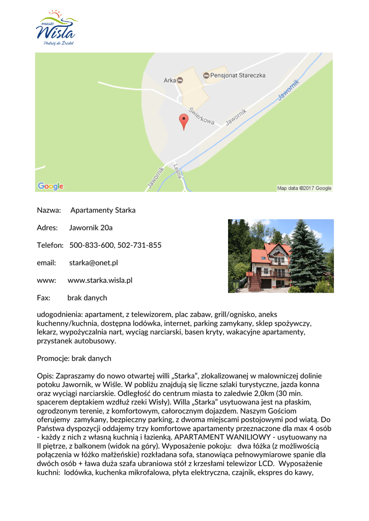 Nazwa: Apartamenty Starka Adres: Jawornik 20a Telefon: 500-833-600, 502-731-855 email: [email protected] www: www.starka.wisla.pl Fax: brak danych udogodnienia: apartament, z telewizorem, plac zabaw, grill/ognisko, aneks kuchenny/kuchnia, dostępna lodówka, internet, parking zamykany, sklep spożywczy, lekarz, wypożyczalnia nart, wyciąg narciarski, basen kryty, wakacyjne apartamenty, przystanek autobusowy. Promocje: brak danych Opis: Zapraszamy do nowo otwartej willi „Starka”, zlokalizowanej w malowniczej dolinie potoku Jawornik, w Wiśle. W pobliżu znajdują się liczne szlaki turystyczne, jazda konna oraz wyciągi narciarskie. Odległość do centrum miasta to zaledwie 2,0km (30 min. spacerem deptakiem wzdłuż rzeki Wisły). Willa „Starka” usytuowana jest na płaskim, ogrodzonym terenie, z komfortowym, całorocznym dojazdem. Naszym Gościom oferujemy zamykany, bezpieczny parking, z dwoma miejscami postojowymi pod wiatą. Do Państwa dyspozycji oddajemy trzy komfortowe apartamenty przeznaczone dla max 4 osób - każdy z nich z własną kuchnią i łazienką. APARTAMENT WANILIOWY - usytuowany na II piętrze, z balkonem (widok na góry). Wyposażenie pokoju: dwa łóżka (z możliwością połączenia w łóżko małżeńskie) rozkładana sofa, stanowiąca pełnowymiarowe spanie dla dwóch osób + ława duża szafa ubraniowa stół z krzesłami telewizor LCD. Wyposażenie kuchni: lodówka, kuchenka mikrofalowa, płyta elektryczna, czajnik, ekspres do kawy, toster, garnki, komplet naczyń) garderoba. Łazienka z prysznicem (na wyposażeniu: ręczniki, kosmetyki hotelowe). Na balkonie: stolik kawowy + krzesła. APARTAMENT CYNAMONOWY - usytuowany na II piętrze, z dużymi oknami dachowymi (widok na góry, z drugiej strony na las) Wyposażenie pokoju: dwa łóżka (z możliwością połączenia w łóżko małżeńskie) rozkładana sofa, stanowiąca pełnowymiarowe spanie dla dwóch osób + ława duża szafa ubraniowa telewizor LCD. Wyposażenie kuchni: lodówka, kuchenka mikrofalowa, płyta elektryczna, czajnik, ekspres do kawy, toster, garnki, komplet naczyń) stół z krzesłami wieszak na odzież wierzchnią. Łazienka z prysznicem (na wyposażeniu: ręczniki, kosmetyki hotelowe). APARTAMENT CZEKOLADOWY - usytuowany na parterze, z bezpośrednim wyjściem do ogrodu. Wyposażenie pokoju: dwa łóżka (z możliwością połączenia w łóżko małżeńskie) rozkładana sofa, stanowiąca pełnowymiarowe spanie dla dwóch osób + ława duża szafa ubraniowa stół z krzesłami telewizor LCD. Wyposażenie kuchni: lodówka, kuchenka mikrofalowa, płyta elektryczna, czajnik, toster, garnki, komplet naczyń) wieszak na odzież wierzchnią. Łazienka z prysznicem, z głębokim brodzikiem, wygodnym dla małych dzieci (na wyposażeniu: ręczniki, kosmetyki hotelowe). Na zewnątrz (przy wyjściu z apartamentu): stolik + krzesła ogrodowe. W ogrodzie przygotowaliśmy dla Państwa meble ogrodowe, możliwość korzystania z grilla oraz dla naszych najmłodszych gości – plac zabaw z huśtawkami, zjeżdżalnią i piaskownicą. Zapraszamy również do naszego komfortowego, stylowego pensjonatu „Stareczka” z bali drewnianych www.stareczka.pl