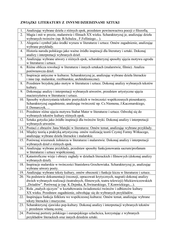ZWIĄZKI LITERATURY Z INNYMI DZIEDZINAMI SZTUKI 1. 2. 3. 4. 5. 6. 7. 8. 9. 10. 11. 12. 13. 14. 15. 16. 17. 18. 19. 20. 21. 22. 23. 24. Analizując wybrane dzieła z różnych epok, przedstaw powinowactwa poezji z filozofią. Magia i mit w prozie, malarstwie i filmach XX wieku. Scharakteryzuj je, analizując dzieła wybranych twórców (np. B.Schulza , F.Felliniego... ). Alegoria i symbol jako środki wyrazu w literaturze i sztuce. Omów zagadnienie, analizując wybrane przykłady. Historia narodu polskiego jako ważne źródło inspiracji dla literatury i sztuki. Dokonaj analizy i interpretacji wybranych dzieł. Analizując wybrane utwory z różnych epok, scharakteryzuj sposoby ujęcia motywu ogrodu w literaturze i sztuce. Różne oblicza rewolucji w literaturze i innych sztukach (malarstwie, filmie). Analiza porównawcza dzieł. Inspiracje antyczne w kulturze. Scharakteryzuj je, analizując wybrane dzieła literackie i inne (np. malarskie, rzeźbiarskie, architektoniczne). Przedstaw brzydotę jako motyw w literaturze i sztuce. Dokonaj analizy wybranych tekstów kultury. Dokonując analizy i interpretacji wybranych utworów, przedstaw artystyczne ujęcia macierzyństwa w literaturze i sztuce. Sposoby wykorzystania tekstów poetyckich w twórczości współczesnych piosenkarzy. Scharakteryzuj zagadnienie, analizując twórczość np. Cz.Niemena, J.Kaczmarskiego, E.Demarczyk, ... Przedstaw różne ujęcia motywu Stabat Mater w literaturze i sztuce. Odwołaj się do wybranych tekstów kultury różnych epok. Sztuka gotycka jako źródło inspiracji dla twórców liryki. Dokonaj analizy i interpretacji wybranych utworów. Postaci z obrazów Jana Matejki w literaturze. Omów temat, analizując wybrane przykłady. Między teorią a praktyką artystyczną- omów realizację teorii Czystej Formy Witkacego, analizując wybrane dzieła literackie i malarskie. Porównaj wizerunek żołnierza w literaturze i malarstwie. Dokonaj analizy i interpretacji wybranych dzieł z różnych epok. Analizując wybrane przykłady, przedstaw sposoby funkcjonowania sacrum/profanum w literaturze i sztuce współczesnej. Katastroficzne wizje i obrazy zagłady w dziełach literackich i filmowych (dokonaj analizy wybranych dzieł). Inspiracje malarskie w twórczości Stanisława Grochowiaka. Scharakteryzuj je, analizując wybrane utwory poety. Analizując wybrane teksty kultury, omów obecność i funkcje kiczu w literaturze i sztuce. Na podstawie dokumentacji (recenzji, opracowań krytycznych, nagrań) dokonaj analizy dwóch wybranych realizacji (teatralnych, filmowych, teatru telewizji) Mickiewiczowskich „Dziadów”. Porównaj je (np. K.Dejmka, K.Swinarskiego, T.Konwickiego,...). Rola „małych ojczyzn” w kształtowaniu świadomości twórców i odbiorców kultury XX wieku. Przedstaw zagadnienie, odwołując się do wybranych przykładów. Inspirująca funkcja folkloru we współczesnej kulturze. Omów temat, analizując wybrane teksty literackie i muzyczne. Scharakteryzuj zjawisko pop-kultury. Dokonaj analizy i interpretacji wybranych tekstów i przedstaw własną ocenę. Porównaj portrety polskiego i europejskiego szlachcica, korzystając z wybranych przykładów literackich oraz innych dziedzin sztuki. 25. Scharakteryzuj sposoby kreacji i omów role postaci błazna w kulturze. Dokonaj analizy i interpretacji wybranych tekstów. 26. Symbolika stroju. Omów temat, analizując wybrane dzieła literackie i inne (malarskie, rzeźbiarskie, filmowe i teatralne). 27. Na przykładzie trzech wybranych utworów literackich przedstaw, w jaki sposób malarstwo impresjonistyczne wpłynęło na literaturę polską. 28. Odwołując się do wybranych przykładów literackich i filmowych, przedstaw wpływ rodziny na kształtowanie się charakterów i postaw życiowych bohaterów. 29. Dokonując analizy wybranych tekstów kultury, przedstaw różne ujęcia motywu stworzenia świata w literaturze i sztuce. 30. Prywatne koncepcje docierania do wolności w filozofii, literaturze i filmie. Omów temat, odwołując się do wybranych utworów. 31. Różnorodność ujęć motywu powrotu w literaturze i filmie. Omów temat, analizując wybrane dzieła. 32. Analizując wybrane teksty kultury, przedstaw funkcjonowanie motywu snu w literaturze i filmie. 33. Postawa narcystyczna w literaturze i sztuce. Przedstaw temat, analizując wybrane teksty kultury. 34. Zbigniew Herbert i Krzysztof Kieślowski jako twórcy dekalogu człowieka czasów zagrożenia. Omów podobieństwa i różnice, dokonaj analizy i interpretacji wybranych dzieł obu artystów. 35. Odwołując się do wybranych tekstów kultury, przedstaw funkcjonowanie motywu wędrówki w literaturze i filmie. 36. Różne spojrzenia na nowoczesne miasto Paryż w literaturze i malarstwie doby realizmu. Dokonaj analizy porównawczej wybranych dzieł. 37. Rola tytułu w literaturze i filmie. Omów temat, odwołując się do wybranych przykładów. 38. Odwołując się do wybranych tekstów kultury, przedstaw funkcjonowanie motywu przemijania w literaturze i sztuce XIX wieku. 39. Różne ujęcia motywu Sądu Ostatecznego w literaturze i sztuce. Przedstaw na wybranych przykładach. 40. Uprzedmiotowienie człowieka jako problem w literaturze i sztuce (np.T.Kantor, A.Wróblewski, T.Różewicz). Omówienie i interpretacja zjawiska na wybranych przykładach. 41. Aluzje literackie we współczesnej kulturze masowej. Omów problem, posługując się przykładami literackimi, filmowymi, reklamowymi, plastycznymi. 42. Różnorodne funkcje zwierząt w literaturze i malarstwie. Dokonaj analizy i interpretacji wybranych dzieł. 43. Przedstaw zagadnienie muzyczności i malarskości w "Panu Tadeuszu" A.Mickiewicza. Dokonaj analizy fragmentów epopei, przykładów ikonograficznych, adaptacji filmowej, itp. 44. Dramaty Szekspira i ich realizacje teatralne lub/i filmowe. Omów problem konkretyzacji literackich, teatralnych lub/i filmowych. 45. Pochwała codzienności w literaturze i filmie. Omów na wybr
