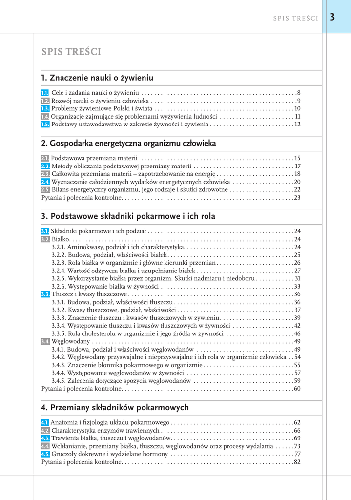 SPIS TREŚCI SPIS TREŚCI 1. Znaczenie nauki o żywieniu 1.1. Cele i zadania nauki o żywieniu . . . . . . . . . . . . . . . . . . . . . . . . . . . . . . . . . . . . . . . . . . . . . . . .8 1.2. Rozwój nauki o żywieniu człowieka . . . . . . . . . . . . . . . . . . . . . . . . . . . . . . . . . . . . . . . . . . . . .9 1.3. Problemy żywieniowe Polski i świata . . . . . . . . . . . . . . . . . . . . . . . . . . . . . . . . . . . . . . . . . . . 10 1.4. Organizacje zajmujące się problemami wyżywienia ludności . . . . . . . . . . . . . . . . . . . . . . . 11 1.5. Podstawy ustawodawstwa w zakresie żywności i żywienia . . . . . . . . . . . . . . . . . . . . . . . . . . 12 2. Gospodarka energetyczna organizmu człowieka 2.1. Podstawowa przemiana materii . . . . . . . . . . . . . . . . . . . . . . . . . . . . . . . . . . . . . . . . . . . . . . . 15 2.2. Metody obliczania podstawowej przemiany materii . . . . . . . . . . . . . . . . . . . . . . . . . . . . . . . 17 2.3. Całkowita przemiana materii – zapotrzebowanie na energię . . . . . . . . . . . . . . . . . . . . . . . . 18 2.4. Wyznaczanie całodziennych wydatków energetycznych człowieka . . . . . . . . . . . . . . . . . . .20 2.5. Bilans energetyczny organizmu, jego rodzaje i skutki zdrowotne . . . . . . . . . . . . . . . . . . . .22 Pytania i polecenia kontrolne. . . . . . . . . . . . . . . . . . . . . . . . . . . . . . . . . . . . . . . . . . . . . . . . . . . . .23 3. Podstawowe składniki pokarmowe i ich rola 3.1. Składniki pokarmowe i ich podział . . . . . . . . . . . . . . . . . . . . . . . . . . . . . . . . . . . . . . . . . . . . . 24 3.2. Białko. . . . . . . . . . . . . . . . . . . . . . . . . . . . . . . . . . . . . . . . . . . . . . . . . . . . . . . . . . . . . . . . . . . . . 24 3.2.1. Aminokwasy, podział i ich charakterystyka. . . . . . . . . . . . . . . . . . . . . . . . . . . . . . . . . . 24 3.2.2. Budowa, podział, właściwości białek. . . . . . . . . . . . . . . . . . . . . . . . . . . . . . . . . . . . . . .25 3.2.3. Rola białka w organizmie i główne kierunki przemian . . . . . . . . . . . . . . . . . . . . . . . .26 3.2.4. Wartość odżywcza białka i uzupełnianie białek . . . . . . . . . . . . . . . . . . . . . . . . . . . . . . 27 3.2.5. Wykorzystanie białka przez organizm. Skutki nadmiaru i niedoboru . . . . . . . . . . . . 31 3.2.6. Występowanie białka w żywności . . . . . . . . . . . . . . . . . . . . . . . . . . . . . . . . . . . . . . . . .33 3.3. Tłuszcz i kwasy tłuszczowe . . . . . . . . . . . . . . . . . . . . . . . . . . . . . . . . . . . . . . . . . . . . . . . . . . .36 3.3.1. Budowa, podział, właściwości tłuszczu . . . . . . . . . . . . . . . . . . . . . . . . . . . . . . . . . . . . .36 3.3.2. Kwasy tłuszczowe, podział, właściwości . . . . . . . . . . . . . . . . . . . . . . . . . . . . . . . . . . . . 37 3.3.3. Znaczenie tłuszczu i kwasów tłuszczowych w żywieniu. . . . . . . . . . . . . . . . . . . . . . .39 3.3.4. Występowanie tłuszczu i kwasów tłuszczowych w żywności . . . . . . . . . . . . . . . . . . . 42 3.3.5. Rola cholesterolu w organizmie i jego źródła w żywności . . . . . . . . . . . . . . . . . . . . . 46 3.4. Węglowodany . . . . . . . . . . . . . . . . . . . . . . . . . . . . . . . . . . . . . . . . . . . . . . . . . . . . . . . . . . . . . . 49 3.4.1. Budowa, podział i właściwości węglowodanów . . . . . . . . . . . . . . . . . . . . . . . . . . . . . . 49 3.4.2. Węglowodany przyswajalne i nieprzyswajalne i ich rola w organizmie człowieka . . 54 3.4.3. Znaczenie błonnika pokarmowego w organizmie . . . . . . . . . . . . . . . . . . . . . . . . . . . .55 3.4.4. Występowanie węglowodanów w żywności . . . . . . . . . . . . . . . . . . . . . . . . . . . . . . . . . 57 3.4.5. Zalecenia dotyczące spożycia węglowodanów . . . . . . . . . . . . . . . . . . . . . . . . . . . . . . .59 Pytania i polecenia kontrolne. . . . . . . . . . . . . . . . . . . . . . . . . . . . . . . . . . . . . . . . . . . . . . . . . . . . .60 4. Przemiany składników pokarmowych 4.1. Anatomia i fizjologia układu pokarmowego . . . . . . . . . . . . . . . . . . . . . . . . . . . . . . . . . . . . . .62 4.2. Charakterystyka enzymów trawiennych . . . . . . . . . . . . . . . . . . . . . . . . . . . . . . . . . . . . . . . . .66 4.3. Trawienia białka, tłuszczu i węglowodanów. . . . . . . . . . . . . . . . . . . . . . . . . . . . . . . . . . . . . .69 4.4. Wchłanianie, przemiany białka, tłuszczu, węglowodanów oraz procesy wydalania . . . . . . 73 4.5. Gruczoły dokrewne i wydzielane hormony . . . . . . . . . . . . . . . . . . . . . . . . . . . . . . . . . . . . . . 77 Pytania i polecenia kontrolne. . . . . . . . . . . . . . . . . . . . . . . . . . . . . . . . . . . . . . . . . . . . . . . . . . . . .82 3 4 P L A N OWA N I E I O C E N A Ż Y W I E N I A 5. Witaminy i ich rola w organizmie człowieka 5.1. Podział witamin . . . . . . . . . . . . . . . . . . . . . . . . . . . . . . . . . . . . . . . . . . . . . . . . . . . . . . . . . . . .83 5.2. Charakterystyka witamin rozpuszczalnych w tłuszczu . . . . . . . . . . . . . . . . . . . . . . . . . . . . .85 5.2.1. Witamina A i jej prowitamina – β-karoten . . . . . . . . . . . . . . . . . . . . . . . . . . . . . . . . . .85 5.2.2. Witamina D (kalciferol) . . . . . . . . . . . . . . . . . . . . . . . . . . . . . . . . . . . . . . . . . . . . . . . . .88 5.2.3. Witamina E (tokoferol). . . . . . . . . . . . . . . . . . . . . . . . . . . . . . . . . . . . . . . . . . . . . . . . . .90 5.2.4. Witamina K (filochinon). . . . . . . . . . . . . . . . . . . . . . . . . . . . . . . . . . . . . . . . . . . . . . . . . 91 5.3. Charakterystyka witamin rozpuszczalnych w wodzie . . . . . . . . . . . . . . . . . . . . . . . . . . . . . .92 5.3.1. Witamina B1 (tiamina) . . . . . . . . . . . . . . . . . . . . . . . . . . . . . . . . . . . . . . . . . . . . . . . . . .92 5.3.2. Witamina B2 (ryboflawina). . . . .