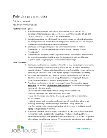 Polityka prywatności Polityka prywatności POLITYKA PRYWATNOŚCI Postanowienia ogólne 1. Administratorem danych osobowych Klientów jest Jobhouse Sp. z.o.o. z siedzibą w Gdańsku (zwana dalej Jobhouse) ul. al.Grunwaldzka 31, 80-241 Gdańsk, REGON: 222017678 , KRS: 0000493865. 2. Jeżeli nie zgadzasz się z Polityką Prywatności, proszę nie odwiedzać serwisu, nie zapisywać się do newsletterów należących do Jobhouse oraz nie nabywać produktów i usług oferowanych przez Jobhouse. 3. Jobhouse zastrzega sobie prawo do wprowadzania zmian w Polityce Prywatności, z zastrzeżeniem postanowień rozdziału „Zmiany Polityki Prywatności”. 4. Postanowienia niniejszej Polityki Prywatności mają odpowiednie zastosowanie do osób nieposiadających aktywnego Konta oraz potencjalnych Klientów, w tym do osób korzystających z formularza kontaktowego. Dane Osobowe 5. Jobhouse przetwarza dane osobowe Klientów w celu należytego wykonywania umów obejmujących Produkty i usługi Jobhouse oraz w celach marketingu bezpośredniego Produktów i usług Jobhouse oraz Produktów i usług partnerów handlowych Jobhouse, o ile Klient wyrazi zgodę na tego rodzaju marketing. 6. Jobhouse wymaga tylko tych danych, które są niezbędne do poprawnego działania serwisu i świadczenia usług. Niepodanie wymaganych danych uniemożliwi wykonanie czynności, której te dane dotyczyły. 7. Podstawą przetwarzania danych osobowych przez Jobhouse jest zgoda Klientów, jak również ustawowe upoważnienie do przetwarzania danych osobowych Klientów w celu: • umożliwienia Klientom korzystania z funkcji strony internetowej, • realizacji zamówień na Produkty i usługi Jobhouse, • reakcji na informacje przesłane Jobhouse z wykorzystaniem formularza kontaktowego, • realizacji subskrypcji bezpłatnych elektronicznych newsletterów (kursów), • realizacji marketingu bezpośredniego produktów i usług Jobhouse oraz Produktów i usług partnerów handlowych Jobhouse, o ile Klient wyrazi zgodę na tego rodzaju marketing. 8. Poprzez (i) podanie swoich danych osobowych w toku składania przez Klienta formularza w celu: założenia Konta, zakupu Produktów i usług Jobhouse, zamówienia subskrypcji bezpłatnego newslettera (kursu) lub w toku korzystania z formularza kontaktu oraz poprzez (ii) zaznaczenie właściwego pola wyboru, Jobhouse Sp. z o. o. al. Grunwaldzka 31 80-241 Gdańsk Tel. 58 58 58 072 Fax 58 58 58 073 e-mail: [email protected] www.jobhouse.pl Klient dokonuje akceptacji niniejszej Polityki Prywatności. Tym samym Klient wyraża zgodę na przetwarzanie jego danych osobowych w związku z zawarciem i wykonywaniem umowy przez Jobhouse. 9. Poprzez (i) podanie swoich danych osobowych w toku składania przez Klienta formularza oraz (ii) zaznaczenie właściwego pola wyboru, Klient wyraża zgodę na przetwarzanie jego danych osobowych w celu marketingu bezpośredniego produktów i usług Jobhouse oraz Produktów i usług partnerów handlowych Jobhouse. 10. Podanie jakichkolwiek danych osobowych ma charakter dobrowolny. Podanie danych wymaganych w procesie zakładania konta/korzystania z formularza kontaktowego/subskrypcji newslettera/składania zamówienia na produkty lub usługi jest konieczne do prawidłowego wykonywania usług przez Jobhouse. Klient w każdym czasie ma prawo dostępu do treści swoich danych oraz ich poprawiania. 11. Klient ma prawo wniesienia umotywowanego żądania zaprzestania przetwarzania jego danych osobowych przetwarzanych w przypadku przetwarzania ich w celach, o których mowa w art. 23 ust. 1 pkt 4 i 5 ustawy o ochronie danych osobowych, w tym w celach marketingowych, jak również ma prawo wniesienia sprzeciwu wobec przetwarzania jego danych w takich wypadkach. 12. Jobhouse będzie przetwarzać wyłącznie te dane, które są konieczne do prawidłowego wykonania usług przez Jobhouse, jak również dla zrealizowania uprawnień wynikających z przepisów obowiązującego prawa, w tym w celach statystycznych, rozpatrzenia ewentualnych reklamacji, wystawienia faktury VAT, dochodzenia roszczeń Jobhouse. 13. W przypadku wyrażenia zgody przez Klienta na otrzymywanie informacji handlowych drogą elektroniczną, dane osobowe Klienta mogą być przetwarzane również w celu przesłania Klientowi takiej informacji. 14. W zakres przetwarzanych danych wchodzi: imię, nazwisko, adres e-mail, numer telefonu komórkowego, adres. 15. Oprócz danych podawanych przez Klientów w ramach procesów przeglądania strony internetowej, rejestracji Konta, zakupu Produktów i usług Jobhouse, korzystania z formularza kontaktowego, subskrypcji newslettera, w ramach witryny jobhouse.pl wykorzystywane są mechanizmy gromadzące i przechowujące następujące informacje: 1) z użyciem plików Cookie – dane identyfikujące sesję danej osoby w przeglądarce internetowej i na serwerach strony internetowej Jobhouse.pl (określone szczegółowo w Polityce Cookies) 2) z użyciem logów serwera – dane takie jak: adres IP, skąd pochodzi zapytanie o wyświetlenie strony internetowej, typ przeglądarki, język przeglądarki, data i godzina zdarzenia, informacje o błędach jakie nastąpiły przy realizacji transakcji HTTP, w przypadku gdy przejście do strony Jobhouse Sp. z o. o. al. Grunwaldzka 31 80-241 Gdańsk Tel. 58 58 58 072 Fax 58 58 58 073 e-mail: [email protected] www.jobhouse.pl Jobhouse.pl nastąpiło przez odnośnik (link) – adres URL strony, z której Klient został przekierowany na stronę Jobhouse.pl. 16. W przypadku uzyskania przez Jobhouse wiadomości o korzystaniu przez Klienta ze strony internetowej Jobhouse.pl niezgodnie z Regulaminem lub z obowiązującymi przepisami, Jobhouse może przetwarzać dane osobowe Klienta w zakresie niezbędnym do ustalenia odpowiedzialności Klienta. Przeglądanie zawartości witryny internetowej/domeny Jobhouse.pl i jej poddomen 17. Przeglądanie zawartości witryny internetowej Jobhouse.pl, niepołączone z dokonywaniem zakupu usług lub produktu,