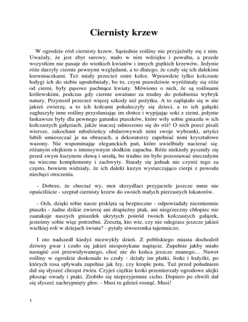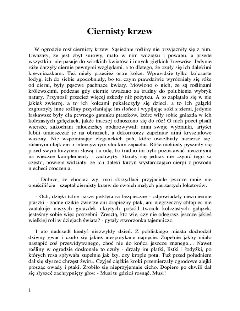 Ciernisty krzew W ogrodzie rósł ciernisty krzew. Sąsiednie rośliny nie przyjaźniły się z nim. Uważały, że jest zbyt surowy, mało w nim wdzięku i powabu, a przede wszystkim nie pasuje do wiotkich kwiatów i innych giętkich krzewów, Jedynie róże darzyły ciernie pewnymi względami, a to dlatego, że czuły się ich dalekimi krewniaczkami. Też miały przecież ostre kolce. Wprawdzie tylko kolczaste łodygi ich do siebie upodobniały, bo to, czym prawdziwie wyróżniały się róże od cierni, były pąsowe pachnące kwiaty. Mówiono o nich, że są roślinami królewskimi, podczas gdy ciernie uważano za trudny do polubienia wybryk natury. Przynosił przecież więcej szkody niż pożytku. A to zaplątało się w nie jakieś zwierzę, a to ich kolcami pokaleczyły się dzieci, a to ich gałązki zagłuszyły inne rośliny przysłaniając im słońce i wypijając soki z ziemi, jedynie łaskawsze były dla pewnego gatunku ptaszków, które wiły sobie gniazda w ich kolczastych gałęziach, jakże inaczej odnoszono się do róż! O nich poeci pisali wiersze, zakochani młodzieńcy obdarowywali nimi swoje wybranki, artyści lubili umieszczać je na obrazach, a dekoratorzy zapełniać nimi kryształowe wazony. Nie wspominając eleganckich pań, które uwielbiały nacierać się. różanym olejkiem o intensywnym słodkim zapachu. Róże niekiedy pyszniły się przed swym kuzynem sławą i urodą, bo trudno im było pozostawać nieczułymi na wieczne komplementy i zachwyty. Starały się jednak nie czynić tego za często, bowiem widziały, że ich daleki kuzyn wystarczająco cierpi z powodu niechęci otoczenia. - Dobrze, że chociaż wy, moi skrzydlaci przyjaciele jeszcze mnie nie opuściliście - szeptał ciernisty krzew do swoich małych pierzastych lokatorów. - Och, dzięki tobie nasze pisklęta są bezpieczne - odpowiadały niezmiennie ptaszki - żadne dzikie zwierzę ani drapieżny ptak, ani niegrzeczny chłopiec nie zaatakuje naszych gniazdek ukrytych pośród twoich kolczastych gałązek, jesteśmy sobie więc potrzebni. Zresztą, kto wie, czy nie odegrasz jeszcze jakieś wielkiej roli w dziejach świata? - pytały stworzonka tajemniczo. I oto nadszedł kiedyś niezwykły dzień. Z pobliskiego miasta dochodził dziwny gwar i czuło się jakieś niespotykane napięcie. Zupełnie jakby miało nastąpić coś przewidywanego, choć nie do końca jeszcze znanego.... Nawet rośliny w ogrodzie doskonale to czuły - drżały im płatki, listki i łodyżki, po których rosa spływała zupełnie jak łzy, czy krople potu. Tuż przed południem dał się słyszeć chrzęst żwiru. Czyjeś ciężkie kroki przemierzały ogrodowe alejki płosząc owady i ptaki. Zrobiło się nieprzyjemnie cicho. Dopiero po chwili dał się słyszeć zachrypnięty głos: - Musi tu gdzieś rosnąć. Musi! 1 Czyjeś ręce zaczęły gorączkowo rozgarniać gałęzie krzewów, odsuwać kamienne ławeczki, buszować pośród wielobarwnych pachnących kwiatów, a nawet wygniatać trawę. Nie czyniły tego z delikatnością ogrodnika, czy kogoś, kto kocha rośliny. Raczej zachowywały się jak zbójcy. "Czego ci nieproszeni goście tu szukają? - zastanawiały się zioła i kwiaty. - Nie wyglądają na miłośników przyrody i piękna...". - Och, ty podstępna ohydo! Zraniłeś mnie! - myśli i szepty roślin przerwał nieprzyjemny wrzask. To właściciel ciężkich rąk skaleczył się o ciernisty krzew. Wszyscy czekali w napięciu, co będzie dale). Spodziewali się, że rozjuszony człowiek zemści się okrutnie na cierniach, tymczasem on niespodziewanie wybuchnął śmiechem. - A więc znalazłem cię wreszcie! No, to teraz do roboty - założył skórzane rękawice i zaczął łamać gałązki. Krzew bronił się jeżąc kolce, ale ich ostrza nic nie mogły zrobić dobrze osłoniętym dłoniom. Kiedy człowiek zgromadzi] odpowiednią ilość pędów, usiadł na ławce i zaczął splatać z nich dziwny wieniec, pogwizdują przez zaciśnięte zęby. Wszystkie rośliny z ciekawością przyglądały się poczynaniom mężczyzny. Najbardziej zdumione były róże Jeszcze się nie zdarzyło, żeby ktoś plótł wieniec z cierni. Co do nas, to często byłyśmy do tego wykorzystywano, ale ty nasz kuzynie? - Sam tego nie rozumiem... Na co komu taka cierniowa ozdoba? Ani ona ładna ani bezpieczna... Rozmowy roślin przerwał narastają gwar. Tuż za płotem ogrodu zaczęło przesuwać się coraz więcej osób, a wśród nich kobiety i dzieci, starcy i miejscowe wyrostki. Najwięcej jednak było żołnierzy odzianych w krótkie tuniki i uzbrojonych w miecze, włócznie i tarcze. Rozganiali oni tłum krzykiem i razami rozdawanymi na lewo i prawo skórzanymi biczami. Mężczyzna, który mocował się jeszcze z cierniowymi gałązkami poderwał się na ten widok i pomacha] ręką, w której trzymał dziwny wieniec - Hej, już gotowy! Dawajcie tego dziwaka. Zaraz będzie mógł nami władać! Hi, hi! - Ach, to tu cię przyniosło Paliurusie. Widzę, że dobrze się spisałeś. Nie ominie cię nagroda - odezwał się ktoś wyglądający na dowódcę straży, która otaczała jakąś umęczona postać. Krzewy wyciągnęły swoje gałęzie, żeby lepiej widzieć, kwiaty wystawiły swoje główki poza ogrodzenie, a ptaszki, które siedziały dotąd w ukryciu, z furkotem wzbiły się ponad zmierzwione czupryny drzew. Mężczyzna zwany Paliurusem z udaną powagą wyniósł z ogrodu upleciony przez siebie kolczasty wieniec. A potem... Potem rozległy się dzikie wrzaski żołdaków odstępujących, jeden po drugim od umęczonej postaci, której prowadzili między sobą na powrozach. Oczom wszystkich ukazał się Więzień. Jego zbite ciało drżało z zimna i bólu. - Och, przepraszam wasza wysokość. Nie 2 okryłem cię mój władco twoim paradnym płaszczem - zaryczał jeden z żołnierzy i narzuci] na ramiona Skazańca kawałek purpurowej materii. Wokół rozległ się wybuch śmiechu. Ale na tym okrutna zabawa się nie 