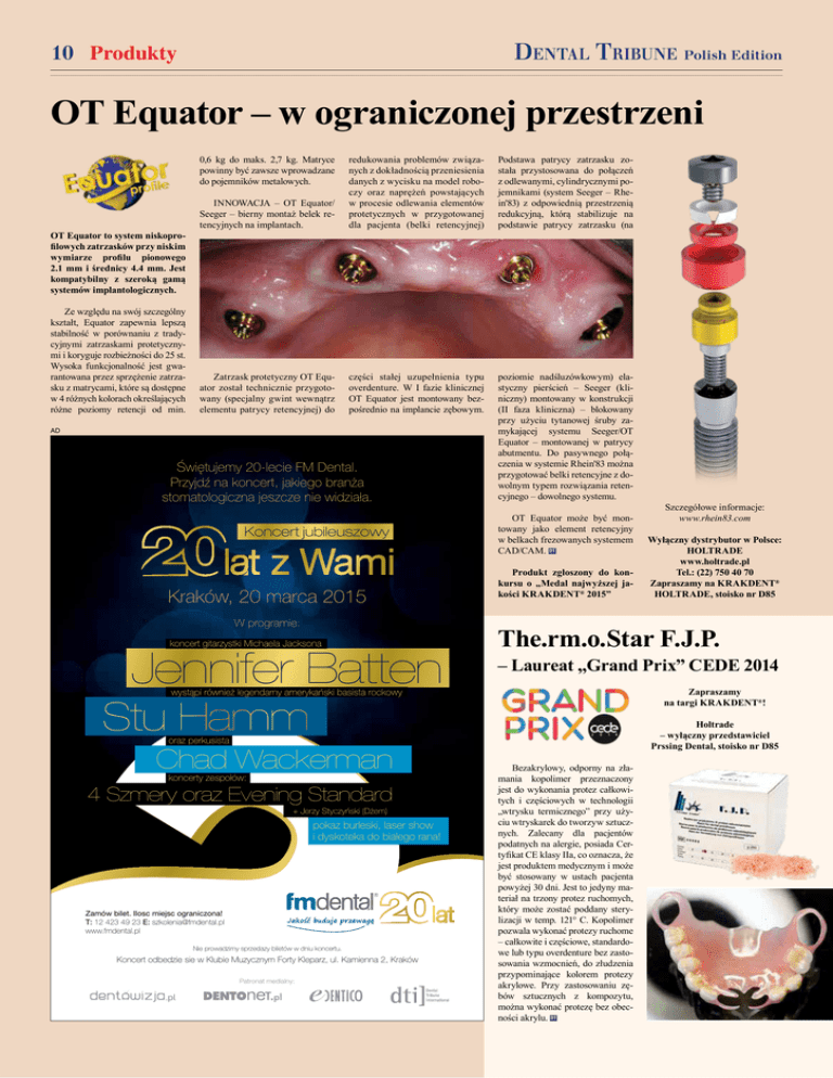 DENTAL TRIBUNE Polish Edition 10 Produkty OT Equator – w ograniczonej przestrzeni 0,6 kg do maks. 2,7 kg. Matryce powinny być zawsze wprowadzane do pojemników metalowych. OT Equator to system niskoproilowych zatrzasków przy niskim wymiarze proilu pionowego 2.1 mm i średnicy 4.4 mm. Jest kompatybilny z szeroką gamą systemów implantologicznych. Ze względu na swój szczególny kształt, Equator zapewnia lepszą stabilność w porównaniu z tradycyjnymi zatrzaskami protetycznymi i koryguje rozbieżności do 25 st. Wysoka funkcjonalność jest gwarantowana przez sprzężenie zatrzasku z matrycami, które są dostępne w 4 różnych kolorach określających różne poziomy retencji od min. INNOWACJA – OT Equator/ Seeger – bierny montaż belek retencyjnych na implantach. redukowania problemów związanych z dokładnością przeniesienia danych z wycisku na model roboczy oraz naprężeń powstających w procesie odlewania elementów protetycznych w przygotowanej dla pacjenta (belki retencyjnej) Podstawa patrycy zatrzasku została przystosowana do połączeń z odlewanymi, cylindrycznymi pojemnikami (system Seeger – Rhein'83) z odpowiednią przestrzenią redukcyjną, którą stabilizuje na podstawie patrycy zatrzasku (na Zatrzask protetyczny OT Equator został technicznie przygotowany (specjalny gwint wewnątrz elementu patrycy retencyjnej) do części stałej uzupełnienia typu overdenture. W I fazie klinicznej OT Equator jest montowany bezpośrednio na implancie zębowym. poziomie nadśluzówkowym) elastyczny pierścień – Seeger (kliniczny) montowany w konstrukcji (II faza kliniczna) – blokowany przy użyciu tytanowej śruby zamykającej systemu Seeger/OT Equator – montowanej w patrycy abutmentu. Do pasywnego połączenia w systemie Rhein'83 można przygotować belki retencyjne z dowolnym typem rozwiązania retencyjnego – dowolnego systemu. AD Świętujemy 20-lecie FM Dental. Przyjdź na koncert, jakiego branża stomatologiczna jeszcze nie widziała. Koncert jubileuszowy Kraków, 20 marca 2015 W programie: koncert gitarzystki Michaela Jacksona Jennifer Batten OT Equator może być montowany jako element retencyjny w belkach frezowanych systemem CAD/CAM. DT Produkt zgłoszony do konkursu o „Medal najwyższej jakości KRAKDENT® 2015” – Laureat „Grand Prix” CEDE 2014 Zapraszamy na targi KRAKDENT®! Stu Hamm Holtrade – wyłączny przedstawiciel Prssing Dental, stoisko nr D85 oraz perkusista koncerty zespołów: 4 Szmery oraz Evening Standard + Jerzy Styczyński (Dżem) pokaz burleski, laser show i dyskoteka do białego rana! Zamów bilet. Ilosc miejsc ograniczona! T: 12 423 49 23 E: [email protected] www.fmdental.pl Nie prowadzimy sprzedazy biletów w dniu koncertu. Koncert odbedzie sie w Klubie Muzycznym Forty Kleparz, ul. Kamienna 2, Kraków Patronat medialny: Wyłączny dystrybutor w Polsce: HOLTRADE www.holtrade.pl Tel.: (22) 750 40 70 Zapraszamy na KRAKDENT® HOLTRADE, stoisko nr D85 The.rm.o.Star F.J.P. wystąpi również legendarny amerykański basista rockowy Chad Wackerman Szczegółowe informacje: www.rhein83.com Bezakrylowy, odporny na złamania kopolimer przeznaczony jest do wykonania protez całkowitych i częściowych w technologii „wtrysku termicznego” przy użyciu wtryskarek do tworzyw sztucznych. Zalecany dla pacjentów podatnych na alergie, posiada Certyikat CE klasy IIa, co oznacza, że jest produktem medycznym i może być stosowany w ustach pacjenta powyżej 30 dni. Jest to jedyny materiał na trzony protez ruchomych, który może zostać poddany sterylizacji w temp. 121° C. Kopolimer pozwala wykonać protezy ruchome – całkowite i częściowe, standardowe lub typu overdenture bez zastosowania wzmocnień, do złudzenia przypominające kolorem protezy akrylowe. Przy zastosowaniu zębów sztucznych z kompozytu, można wykonać protezę bez obecności akrylu. DT
