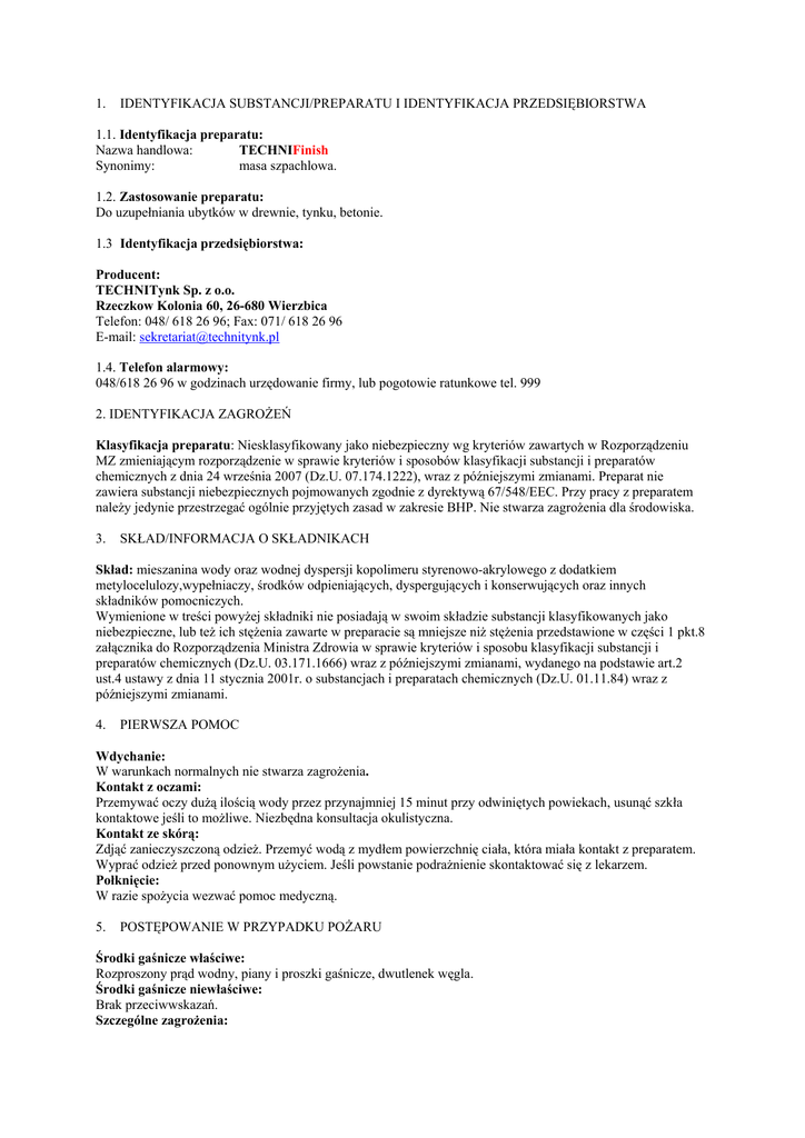 1. IDENTYFIKACJA SUBSTANCJI/PREPARATU I IDENTYFIKACJA PRZEDSIĘBIORSTWA 1.1. Identyfikacja preparatu: Nazwa handlowa: TECHNIFinish Synonimy: masa szpachlowa. 1.2. Zastosowanie preparatu: Do uzupełniania ubytków w drewnie, tynku, betonie. 1.3 Identyfikacja przedsiębiorstwa: Producent: TECHNITynk Sp. z o.o. Rzeczkow Kolonia 60, 26-680 Wierzbica Telefon: 048/ 618 26 96; Fax: 071/ 618 26 96 E-mail: [email protected] 1.4. Telefon alarmowy: 048/618 26 96 w godzinach urzędowanie firmy, lub pogotowie ratunkowe tel. 999 2. IDENTYFIKACJA ZAGROŻEŃ Klasyfikacja preparatu: Niesklasyfikowany jako niebezpieczny wg kryteriów zawartych w Rozporządzeniu MZ zmieniającym rozporządzenie w sprawie kryteriów i sposobów klasyfikacji substancji i preparatów chemicznych z dnia 24 września 2007 (Dz.U. 07.174.1222), wraz z późniejszymi zmianami. Preparat nie zawiera substancji niebezpiecznych pojmowanych zgodnie z dyrektywą 67/548/EEC. Przy pracy z preparatem należy jedynie przestrzegać ogólnie przyjętych zasad w zakresie BHP. Nie stwarza zagrożenia dla środowiska. 3. SKŁAD/INFORMACJA O SKŁADNIKACH Skład: mieszanina wody oraz wodnej dyspersji kopolimeru styrenowo-akrylowego z dodatkiem metylocelulozy,wypełniaczy, środków odpieniających, dyspergujących i konserwujących oraz innych składników pomocniczych. Wymienione w treści powyżej składniki nie posiadają w swoim składzie substancji klasyfikowanych jako niebezpieczne, lub też ich stężenia zawarte w preparacie są mniejsze niż stężenia przedstawione w części 1 pkt.8 załącznika do Rozporządzenia Ministra Zdrowia w sprawie kryteriów i sposobu klasyfikacji substancji i preparatów chemicznych (Dz.U. 03.171.1666) wraz z późniejszymi zmianami, wydanego na podstawie art.2 ust.4 ustawy z dnia 11 stycznia 2001r. o substancjach i preparatach chemicznych (Dz.U. 01.11.84) wraz z późniejszymi zmianami. 4. PIERWSZA POMOC Wdychanie: W warunkach normalnych nie stwarza zagrożenia. Kontakt z oczami: Przemywać oczy dużą ilością wody przez przynajmniej 15 minut przy odwiniętych powiekach, usunąć szkła kontaktowe jeśli to możliwe. Niezbędna konsultacja okulistyczna. Kontakt ze skórą: Zdjąć zanieczyszczoną odzież. Przemyć wodą z mydłem powierzchnię ciała, która miała kontakt z preparatem. Wyprać odzież przed ponownym użyciem. Jeśli powstanie podrażnienie skontaktować się z lekarzem. Połknięcie: W razie spożycia wezwać pomoc medyczną. 5. POSTĘPOWANIE W PRZYPADKU POŻARU Środki gaśnicze właściwe: Rozproszony prąd wodny, piany i proszki gaśnicze, dwutlenek węgla. Środki gaśnicze niewłaściwe: Brak przeciwwskazań. Szczególne zagrożenia: Preparat niepalny do momentu odparowania wody. Podczas pożaru suchy produkt wydziela czarny dym. Środki ochrony indywidualnej dla strażaków: Odpowiednie ubranie i całkowicie izolujący sprzęt ochrony dróg oddechowych z aparaturą oddychania. Informacje dodatkowe: Pojemniki z preparatem narażone na działanie ognia lub wysokiej temperatury chłodzić rozproszonym prądem wody, o ile to możliwe, usunąć z obszaru zagrożenia. 6. POSTĘPOWANIE W PRZYPADKU NIEZAMIERZONEGO UWOLNIENIA DO ŚRODOWISKA Indywidualne środki ostrożności: Unikać bezpośredniego kontaktu i zachować ostrożność, używać odzieży ochronnej, okularów i rękawic ochronnych. W trakcie akcji ratowniczej używać ubrania ochronnego, rękawic i okularów ochronnych. Przy powstawaniu mgieł z rozpylonego preparatu stosować maskę ochronną z filtrem. Środowiskowe środki ostrożności: Zapobiec rozprzestrzenianiu się i dostaniu preparatu do gruntu, wód powierzchniowych, gruntowych i do kanalizacji. Usunąć źródła zapłonu. Wydostanie się preparatu powoduje śliskość nawierzchni ze względu na właściwości fizykochemiczne preparatu. Metody oczyszczania/usuwania: Zebrać wyciek do odpowiednich pojemników w celu utylizacji lub powtórnego przetworzenia (patrz punkt 13.). Zanieczyszczone przedmioty i powierzchnie umyć natychmiast ciepłą wodą. 7. POSTĘPOWANIE Z SUBSTANCJĄ/PREPARATEM I JEJ/JEGO MAGAZYNOWANIE 7.1. Postępowanie z preparatem: Postępować zgodnie z ogólnie przyjętymi zasadami bezpieczeństwa i higieny pracy. Unikać bezpośredniego kontaktu, stosować sprzęt ochrony osobistej. 7.2. Magazynowanie: Przechowywać w zamkniętych opakowaniach, w pomieszczeniach chroniących przed wpływami atmosferycznymi, najlepiej w temperaturze +5 do +20şC. Chronić przed mrozem i ekspozycją na wysokie temperatury (powyżej +40 şC). Zapewnić dobrą wentylację. 7.3. Specyficzne zastosowania: Nie dotyczy. 8. KONTROLA NARAŻENIA I ŚRODKI OCHRONY INDYWIDUALNEJ 8.1. Wartości graniczne narażenia: Dolmic (pył całkowity): NDS: 10 mg/m3; NDSCh: -; NDSP: Ze względu na formę preparatu nie ma możliwości wystąpienia emisji pyłów w/w substancji do środowiska pracy, a co za tym idzie, monitorowanie ich zawartości w powietrzu nie jest konieczne. Dla pozostałych substancji zawartych w preparacie Szpachlówka akrylowa nie są określone dawki najwyższych dopuszczalnych stężeń wg Rozporządzenia Ministra Pracy i Polityki Społecznej z dnia 29 listopada 2002 w sprawie najwyższych dopuszczalnych stężeń i natężeń czynników szkodliwych dla zdrowa w środowisku pracy (Dz.U.02.217.1833). 8.2. Kontrola narażenia: 8.2.1. Kontrola narażenia w miejscu pracy: Wentylacja: wentylacja ogólna pomieszczenia. Sprzęt ochrony indywidualnej: - Ochrona dróg oddechowych: nie jest wymagana w normalnych warunkach ruchowych. Stosować maskę z filtrem przy powstawaniu mgieł z rozpylonego preparatu. - Ochrona rąk: wymagana, rękawice gumowe lub z tworzywa sztucznego. - Ochrona oczu: wymagana, szczelne okulary ochronne w przypadku możliwości bezpośredniego kontaktu. - Ochrona ciała: wymagana, ubranie ochronne ze zwartej tkaniny, fartuch ochronny. - Higiena osobista: stosować procedury utrzymania porządku i higieny osobistej. Nie dopuszczać do zanieczyszczania u