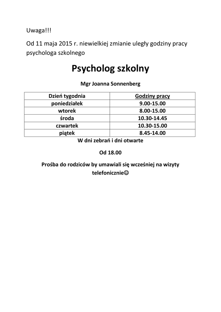 Uwaga!!! Od 11 maja 2015 r. niewielkiej zmianie uległy godziny pracy psychologa szkolnego Psycholog szkolny Mgr Joanna Sonnenberg Dzieo tygodnia Godziny pracy poniedziałek 9.00-15.00 wtorek 8.00-15.00 środa 10.30-14.45 czwartek 10.30-15.00 piątek 8.45-14.00 W dni zebrao i dni otwarte Od 18.00 Prośba do rodziców by umawiali się wcześniej na wizyty telefonicznie