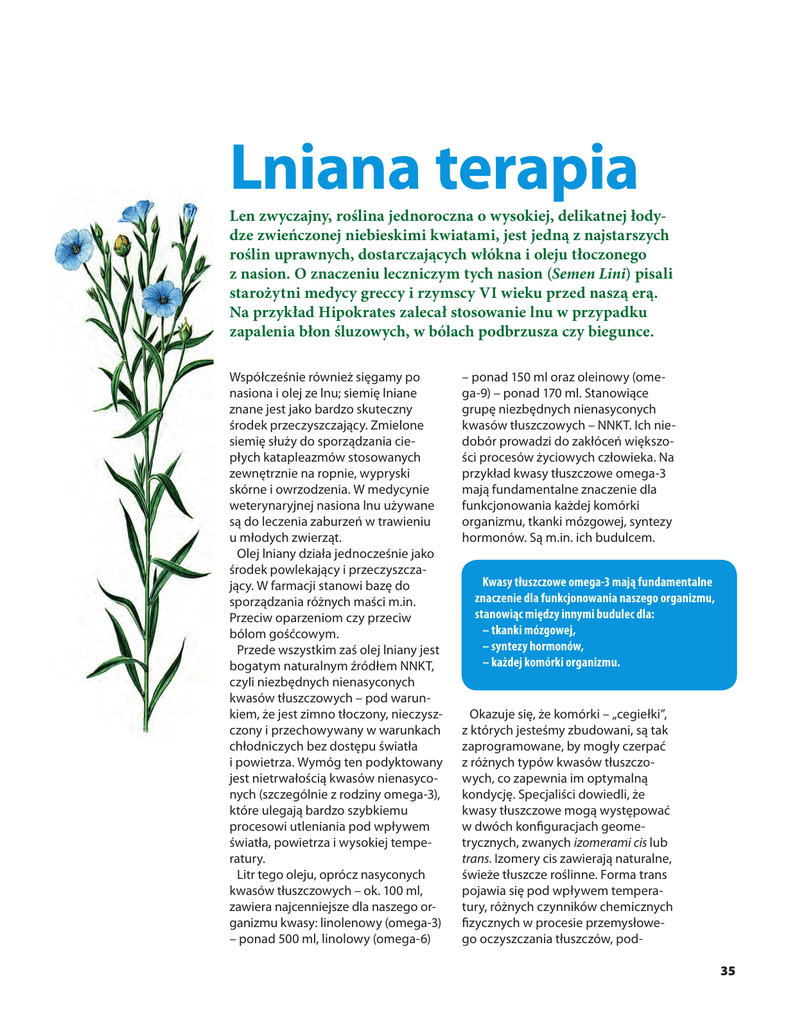 Lniana terapia Len zwyczajny, roślina jednoroczna o wysokiej, delikatnej łody dze zwieńczonej niebieskimi kwiatami, jest jedną z najstarszych roślin uprawnych, dostarczających włókna i oleju tłoczonego z nasion. O znaczeniu leczniczym tych nasion (Semen Lini) pisali starożytni medycy greccy i rzymscy VI wieku przed naszą erą. Na przykład Hipokrates zalecał stosowanie lnu w przypadku zapalenia błon śluzowych, w bólach podbrzusza czy biegunce. Współcześnie również sięgamy po nasiona i olej ze lnu; siemię lniane znane jest jako bardzo skuteczny środek przeczyszczający. Zmielone siemię służy do sporządzania ciepłych katapleazmów stosowanych zewnętrznie na ropnie, wypryski skórne i owrzodzenia. W medycynie weterynaryjnej nasiona lnu używane są do leczenia zaburzeń w trawieniu u młodych zwierząt. Olej lniany działa jednocześnie jako środek powlekający i przeczyszczający. W farmacji stanowi bazę do sporządzania różnych maści m.in. Przeciw oparzeniom czy przeciw bólom gośćcowym. Przede wszystkim zaś olej lniany jest bogatym naturalnym źródłem NNKT, czyli niezbędnych nienasyconych kwasów tłuszczowych – pod warunkiem, że jest zimno tłoczony, nieczyszczony i przechowywany w warunkach chłodniczych bez dostępu światła i powietrza. Wymóg ten podyktowany jest nietrwałością kwasów nienasyconych (szczególnie z rodziny omega‑3), które ulegają bardzo szybkiemu procesowi utleniania pod wpływem światła, powietrza i wysokiej temperatury. Litr tego oleju, oprócz nasyconych kwasów tłuszczowych – ok. 100 ml, zawiera najcenniejsze dla naszego organizmu kwasy: linolenowy (omega‑3) – ponad 500 ml, linolowy (omega-6) – ponad 150 ml oraz oleinowy (omega-9) – ponad 170 ml. Stanowiące grupę niezbędnych nienasyconych kwasów tłuszczowych – NNKT. Ich niedobór prowadzi do zakłóceń większości procesów życiowych człowieka. Na przykład kwasy tłuszczowe omega-3 mają fundamentalne znaczenie dla funkcjonowania każdej komórki organizmu, tkanki mózgowej, syntezy hormonów. Są m.in. ich budulcem. Kwasy tłuszczowe omega-3 mają fundamentalne znaczenie dla funkcjonowania naszego organizmu, stanowiąc między innymi budulec dla: – tkanki mózgowej, – syntezy hormonów, – każdej komórki organizmu. Okazuje się, że komórki – „cegiełki”, z których jesteśmy zbudowani, są tak zaprogramowane, by mogły czerpać z różnych typów kwasów tłuszczowych, co zapewnia im optymalną kondycję. Specjaliści dowiedli, że kwasy tłuszczowe mogą występować w dwóch konfiguracjach geometrycznych, zwanych izomerami cis lub trans. Izomery cis zawierają naturalne, świeże tłuszcze roślinne. Forma trans pojawia się pod wpływem temperatury, różnych czynników chemicznych fizycznych w procesie przemysłowego oczyszczania tłuszczów, pod35 Układ sercowo-naczyniowy » Kwas a-linolenowy obniża poziom cholesterolu i hamuje agregację i adhezję płytek krwi. » Kwasy z grupy omega-3 powodują wzrost poziomu tzw. „dobrego cholesterolu”. Dzięki temu olej z siemienia lnianego także skutecznie przeciwdziała miażdżycy, zawałowi serca, chorobie nadciśnieniowej. » Zakończone niedawno 5-letnie badania wskazują, że zapobiegają one skutecznie powtórnemu zawałowi serca, działają antyarytmicznie. » Nienasycone kwasy tłuszczowe są prekursorami do syntezy prostacyklin wpływających na rozszerzanie naczyń wieńcowych i zwiększenie siły skurczu mięśnia sercowego. » Kwasy omega-3 zmniejszają ryzyko zgonu po przebytym zawale i ryzyko nagłej śmierci w wyniku zatrzymania krążenia oraz obniżają liczbę zgonów z powodu chorób układu krążenia o około 30%. » Składniki oleju lnianego zmniejszają ryzyko raka prostaty. Badania przeprowadzone wśród pacjentów chorych na raka prostaty, którzy stosowali w diecie olej lniany przez około 5 tygodni wykazały spowolnione tempo podziałów komórek nowotworowych oraz wzrost szybkości ich umierania w stosunku do pacjentów, którzy go w diecie nie stosowali. » Badania laboratoryjne oraz te przeprowadzone na zwierzętach wykazały także, że kwasy omega‑3 mogą zahamować raka piersi, a także zapobiegać rozwojowi nowotworów w innych organach. 36 czas utwardzania np. w produkcji margaryn. Pojawienie się izomerów trans zmienia właściwości biologiczne kwasów tłuszczowych, tym samym zmienia ich oddziaływanie na organizm człowieka. Tymczasem współczesna standardowa europejska dieta złożona jest w dużej mierze z tłuszczów nasyconych, cholesterolu i kwasów tłuszczowych trans. Zajadamy się wysokokalorycznymi i wysoko przetworzonymi produktami, których praktycznie nie ma kwasów omega-3, poszukiwania naturalnego sposobu uzupełnienia koniecznych dla zdrowia fosfatydów i lipoprotein. Wynikiem tych poszukiwań jest znana już na całym świecie PASTA (ang. spread), czyli zmiksowana mieszanina dwóch składników: oleju lnianego i chudego białego sera. Olej lniany i chudy ser powinny być spożywane razem. Zmiksowanie zawierającego nienasycone kwasy oleju lnianego z serem powoduje związanie kwasów z białkami, umoż- Dieta dr Budwig bazuje na dostarczeniu organizmowi pokarmów bogatych m.in. w tłuszcze omega-3, węglowodany zło żone, błonnik i antyoksydanty. jest zaś nadmiar kwasów omega‑6. liwiając bardzo szybkie przyswajanie Taka dysproporcja prowadzi do w układzie pokarmowym i transportowanie w organizmie. zachwiania równowagi immunoloDr Budwig przez 10 lat obserwowała gicznej i nadmiernej skłonności do stanów zapalnych organizmu. efekty zdrowotne opracowanej przez Pionierką badań nad kwasami siebie diety, stosując ją w leczeniu omega-3 i olejem lnianym była dr Johanna Budwig Kwas a-linolenowy (ALA) należący do rodziny – niemiecka biochemik siedomega -3 jest podstawowym źródłem kwasu DHA bęmiokrotnie nominowana do dącego bardzo ważnym składnikiem mózgu. Niski poNagrody Nobla. Jej odkrycia ziom