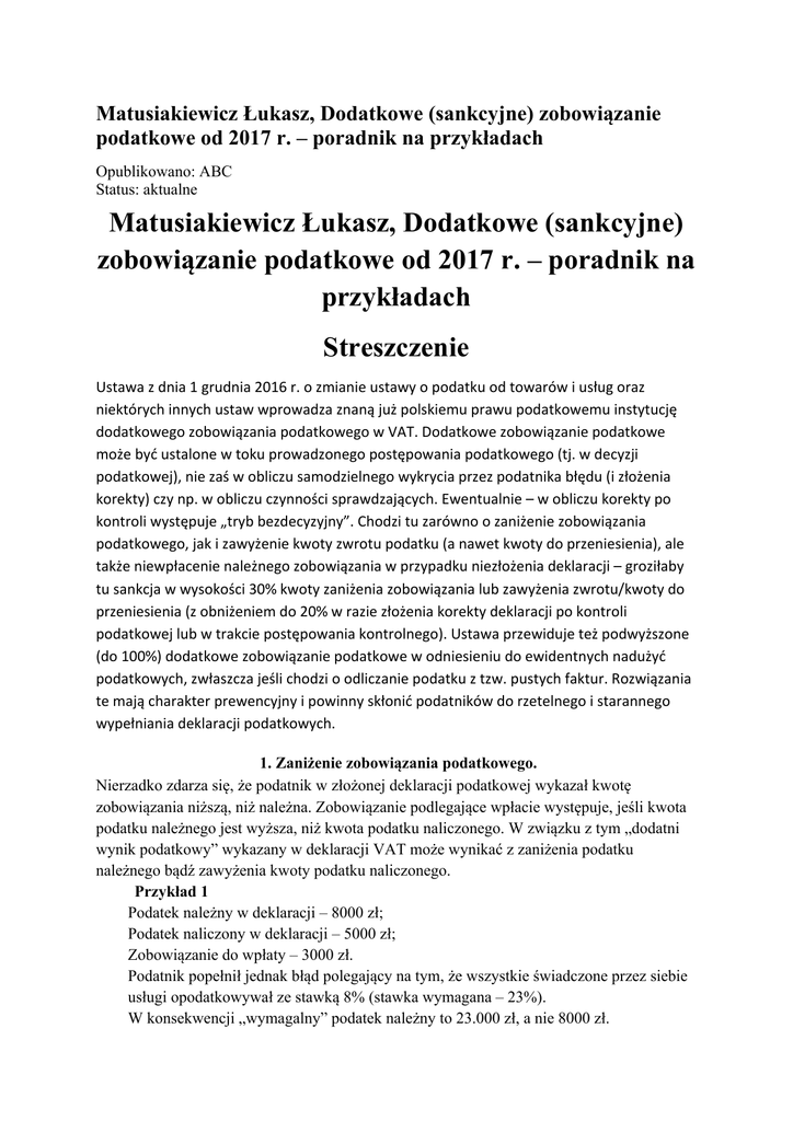Matusiakiewicz Łukasz, Dodatkowe (sankcyjne) zobowiązanie podatkowe od 2017 r. – poradnik na przykładach Opublikowano: ABC Status: aktualne Matusiakiewicz Łukasz, Dodatkowe (sankcyjne) zobowiązanie podatkowe od 2017 r. – poradnik na przykładach Streszczenie Ustawa z dnia 1 grudnia 2016 r. o zmianie ustawy o podatku od towarów i usług oraz niektórych innych ustaw wprowadza znaną już polskiemu prawu podatkowemu instytucję dodatkowego zobowiązania podatkowego w VAT. Dodatkowe zobowiązanie podatkowe może być ustalone w toku prowadzonego postępowania podatkowego (tj. w decyzji podatkowej), nie zaś w obliczu samodzielnego wykrycia przez podatnika błędu (i złożenia korekty) czy np. w obliczu czynności sprawdzających. Ewentualnie – w obliczu korekty po kontroli występuje „tryb bezdecyzyjny”. Chodzi tu zarówno o zaniżenie zobowiązania podatkowego, jak i zawyżenie kwoty zwrotu podatku (a nawet kwoty do przeniesienia), ale także niewpłacenie należnego zobowiązania w przypadku niezłożenia deklaracji – groziłaby tu sankcja w wysokości 30% kwoty zaniżenia zobowiązania lub zawyżenia zwrotu/kwoty do przeniesienia (z obniżeniem do 20% w razie złożenia korekty deklaracji po kontroli podatkowej lub w trakcie postępowania kontrolnego). Ustawa przewiduje też podwyższone (do 100%) dodatkowe zobowiązanie podatkowe w odniesieniu do ewidentnych nadużyć podatkowych, zwłaszcza jeśli chodzi o odliczanie podatku z tzw. pustych faktur. Rozwiązania te mają charakter prewencyjny i powinny skłonić podatników do rzetelnego i starannego wypełniania deklaracji podatkowych. 1. Zaniżenie zobowiązania podatkowego. Nierzadko zdarza się, że podatnik w złożonej deklaracji podatkowej wykazał kwotę zobowiązania niższą, niż należna. Zobowiązanie podlegające wpłacie występuje, jeśli kwota podatku należnego jest wyższa, niż kwota podatku naliczonego. W związku z tym „dodatni wynik podatkowy” wykazany w deklaracji VAT może wynikać z zaniżenia podatku należnego bądź zawyżenia kwoty podatku naliczonego. Przykład 1 Podatek należny w deklaracji – 8000 zł; Podatek naliczony w deklaracji – 5000 zł; Zobowiązanie do wpłaty – 3000 zł. Podatnik popełnił jednak błąd polegający na tym, że wszystkie świadczone przez siebie usługi opodatkowywał ze stawką 8% (stawka wymagana – 23%). W konsekwencji „wymagalny” podatek należny to 23.000 zł, a nie 8000 zł. Zaniżenie zobowiązania podatkowego – kwota 15.000 zł. Dodatkowe zobowiązanie podatkowe to 30% z 15.000 zł, czyli 4500 zł. Przykład 2 Podatek należny w deklaracji – 10.000 zł; Podatek naliczony w deklaracji – 5000 zł; Zobowiązanie do wpłaty – 5000 zł. Podatnik popełnił jednak błąd polegający na tym, że dokonał odliczenia VAT z faktury dokumentującej usługi ubezpieczeniowe (zwolnione z VAT). Faktura opiewała na kwotę 2000 zł netto, 460 zł VAT. Zatem zobowiązanie do wpłaty – przy prawidłowym rozliczeniu wygląda tak: Podatek należny w deklaracji – 10.000 zł; Podatek naliczony w deklaracji – 4540 zł; Zobowiązanie do wpłaty – 5460 zł. Zaniżenie zobowiązania podatkowego – kwota 460 zł. Dodatkowe zobowiązanie podatkowe to 30% z 460 zł, czyli 138 zł. 2. Zawyżenie zwrotu VAT bądź kwoty „do przeniesienia” Na analogicznych zasadach może wystąpić m.in. zawyżenie nadwyżki podatku naliczonego nad należnym do zwrotu bezpośredniego na rachunek bankowy. Przykład 3 Podatnik wykazał zwrot bezpośredni na rachunek bankowy w wysokości 3000 zł zamiast 2000 zł. Nastąpiło zawyżenie zwrotu o 1000 zł. Dodatkowe zobowiązanie podatkowe wyniesie 1000 zł. Przykład 4 Podatnik wykazał za wysoką (o 2000 zł) kwotę nadwyżki podatku naliczonego nad należnym na następny okres rozliczeniowy – dodatkowe zobowiązanie podatkowe wyniesie 600 zł. Odnosząc się do przykładu 4. – zasady i mechanizmy rozliczania VAT przyzwalają na przenoszenie kwoty nadwyżki podatku naliczonego nad należnym przez wiele okresów rozliczeniowych. Powstaje pytanie, czy można wówczas ustalać dodatkowe zobowiązanie podatkowe za każdy miesiąc. Warto zauważyć, że podatnik kilkukrotnie przenoszący nadwyżkę byłby w gorszej sytuacji prawnej, niż podatnik deklarujący zwrot. Nie można zresztą „karać wielokrotnie” za to samo. 3. Nadwyżka VAT naliczonego zamiast nadwyżki VAT należnego Niejednokrotnie bywa i tak, że podatnik, popełniając błąd, wykazał zwrot bezpośredni bądź kwotę do przeniesienia, podczas gdy powinien był wykazać zobowiązanie. Przykład 5 Zaniżenie stawki VAT na sprzedawane towary spowodowało, że podatnik w deklaracji wykazał zwrot VAT w wysokości 9000 zł, podczas gdy w wyniku prawidłowego rozliczenia organ podatkowy określił w decyzji kwotę zobowiązania do wpłaty w wysokości 1000 zł. „Łączna nieprawidłowość” to 10.000 zł – dodatkowe zobowiązanie podatkowe wyniesie 3000 zł. 4. Brak złożenia deklaracji podatkowej i wpłaty podatku Omawiana kwestia dotyczy np. typowej „szarej strefy”, czyli prowadzenia niezgłoszonej działalności gospodarczej. Kolejny krąg podmiotów to m.in. podatnicy będący „w błędnym przekonaniu”, iż mogli korzystać ze zwolnienia podmiotowego, przysługującego w związku z małymi obrotami (przy okazji warto napomknąć, iż próg dla zwolnienia od 2017 r. wzrasta ze 150.000 zł do 200.000 zł). Przykład 6 Wspólnota mieszkaniowa powoływała się na fakt, że zwalnia się od podatku czynności związane z utrzymaniem lokali mieszkalnych, wykorzystywanych wyłącznie na cele mieszkaniowe, za które pobierane są opłaty, wykonywane przez wspólnotę mieszkaniową na rzecz właścicieli tych lokali, tworzących w określonej nieruchomości tę wspólnotę. Jednak obrót z tytułu dostawy mediów do lokali mieszkalnych na cele mieszkaniowe – nawet gdy korzysta on ze zwolnienia od podatku VAT – jako dotyczący transakcji zw