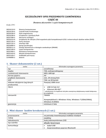 Załącznik nr 3 do zapytania z dnia 10.12.2014 r. SZCZEGÓŁOWY OPIS PRZEDMIOTU ZAMÓWIENIA CZĘŚĆ III Dostawa akcesoriów i części komputerowych Kody CPV: 30216110-0 30216130-6 30234100-9 30233180-6 30237280-5 30233153-8 30237135-4 30237132-3 30232000-4 30236111-3 30237100-0 30237460-1 30237410-6 30237220-7 31440000-2 Skanery komputerowe Czytniki kodu kreskowego Dysk magnetyczny Urządzenia z pamięcią flash Akcesoria zasilające Urządzenie do odczytu i/lub wypalania płyt kompaktowych (CD) i uniwersalnych dysków wideo (DVD) Karty sieciowe Interfejs USB Sprzęt peryferyjny Pamięć dynamiczna o dostępie swobodnym (DRAM) Części komputerów Klawiatury komputerowe Myszka komputerowa Podkładki pod myszy Baterie 1. Skaner dokumentów (2 szt.) cecha typ duplex rozdzielczość skanowania format papieru prędkość skanowania ADF dobowe obciążenie (wg danych producenta) złącza Minimalne wymagane parametry szczelinowy TAK, jednoprzebiegowy 600 x 600 dpi A4 min. 24 strony/min TAK, na 50 kartek Powyżej 1000 stron USB 2.0 lub 3.0 Ethernet (RJ-45)* * wbudowany w urządzenie lub jako zewnętrzny dedykowany moduł dołączony do urządzenia sterowniki TWAIN gwarancja Kompatybilność z Windows Vista, Windows 7 (32bit/64bit), Windows 8 (64bit) minimum 2 lata 2. Mini skaner kodów kreskowych (1 szt.) cecha Minimalne wymagane parametry przeznaczenie rodzaj dekodowanie typ czytnika na potrzeby inwentaryzacji środków trwałych komunikacja mobilny kody jednowymiarowe (1D) dioda laserowa kabel USB bezprzewodowo poprzez Bluetooth wbudowana bateria obsługiwane systemy gwarancja waga TAK Android Windows 7, Windows 8 1 rok do 60 gram 3. Dysk twardy do macierzy dyskowej (3 szt.) cecha przeznaczenie interfejs rozmiar pojemność kompatybilność z macierzami posiadanymi przez Zamawiającego wymagane parametry dysk klasy Enterprise do macierzy dyskowych SATA 3,5” 1TB dysk powinien znajdować się na oficjalnej liście kompatybilności: z macierzami QNAP (modele TS-859U-RP+ i TS-559 Pro II): http://www.qnap.com/i/en/product_x_grade/cat_intro.php?g_c at=1&hf=0 z macierzami Synology (model DS408): https://www.synology.com/pl-pl/compatibility/hd 4. Dysk twardy 3,5” SATA (5 szt.) cecha przeznaczenie format szerokości interfejs typ pojemność wymagane parametry do komputerów stacjonarnych 3,5” Serial ATA magnetyczny ≥ 500 GB 5. Dysk twardy 2,5” SATA (2 szt.) cecha przeznaczenie format szerokości interfejs typ pojemność wymagane parametry do laptopów 2,5” Serial ATA magnetyczny ≥ 250 GB 6. Dysk SSD (4 szt.) cecha typ pojemność kości pamięci interfejs deklarowany IOPS odczyt zapis deklarowany odczyt maks. deklarowany zapis maks. zastosowane technologie Minimalne wymagane parametry SSD 240GB MLC Serial ATA III 90000 90000 >= 500 MB/s >= 500 MB/s TRIM S.M.A.R.T. Idle Time Garbage Collection 7. Pendrive (4 szt.) cecha wymagane parametry interfejs minimalna pojemność prędkość odczytu prędkość zapisu wysuwany USB 3.0 16GB 90 MB/s lub większa 30 MB/s lub większa NIE (pendrive z zatyczką) 8. Zasilacz awaryjny UPS (15 szt.) cecha wymagane parametry obszar zastosowań architektura UPS Funkcja AVR (automatyczna regulacja napięcia) moc (VA) moc (W) typ gniazd wyjściowych ilość gniazd wyjściowych sygnalizacja interfejs komunikacyjny oprogramowanie do monitorowania stanu UPSa, kompatybilne z Windows XP,Vista,7, 8 liczba kabli zasilających IEC320 C13/C14 w zestawie (lub dołożona przez wykonawcę) certyfikaty i standardy zestawy komputerowe line-interactive TAK ≥ 650VA ≥ 360W IEC 320 C13 ≥3 akustyczno-optyczna USB TAK ≥2 deklaracja zgodności CE (należy dostarczyć przed podpisaniem umowy) 9. Zasilacz ATX (10 szt.) cecha moc standard napięcie wejściowe sprawność funkcja PFC typ PFC napięcie wejściowe wentylator zabezpieczenia złącza certyfikaty i standardy OVP (zabezpieczenie przeciwprzepięciowe) SCP (zabezpieczenie przeciwzwarciowe) OPP (zabezpieczenie przeciwprzeciążeniowe) ATX 24-pin (20+4) 4pin 12V Molex SATA Floppy wymagane parametry minimum 350W ATX 230V ≥ 80% TAK aktywny 230V 120mm lub większy z automatyczną regulacją obrotów w zależności od temperatury TAK TAK TAK TAK TAK ≥2 ≥2 ≥1 deklaracja zgodności CE (należy dostarczyć przed podpisaniem umowy) 10. Zasilacz do laptopa Compal FL90 (1 szt.) cecha wymagane parametry wejście wyjście 100-240V~1,5A 50-60Hz 19V 4,74A (90W) średnica zewnętrzna 5,5 mm średnica wewnętrzna 2,5 mm długość 12 mm pasujący do laptopa Compal FL90 rozmiar wtyku kompatybilność 11. Nagrywarka DVD (12 szt.) cecha przeznaczenie interfejs zapis 12. wymagane parametry wewnętrzna, do komputerów stacjonarnych montowana w zatoce 5,25” SATA CD-R CD-RW DVD+/-R DVD+/-RW DVD+/-R DL Karta sieciowa PCI-Express (5 szt.) cecha przeznaczenie interfejs port standardy sieciowe obsługiwane systemy operacyjne 13. PCI-Express 1 x RJ-45 IEEE 802.3ab (1000BASE-T) IEEE 802.3x (full Duplex, flow control) IEEE 802.1p IEEE 802.1q Linux Windows Vista Windows 7 (32bit/64bit) Windows 8 (32bit/64bit) Kontroler USB 3.0 PCI-Express (2 szt.) cecha standard interfejs złącza zewnętrzne obsługiwane systemy operacyjne 14. wymagane parametry komputer stacjonarny wymagane parametry USB 3.0 PCI Express 2.0 nie mniej niż 2 x USB 3.0 Windows Vista (32bit/64bit) Windows 7 (32bit/64bit) Windows 8 (32bit/64bit) Hub USB aktywny (2 szt.) zastosowanie standard cechy dodatkowe do podłączenia dodatkowych urządzeń peryferyjnych USB 2.0 (zgodny wstecznie z USB 1.1) metalowa obudowa z uchwytami pozwalająca na przykręcenie huba do ściany, mebla czy spodu blatu biurka złącza zasilacz sieciowy inne 15. 7 lub więcej portów USB typu A 1 port USB typ B do podłączenia kabla prowadzącego do komputera gniazdo do podłączenia zewnętrznego zasilacza TAK (w zestawie) dołączony kabel USB 2.0 do podłączenia do komputera Pamięć RAM do serwera (1 komplet) przeznaczenie rodzaj pamięci standard łączna pojemność kości do serwera RDIMM 