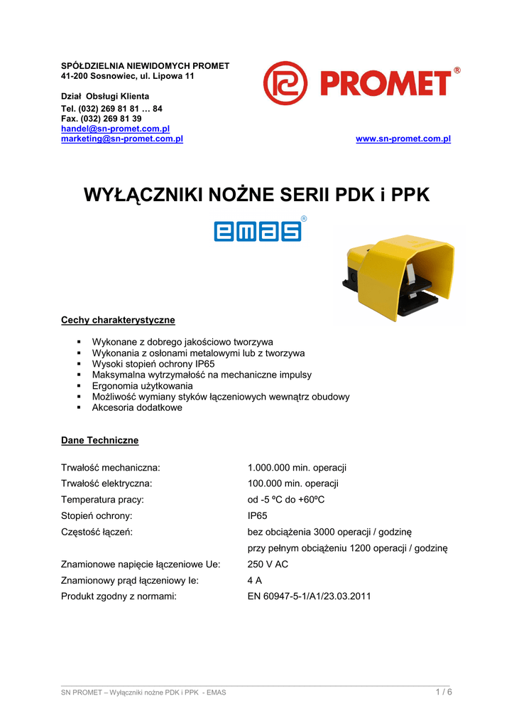 SPÓŁDZIELNIA NIEWIDOMYCH PROMET 41-200 Sosnowiec, ul. Lipowa 11 Dział Obsługi Klienta Tel. (032) 269 81 81 … 84 Fax. (032) 269 81 39 [email protected] [email protected] www.sn-promet.com.pl WYŁĄCZNIKI NOŻNE SERII PDK i PPK Cechy charakterystyczne Wykonane z dobrego jakościowo tworzywa Wykonania z osłonami metalowymi lub z tworzywa Wysoki stopień ochrony IP65 Maksymalna wytrzymałość na mechaniczne impulsy Ergonomia użytkowania Możliwość wymiany styków łączeniowych wewnątrz obudowy Akcesoria dodatkowe Dane Techniczne Trwałość mechaniczna: 1.000.000 min. operacji Trwałość elektryczna: 100.000 min. operacji Temperatura pracy: od -5 ºC do +60ºC Stopień ochrony: IP65 Częstość łączeń: bez obciążenia 3000 operacji / godzinę przy pełnym obciążeniu 1200 operacji / godzinę Znamionowe napięcie łączeniowe Ue: 250 V AC Znamionowy prąd łączeniowy Ie: 4A Produkt zgodny z normami: EN 60947-5-1/A1/23.03.2011 ___________________________________________________________________________ SN PROMET – Wyłączniki nożne PDK i PPK - EMAS 1/6 Pojedyncze wyłączniki nożne z osłonami Zdjęcie Symbol Rodzaj styków Opis Rodzaj wykonania PPKS11BX10 1NO+1NC Wyłącznik nożny w obudowie z tworzywa Osłona z tworzywa Jednostopniowy (jedna prędkość) PDKS11BX10 1NO+1NC Wyłącznik nożny w obudowie z tworzywa Osłona metalowa Jednostopniowy (jedna prędkość) PDKS11GX10 2*(1NO+1NC) Wyłącznik nożny w obudowie z tworzywa Osłona metalowa Jednostopniowy (jedna prędkość) PDKS11GX20 2*(1NO+1NC) Wyłącznik nożny w obudowie z tworzywa Osłona metalowa Dwustopniowy (dwie prędkości) (1NO+1NC) + 2*(1NO+1NC) 2*(1NO+1NC) + (1NO+1NC) Wyłącznik nożny w obudowie z tworzywa Osłona metalowa Wyłącznik nożny w obudowie z tworzywa Osłona metalowa 1NO+1NC Wyłącznik nożny w obudowie z tworzywa Osłona metalowa Stabilny 1NO+1NC Wyłącznik nożny w obudowie z tworzywa Osłona z tworzywa Do montażu akcesoriów Jednostopniowy (jedna prędkość) 2*(1NO+1NC) Wyłącznik nożny w obudowie z tworzywa Osłona metalowa Do montażu akcesoriów Jednostopniowy (jedna prędkość) 2*(1NO+1NC) Wyłącznik nożny w obudowie z tworzywa Osłona metalowa Do montażu akcesoriów Dwustopniowy (dwie prędkości) PDKS11UX20 PDKS11VX20 PDKS11BX30 PDKA11BX10 PDKA11GX10 PDKA11GX20 Dwustopniowy (dwie prędkości) Dwustopniowy (dwie prędkości) ___________________________________________________________________________ SN PROMET – Wyłączniki nożne PDK i PPK - EMAS 2/6 Podwójne wyłączniki nożne z osłonami Zdjęcie Symbol Rodzaj styków Opis Rodzaj wykonania PDKA22BB10 (1NO+1NC) + (1NO+1NC) Wyłączniki nożne w obudowie z tworzywa Osłona z tworzywa Do montażu akcesoriów Jednostopniowe (jedna prędkość) PDKA22BG10 (1NO+1NC) + 2*(1NO+1NC) Wyłączniki nożne w obudowie z tworzywa Osłona z tworzywa Do montażu akcesoriów Jednostopniowe (jedna prędkość) PDKA22GG10 2*(1NO+1NC) + 2*(1NO+1NC) Wyłączniki nożne w obudowie z tworzywa Osłona z tworzywa Do montażu akcesoriów Jednostopniowe (jedna prędkość) PDKA22BG20 (1NO+1NC) + 2*(1NO+1NC) Wyłączniki nożne w obudowie z tworzywa Osłona z tworzywa Do montażu akcesoriów Dwustopniowe (dwie prędkości) PDKA22GG20 2*(1NO+1NC) + 2*(1NO+1NC) Wyłączniki nożne w obudowie z tworzywa Osłona z tworzywa Do montażu akcesoriów Dwustopniowe (dwie prędkości) Wyłączniki nożne bez osłony Zdjęcie Symbol Rodzaj styków PDNS11BX10 1NO+1NC Opis Wyłącznik nożny w obudowie z tworzywa Bez osłony Wyłącznik nożny w obudowie z tworzywa PDNS11GX10 2NO+2NC Bez osłony ___________________________________________________________________________ SN PROMET – Wyłączniki nożne PDK i PPK - EMAS 3/6 Akcesoria Zdjęcie Symbol Opis PDABE Metalowy drążek sterowniczy wyposażony w kasetę z przyciskiem bezpieczeństwa PDABT Metalowy drążek sterowniczy Rysunki wymiarowe PDKS ___________________________________________________________________________ SN PROMET – Wyłączniki nożne PDK i PPK - EMAS 4/6 ___________________________________________________________________________ SN PROMET – Wyłączniki nożne PDK i PPK - EMAS 5/6 ___________________________________________________________________________ SN PROMET – Wyłączniki nożne PDK i PPK - EMAS 6/6