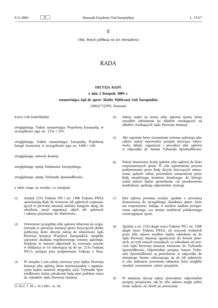 9.11.2004 PL Dziennik Urzędowy Unii Europejskiej L 333/7 II (Akty, których publikacja nie jest obowiązkowa) RADA DECYZJA RADY z dnia 2 listopada 2004 r. ustanawiająca Sąd do spraw Służby Publicznej Unii Europejskiej (2004/752/WE, Euratom) RADA UNII EUROPEJSKIEJ, (4) Należy nadać tej nowej izbie sądowej nazwę, która umożliwi odróżnienie jej składów orzekających od składów orzekających Sądu Pierwszej Instancji. (5) Aby zapewnić łatwe zrozumienie systemu sądowego jako całości, należy wprowadzić przepisy dotyczące właściwości, składu, organizacji i procedury izby sądowej w załączniku do Statutu Trybunału Sprawiedliwości. (6) Należy dostosować liczbę sędziów izby sądowej do ilości rozpoznawanych spraw. W celu usprawnienia procesu podejmowania przez Radę decyzji dotyczących mianowania sędziów należy przewidzieć ustanowienie przez Radę niezależnego komitetu doradczego, do którego zadań należeć będzie sprawdzenie, czy przedstawione kandydatury spełniają odpowiednie wymogi. (7) Izba sądowa powinna orzekać zgodnie z procedurą dostosowaną do szczególnego charakteru spraw, które ma rozpoznawać, badając w każdym stadium postępowania sądowego, czy istnieje możliwość polubownego rozstrzygnięcia sporu. (8) Zgodnie z art. 225a akapit trzeci Traktatu WE i art. 140b akapit trzeci Traktatu EWEA, od orzeczeń wydanych przez izby sądowe możliwe będzie odwołanie się do Sądu Pierwszej Instancji ograniczone do kwestii prawnych, na tych samych warunkach, co odwołania od orzeczeń Sądu Pierwszej Instancji wnoszone do Trybunału Sprawiedliwości. Odpowiednie przepisy Statutu Trybunału Sprawiedliwości są powtórzone w załączniku do niniejszego Statutu odnoszącego się do izb sądowych, w celu uniknięcia stosowania odniesień, które mogłyby utrudnić zrozumienie całości przepisów. (9) W niniejszej decyzji należy przewidzieć odpowiednie przepisy przejściowe, tak by izba sądowa mogła pełnić swoje zadania od chwili jej utworzenia, uwzględniając Traktat ustanawiający Wspólnotę Europejską, w szczególności jego art. 225a i 245, uwzględniając Traktat ustanawiający Europejską Wspólnotę Energii Atomowej, w szczególności jego art. 140b i 160, uwzględniając wniosek Komisji, uwzględniając opinię Parlamentu Europejskiego, uwzględniając opinię Trybunału Sprawiedliwości, a także mając na uwadze, co następuje: (1) Artykuł 225a Traktatu WE i art. 140b Traktatu EWEA upoważniają Radę do tworzenia izb sądowych rozpoznających w pierwszej instancji niektóre kategorie skarg, do określenia zasad organizacji takich izb sądowych i zakresu przyznanej im właściwości. (2) Utworzenie szczególnej izby sądowej właściwej do rozpatrywania w pierwszej instancji spraw dotyczących służby publicznej, które obecnie należą do właściwości Sądu Pierwszej Instancji Wspólnot Europejskich, mogłoby usprawnić działania wspólnotowego systemu sądowego. Działanie to stanowi odpowiedź na wezwanie zawarte w Deklaracji nr 16 odnoszącej się do art. 225a Traktatu WE (1), przyjętej przy podpisywaniu Traktatu z Nicei. (3) W związku z tym należy utworzyć przy Sądzie Pierwszej Instancji izbę sądową, która instytucjonalnie i organizacyjnie będzie stanowić integralną część Trybunału Sprawiedliwości, której członkowie będą mieć podobny status do członków Sądu Pierwszej Instancji. (1) Dz.U. C 80 z 10.3.2001, str. 80. L 333/8 PL Dziennik Urzędowy Unii Europejskiej PRZYJMUJE NINIEJSZĄ DECYZJĘ: Artykuł 1 Przy Sądzie Pierwszej Instancji Wspólnot Europejskich ustanawia się izbę sądową właściwą do orzekania w sprawach dotyczących służby publicznej Unii Europejskiej, zwaną dalej „Sądem do spraw Służby Publicznej Unii Europejskiej”. Siedziba Sądu do spraw Służby Publicznej Unii Europejskiej znajduje się w Sądzie Pierwszej Instancji. Artykuł 2 W Protokole w sprawie Statutu Trybunału Sprawiedliwości wprowadza się następujące zmiany: 1) Wprowadza się tytuł o następującym brzmieniu: „TYTUŁ IV a IZBY SĄDOWE 9.11.2004 2. Niezwłocznie po złożeniu ślubowania przez wszystkich sędziów Sądu do spraw Służby Publicznej Unii Europejskiej przewodniczący Rady przystępuje do wyboru w drodze losowania trzech sędziów tego Sądu, którzy zakończą pełnienie swoich funkcji, na zasadzie odstępstwa od art. 2 akapit drugi zdanie pierwsze załącznika I do Statutu Trybunału Sprawiedliwości, z upływem pierwszych trzech lat kadencji. 3. Sprawy, o których mowa w art. 1 załącznika I do Statutu Trybunału Sprawiedliwości, w których w dniu wejścia w życie tego artykułu wszczęto postępowanie w Sądzie Pierwszej Instancji, ale w których procedura pisemna przewidziana w art. 52 regulaminu Sądu Pierwszej Instancji nie została zakończona, przekazywane są Sądowi do spraw Służby Publicznej Unii Europejskiej. 4. Do wejścia w życie regulaminu Sądu do spraw Służby Publicznej Unii Europejskiej zastosowanie ma mutatis mutandis regulamin Sądu Pierwszej Instancji, z wyjątkiem przepisów dotyczących jednoosobowych składów orzekających. Artykuł 4 Artykuł 62 a Przepisy odnoszące się do właściwości, składu, organizacji i procedury izb sądowych ustanowionych na mocy art. 225a Traktatu WE i 140b Traktatu EWEA są zawarte w załączniku do niniejszego Statutu.”. 2) Dodaje się załącznik I, którego tekst znajduje się w Załączniku do niniejszej decyzji. Niniejsza decyzja wchodzi w życie następnego dniu po jej opublikowaniu w Dzienniku Urzędowym Unii Europejskiej, z wyjątkiem art. 1 załącznika I do Statutu Trybunału Sprawiedliwości, którego tekst znajduje się w załączniku I do niniejszej decyzji. Artykuł 1 załącznika I do Statutu Trybunału Sprawiedliwości wchodzi w życie z dniem opublikowania w Dzienniku Urzędowym Unii Europejskiej decyzji prezesa Trybunału Sprawiedliwości stwierdzającej, że Sąd do spraw Służby Publiczn