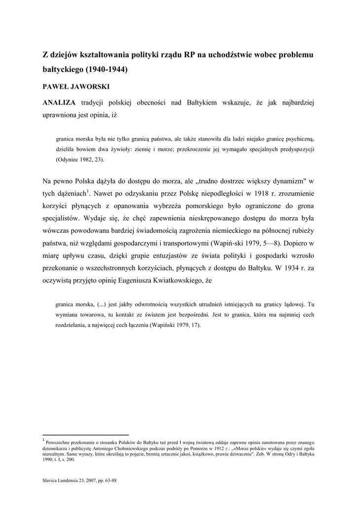 Z dziejów kształtowania polityki rządu RP na uchodźstwie wobec problemu bałtyckiego (1940-1944) PAWEŁ JAWORSKI ANALIZA tradycji polskiej obecności nad Bałtykiem wskazuje, że jak najbardziej uprawniona jest opinia, iż granica morska była nie tylko granicą państwa, ale także stanowiła dla ludzi niejako granicę psychiczną, dzieliła bowiem dwa żywioły: ziemię i morze; przekroczenie jej wymagało specjalnych predyspozycji (Odyniec 1982, 23). Na pewno Polska dążyła do dostępu do morza, ale „trudno dostrzec większy dynamizm" w tych dążeniach1. Nawet po odzyskaniu przez Polskę niepodległości w 1918 r. zrozumienie korzyści płynących z opanowania wybrzeża pomorskiego było ograniczone do grona specjalistów. Wydaje się, że chęć zapewnienia nieskrępowanego dostępu do morza była wówczas powodowana bardziej świadomością zagrożenia niemieckiego na północnej rubieży państwa, niż względami gospodarczymi i transportowymi (Wapiń-ski 1979, 5—8). Dopiero w miarę upływu czasu, dzięki grupie entuzjastów ze świata polityki i gospodarki wzrosło przekonanie o wszechstronnych korzyściach, płynących z dostępu do Bałtyku. W 1934 r. za oczywistą przyjęto opinię Eugeniusza Kwiatkowskiego, że granica morska, (...) jest jakby odwrotnością wszystkich utrudnień istniejących na granicy lądowej. Tu wymiana towarowa, tu kontakt ze światem jest bezpośredni. Jest to granica, która ma najmniej cech rozdzielania, a najwięcej cech łączenia (Wapiński 1979, 17). 1 Powszechne przekonanie o stosunku Polaków do Bałtyku tuż przed I wojną światową oddaje zapewne opinia zanotowana przez znanego dziennikarza i publicystę Antoniego Chołoniewskiego podczas podróży po Pomorzu w 1912 г.: „«Morze polskie» wydaje się czymś zgoła nierealnym. Same wyrazy, które określają to pojęcie, brzmią sztucznie jakoś, książkowo, prawie dziwacznie". Zob. W stronę Odry i Bałtyku 1990, t. I, s. 200. Slavica Lundensia 23, 2007, pp. 63-88 Paweł Jaworski Rozbudowa portu w Gctyni okazała się najlepszą inwestycją międzjfwojennej Polski, poszerzył się horyzont polityczny i gospodarczy państwa polskiego. Okresem szczególnym dla refleksji nad polską obecnością nad Bałtykiem były lata II wojny światowej. Punktem wyjścia podjętych przez rząd polski na emigracji rozważań w tym zakresie, w sposób naturalny, stała się — zakończona klęską — kampania jesienna 1939 r. Szukając przyczyn załamania obrony państwa i niespodziewanie dla wszystkich szybkiego sukcesu wojsk niemieckich, obok innych słabości II Rzeczypospolitej wymieniano szczupłość granicy morskiej (Wrzesiński 1990, 87—88). Dlatego też, kiedy rząd polski rozpoczął prace nad określeniem celów wojny, i tym samym programu terytorialnego, granica morska stała się jednym z kluczowych problemów. Jej rozszerzenie uznano za konieczność dziejową. W kwietniu 1940 r. Oddział III Sztabu Naczelnego Wodza opracował „Studium przyszłej granicy polsko-niemieckiej z punktu widzenia wojskowego", w którym wskazano „najlepsze i najprostsze rozwiązanie strategiczne" w postaci oparcia granicy na Odrze i Nysie Łużyckiej, co zapewniłoby Polsce szeroki dostęp do morza. (W stronę Odry i Bałtyku 1990, t. III, 1219). Precyzując rolę Polski w regionie bałtyckim po wojnie, zaczęto zgłaszać postulaty uwzględniające obecność sojuszników. W listopadzie 1940 r. rząd polski przekazał angielskiemu ministrowi Ernestowi Bevinowi memoriał w sprawie polskich celów wojennych, przekonując, że Polska stanie się „bardzo ważnym partnerem Wielkiej Brytanii" w zakresie problemu bałtyckiego po zakończeniu wojny, zwłaszcza jeśli chodzi o zapewnienie swobodnej komunikacji. Poglądy te były zgodne z tezami opracowania Biura Prac Politycznych Rady Ministrów (przyszłego Ministerstw Prac Kongresowych), dotyczącego zarysu przyszłych granic Polski, w którym precyzowano, że „Polska powinna uzyskać na Bałtyku poza obrębem swych wybrzeży dobrą bazę morska, np. na Born-holmie" (W stronę Odry i Bałtyku 1990, t. III, 30). Postulaty te będą się systematycznie pojawiać w powstających w kręgach rządowych kolejnych referatach na tematy bałtyckie. Wszystkie partie poMtyczne również były zgodne, że granica powinna być przesunięta kosztem Niemiec w kierunku Odry, przy jednoczesnym przyłączeniu do Polski Gdańska i likwidacji niemieckiego 64 Polityka rzadu RP na uchodźstwie wobec problemu bałtyckiego panowania w Prusach Wschodnich. (Szerzej zob. Orzechowski 1969,13-40). Prace studyjne w celu sformułowania programu morskiego mszyły na dobre od jesieni 1941 г., kiedy Polska zajęła stanowisko wobec Karty Adantyckiej2. Rząd RP podpisanie tej deklaracji w sierpniu 1941 r. przyjął z mieszanymi uczuciami. Zastrzeżenia budziło zwłaszcza zagadkowe ujęcie prawa narodów do sprawiedliwości, nie uwzględniającego różnicy między państwami, stawiającymi opór i tymi, które poddały się bez walki. Nie zagwarantowano też rekompensat za straty wojenne i związane z obcą okupacją. (Historia dyplomacji 1999, 267). 18 października 1941 r. minister przemysłu i handlu Henryk Strasburger powołał przy swoim resorcie Radę Morską o charakterze opiniodawczym i doradczym, złożoną z kilkunastu reprezentantów różnych dziedzin gospodarki morskiej. Swoistym echem aktywizacji rządu w sprawach morskich stało się zaakceptowanie nazwy „Bałtyk" dla nowego statku polskiego, do czego, na wniosek ministra Strasburgera, doszło 21 listopada 1941 r.3. W dniu 2 stycznia 1942 r. odbyło się natomiast pierwsze posiedzenie Rady Morskiej, na którym sekretarzem generalnym wybrano ministra Strasburgera. Po reorganizacji resortu nowy minister (od czerwca 1942 r.) Jan Kwapiński rozwiązał dotychczasową Radę Morską i 18 lutego powołał nową — Radę Morską przy Ministrze Przemysłu, Handlu i Żeglugi. Do zadań Rady Morsldej należało wyznaczenie 