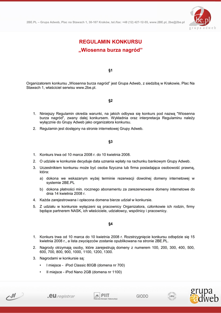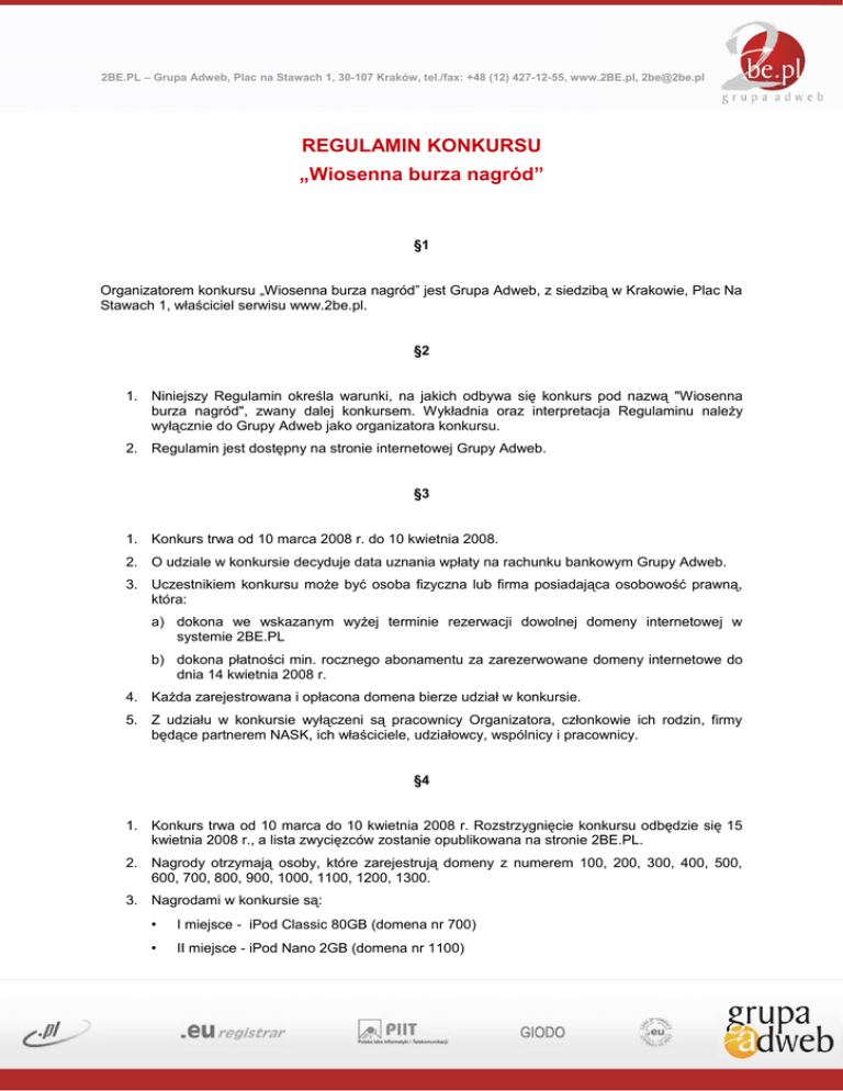 2BE.PL – Grupa Adweb, Plac na Stawach 1, 30-107 Kraków, tel./fax: +48 (12) 427-12-55, www.2BE.pl, [email protected] REGULAMIN KONKURSU „Wiosenna burza nagród” §1 Organizatorem konkursu „Wiosenna burza nagród” jest Grupa Adweb, z siedzibą w Krakowie, Plac Na Stawach 1, właściciel serwisu www.2be.pl. §2 1. Niniejszy Regulamin określa warunki, na jakich odbywa się konkurs pod nazwą "Wiosenna burza nagród", zwany dalej konkursem. Wykładnia oraz interpretacja Regulaminu należy wyłącznie do Grupy Adweb jako organizatora konkursu. 2. Regulamin jest dostępny na stronie internetowej Grupy Adweb. §3 1. Konkurs trwa od 10 marca 2008 r. do 10 kwietnia 2008. 2. O udziale w konkursie decyduje data uznania wpłaty na rachunku bankowym Grupy Adweb. 3. Uczestnikiem konkursu może być osoba fizyczna lub firma posiadająca osobowość prawną, która: a) dokona we wskazanym wyżej terminie rezerwacji dowolnej domeny internetowej w systemie 2BE.PL b) dokona płatności min. rocznego abonamentu za zarezerwowane domeny internetowe do dnia 14 kwietnia 2008 r. 4. Każda zarejestrowana i opłacona domena bierze udział w konkursie. 5. Z udziału w konkursie wyłączeni są pracownicy Organizatora, członkowie ich rodzin, firmy będące partnerem NASK, ich właściciele, udziałowcy, wspólnicy i pracownicy. §4 1. Konkurs trwa od 10 marca do 10 kwietnia 2008 r. Rozstrzygnięcie konkursu odbędzie się 15 kwietnia 2008 r., a lista zwycięzców zostanie opublikowana na stronie 2BE.PL. 2. Nagrody otrzymają osoby, które zarejestrują domeny z numerem 100, 200, 300, 400, 500, 600, 700, 800, 900, 1000, 1100, 1200, 1300. 3. Nagrodami w konkursie są: • I miejsce - iPod Classic 80GB (domena nr 700) • II miejsce - iPod Nano 2GB (domena nr 1100) 2BE.PL – Grupa Adweb, Plac na Stawach 1, 30-107 Kraków, tel./fax: +48 (12) 427-12-55, www.2BE.pl, [email protected] • III miejsce - iPod Shuffle 1GB (domena nr 300) • 10 serwerów wirtualnych PREMIUM ważnych przez 1 rok (pozostałe numery domen podane w pkt 2). 4. Na odebranie nagród zwycięzcy mają czas do 15 maja 2008 r. 5. Nagrody zostaną wysłane do laureatów konkursu do 30 dni od daty publikacji listy zwycięzców na stronie 2BE.PL. Możliwy jest odbiór osobisty w siedzibie Firmy w Krakowie. 6. Prolongata ważności serwera, po upływie abonamentu rocznego, odbywa się na warunkach obowiązujących w momencie odnowienia usługi i wynikających z aktualnego cennika poza okresem promocji. 7. Użytkowanie serwera wirtualnego, będącego nagrodą w konkursie podlega standardowym zasadom, zawartym w Regulaminie Świadczenia Usług Hostingowych Grupy Adweb dostępnym na stronie www.2be.pl/regulamin. 8. Serwer wirtualny, będący nagrodą w konkursie, nie może być przedmiotem odsprzedaży. 9. Laureaci konkursu wyrażają zgodę na publikowanie danych (imienia i nazwy zarejestrowanej domeny) na stronie 2BE.PL. 10. Grupa Adweb nie bierze odpowiedzialności za ewentualne kwestie sporne powstałe z winy osób trzecich.