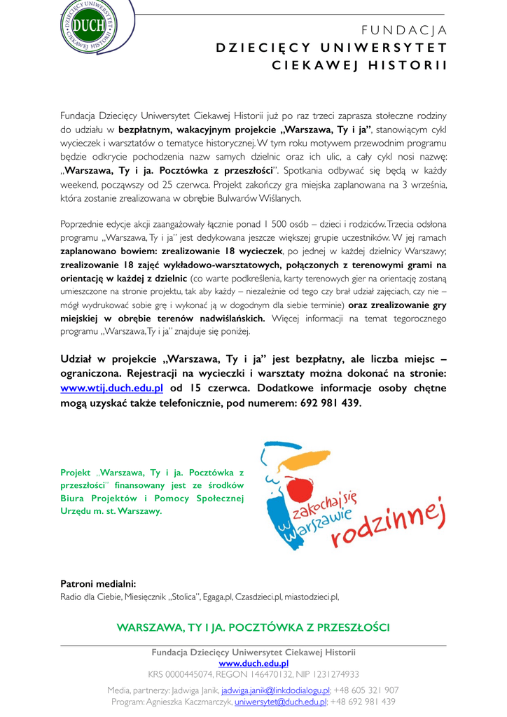 FUNDACJA DZIECIĘCY UNIWERSYTET C I E K AW E J H I S TO R I I Fundacja Dziecięcy Uniwersytet Ciekawej Historii już po raz trzeci zaprasza stołeczne rodziny do udziału w bezpłatnym, wakacyjnym projekcie „Warszawa, Ty i ja”, stanowiącym cykl wycieczek i warsztatów o tematyce historycznej. W tym roku motywem przewodnim programu będzie odkrycie pochodzenia nazw samych dzielnic oraz ich ulic, a cały cykl nosi nazwę: „Warszawa, Ty i ja. Pocztówka z przeszłości”. Spotkania odbywać się będą w każdy weekend, począwszy od 25 czerwca. Projekt zakończy gra miejska zaplanowana na 3 września, która zostanie zrealizowana w obrębie Bulwarów Wiślanych. Poprzednie edycje akcji zaangażowały łącznie ponad 1 500 osób – dzieci i rodziców. Trzecia odsłona programu „Warszawa, Ty i ja” jest dedykowana jeszcze większej grupie uczestników. W jej ramach zaplanowano bowiem: zrealizowanie 18 wycieczek, po jednej w każdej dzielnicy Warszawy; zrealizowanie 18 zajęć wykładowo-warsztatowych, połączonych z terenowymi grami na orientację w każdej z dzielnic (co warte podkreślenia, karty terenowych gier na orientację zostaną umieszczone na stronie projektu, tak aby każdy – niezależnie od tego czy brał udział zajęciach, czy nie – mógł wydrukować sobie grę i wykonać ją w dogodnym dla siebie terminie) oraz zrealizowanie gry miejskiej w obrębie terenów nadwiślańskich. Więcej informacji na temat tegorocznego programu „Warszawa, Ty i ja” znajduje się poniżej. Udział w projekcie „Warszawa, Ty i ja” jest bezpłatny, ale liczba miejsc – ograniczona. Rejestracji na wycieczki i warsztaty można dokonać na stronie: www.wtij.duch.edu.pl od 15 czerwca. Dodatkowe informacje osoby chętne mogą uzyskać także telefonicznie, pod numerem: 692 981 439. Projekt „Warszawa, Ty i ja. Pocztówka z przeszłości” finansowany jest ze środków Biura Projektów i Pomocy Społecznej Urzędu m. st. Warszawy. Patroni medialni: Radio dla Ciebie, Miesięcznik „Stolica”, Egaga.pl, Czasdzieci.pl, miastodzieci.pl, WARSZAWA, TY I JA. POCZTÓWKA Z PRZESZŁOŚCI Fundacja Dziecięcy Uniwersytet Ciekawej Historii www.duch.edu.pl KRS 0000445074, REGON 146470132, NIP 1231274933 Media, partnerzy: Jadwiga Janik, [email protected]; +48 605 321 907 Program: Agnieszka Kaczmarczyk, [email protected]; +48 692 981 439 FUNDACJA DZIECIĘCY UNIWERSYTET C I E K AW E J H I S TO R I I Czy warszawiakom wiadomo, że jeszcze nie tak dawno Mokotów był wsią o nazwie wziętej od pewnego Mokota? Jeśli nie, to nadarza się idealna okazja, aby w przyjemnej formie poznać historyczne ciekawostki na temat poszczególnych dzielnic stolicy! W tym roku Fundacja Dziecięcy Uniwersytet Ciekawej Historii chce zapoznać najmłodszych mieszkańców Warszawy i ich rodziców z historią zarówno nazw dzielnic, jak i nazw poszczególnych ulic. Ten pomysł doskonale wpisuje się w 100. rocznicę poszerzenia granic miasta, gdyż właśnie nazwy nadawane ulicom i dzielnicom są nierozerwalnie związane z pochodzeniem poszczególnych miejsc, a także historią ludzi, którzy byli z nimi związani. Wycieczki odbywać się będą w weekendy. Każda rodzina, która zarejestruje się na stronie internetowej projektu będzie mogła uczestniczyć w dowolnej liczbie wycieczek, niekoniecznie tylko w dzielnicy zamieszkania. Uczestnictwo w wycieczce będzie punktowane pieczątką na specjalnej karcie uczestnika, stanowiącej jednocześnie mapę Warszawy. Marszruty zostały opracowane przez varsavianistów, a każdą wycieczkę poprowadzą wykwalifikowani przewodnicy. W tym roku w ramach programu „Warszawa, Ty i ja” zaplanowano także weekendowe zajęcia wykładowowarsztatowe, stanowiące samodzielną ofertą edukacyjną dla rodzin z dziećmi, ale również uzupełnienie wycieczek. W czasie zajęć odbywać się będzie pogadanka o znanej postaci dzielnicy, warsztat historyczny oparty na biogramie tej postaci oraz historii miasta okresu jej życia. Następnie każda rodzina otrzyma kartę terenowej gry na orientację, której punkty rozmieszczone będą w okolicy, a zadania będą powiązane w wcześniejszym wykładem. Każda rodzina będzie musiała odnaleźć w terenie i wykonać zamieszczone na karcie zadania. Karty terenowych gier na orientację zostaną ponadto umieszczone na stronie projektu, z możliwością wydrukowania i zrealizowania w dowolnej dzielnicy, w wybranym czasie. Trzecim etapem projektu „Warszawa, Ty i ja. Pocztówka z przeszłości” jest historyczna gra miejska dla rodzin, rozegrana na terenach nadwiślańskich, a w szczególności na terenie Bulwarów Wiślanych. Organizatorzy do gry miejskiej zapraszają nie tylko rodziny biorące udział w wycieczkach, ale także wszystkich chętnych. Intryga gry będzie oparta na historii słynnego przedwojennego cyrku Braci Staniewskich, którego dzieje są dziś bardzo mało znane, zaś przed wojną cyrk ten cieszył się światową sławą. Na koniec gry uczestnicy wezmą udział w pokazie sztuki cyrkowej autorstwa prawdziwych cyrkowców. Fundacja Dziecięcy Uniwersytet Ciekawej Historii powstała, aby szerzyć wśród dzieci i młodzieży znajomość historii Polski i świata we wszystkich jej aspektach. Projekty realizowane w ramach DUCHa utrzymane są na najwyższym poziomie merytorycznym. Prowadzone są w sposób niekonwencjonalny, angażujący uczestników i budzący fascynację młodego odbiorcy. Fundacja współpracuje z wieloma instytucjami edukacyjnymi i historycznymi (m.in. UW, UŁ, Zamkiem Królewskim w Warszawie, DSH, Muzeum Warszawy), a także jest laureatem wielu nagród i wyróżnień, np. tytułu Miejsce Odkrywania Talentów, nagrody głównej Komitetu Ochrony Praw Dziecka w konkursie Miejsce Przyjazne Dziecku, nagrody rodziców w konkursie Słoneczniki 2014 przyznanej przez portal Czasdzieci.pl. www.duch.edu.pl Harmonogram projektu, tematy poszczególnych wycieczek oraz warsztatów: Fundacja Dziecięcy Uniwersytet Ciekawej H