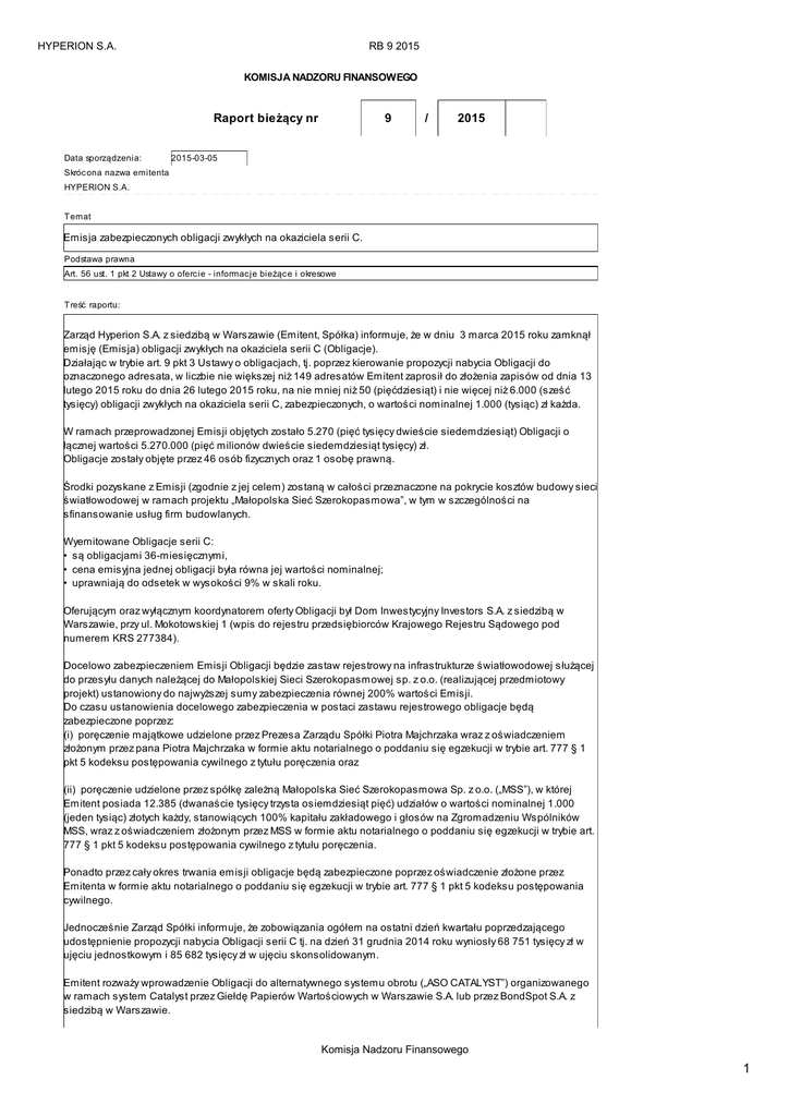 HYPERION S.A. RB 9 2015 KOMISJA NADZORU FINANSOWEGO Raport bieżący nr Data sporządzenia: 9 / 2015 2015-03-05 Skróc ona nazwa emitenta HYPERION S.A. Temat Emisja zabezpieczonych obligacji zwykłych na okaziciela serii C. Podstawa prawna Art. 56 ust. 1 pkt 2 Ustawy o oferc ie - informac je bieżąc e i okresowe Treść raportu: Zarząd Hyperion S.A. z siedzibą w Warszawie (Emitent, Spółka) informuje, że w dniu 3 marca 2015 roku zamknął emisję (Emisja) obligacji zwykłych na okaziciela serii C (Obligacje). Działając w trybie art. 9 pkt 3 Ustawy o obligacjach, tj. poprzez kierowanie propozycji nabycia Obligacji do oznaczonego adresata, w liczbie nie większej niż 149 adresatów Emitent zaprosił do złożenia zapisów od dnia 13 lutego 2015 roku do dnia 26 lutego 2015 roku, na nie mniej niż 50 (pięćdziesiąt) i nie więcej niż 6.000 (sześć tysięcy) obligacji zwykłych na okaziciela serii C, zabezpieczonych, o wartości nominalnej 1.000 (tysiąc) zł każda. W ramach przeprowadzonej Emisji objętych zostało 5.270 (pięć tysięcy dwieście siedemdziesiąt) Obligacji o łącznej wartości 5.270.000 (pięć milionów dwieście siedemdziesiąt tysięcy) zł. Obligacje zostały objęte przez 46 osób fizycznych oraz 1 osobę prawną. Środki pozyskane z Emisji (zgodnie z jej celem) zostaną w całości przeznaczone na pokrycie kosztów budowy sieci światłowodowej w ramach projektu „Małopolska Sieć Szerokopasmowa”, w tym w szczególności na sfinansowanie usług firm budowlanych. Wyemitowane Obligacje serii C: • są obligacjami 36-miesięcznymi, • cena emisyjna jednej obligacji była równa jej wartości nominalnej; • uprawniają do odsetek w wysokości 9% w skali roku. Oferującym oraz wyłącznym koordynatorem oferty Obligacji był Dom Inwestycyjny Investors S.A. z siedzibą w Warszawie, przy ul. Mokotowskiej 1 (wpis do rejestru przedsiębiorców Krajowego Rejestru Sądowego pod numerem KRS 277384). Docelowo zabezpieczeniem Emisji Obligacji będzie zastaw rejestrowy na infrastrukturze światłowodowej służącej do przesyłu danych należącej do Małopolskiej Sieci Szerokopasmowej sp. z o.o. (realizującej przedmiotowy projekt) ustanowiony do najwyższej sumy zabezpieczenia równej 200% wartości Emisji. Do czasu ustanowienia docelowego zabezpieczenia w postaci zastawu rejestrowego obligacje będą zabezpieczone poprzez: (i) poręczenie majątkowe udzielone przez Prezesa Zarządu Spółki Piotra Majchrzaka wraz z oświadczeniem złożonym przez pana Piotra Majchrzaka w formie aktu notarialnego o poddaniu się egzekucji w trybie art. 777 § 1 pkt 5 kodeksu postępowania cywilnego z tytułu poręczenia oraz (ii) poręczenie udzielone przez spółkę zależną Małopolska Sieć Szerokopasmowa Sp. z o.o. („MSS”), w której Emitent posiada 12.385 (dwanaście tysięcy trzysta osiemdziesiąt pięć) udziałów o wartości nominalnej 1.000 (jeden tysiąc) złotych każdy, stanowiących 100% kapitału zakładowego i głosów na Zgromadzeniu Wspólników MSS, wraz z oświadczeniem złożonym przez MSS w formie aktu notarialnego o poddaniu się egzekucji w trybie art. 777 § 1 pkt 5 kodeksu postępowania cywilnego z tytułu poręczenia. Ponadto przez cały okres trwania emisji obligacje będą zabezpieczone poprzez oświadczenie złożone przez Emitenta w formie aktu notarialnego o poddaniu się egzekucji w trybie art. 777 § 1 pkt 5 kodeksu postępowania cywilnego. Jednocześnie Zarząd Spółki informuje, że zobowiązania ogółem na ostatni dzień kwartału poprzedzającego udostępnienie propozycji nabycia Obligacji serii C tj. na dzień 31 grudnia 2014 roku wyniosły 68 751 tysięcy zł w ujęciu jednostkowym i 85 682 tysięcy zł w ujęciu skonsolidowanym. Emitent rozważy wprowadzenie Obligacji do alternatywnego systemu obrotu („ASO CATALYST”) organizowanego w ramach system Catalyst przez Giełdę Papierów Wartościowych w Warszawie S.A. lub przez BondSpot S.A. z siedzibą w Warszawie. Komisja Nadzoru Finansowego 1 HYPERION S.A. RB 9 2015 Jednocześnie Emitent nadmienia, że w grudniu 2014 roku zamknął z powodzeniem emisję 10.000 obligacji zwykłych na okaziciela serii B zabezpieczonych o wartości nominalnej 1.000,- zł każda, z której środki zostały przeznaczone na pokrycie kosztów budowy sieci światłowodowej w ramach projektu „Małopolska Sieć Szerokopasmowa”. Podstawa prawna: § 5.1 pkt 11) Rozporządzenia Ministra Finansów z dnia 19 lutego 2009 roku w sprawie informacji bieżących i okresowych przekazywanych przez emitentów papierów wartościowych oraz warunków uznawania za równoważne informacji wymaganych przepisami prawa państwa niebędącego państwem członkowskim (Dz. U. z 2009 r. Nr 33, poz. 259 z późn. zm.). Hyperion Spółka Akcyjna (pełna nazwa emitenta) HYPERION S.A. Telekomunikacja (tel) (skróc ona nazwa emitenta) 00-535 (sektor wg. klasyfikac ji GPW w W-wie) Warszawa (kod poc ztowy) (miejscowość) Plac Trzec h Krzyży 3 (ulica) (numer) 032 7350389 032 6099217 (telefon) (fax) [email protected] www.hyperion.pl (e-mail) (www) 8133088162 690694666 (NIP) (REGON) PODPISY OSÓB REPREZENTUJĄCYCH SPÓŁKĘ Data Imię i Nazwisko Stanowisko/Funkc ja 2015-03-05 Piotr Majc hrzak Prrezes Zarządu 2015-03-05 Marian Halic ki Wic eprezes Zarządu Podpis Komisja Nadzoru Finansowego 2