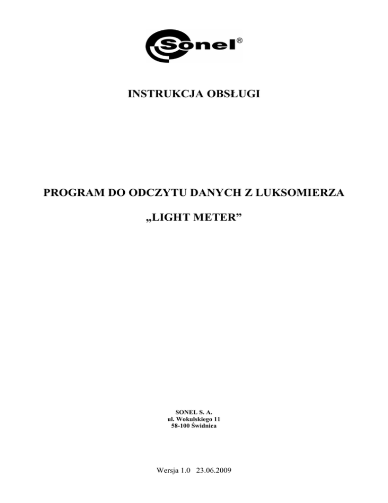 INSTRUKCJA OBSŁUGI PROGRAM DO ODCZYTU DANYCH Z LUKSOMIERZA „LIGHT METER” SONEL S. A. ul. Wokulskiego 11 58-100 Świdnica Wersja 1.0 23.06.2009 1. Wymagania systemowe i sprzętowe. Program wymaga systemu Windows 2000 lub Windows XP. Minimalne wymagania sprzętowe to komputer PC lub NoteBook z Pentium 90MHz lub wyŜszym, 32MB RAM oraz 7MB wolnej przestrzeni na dysku. Rekomendowana rozdzielczość ekranu to 1024x768 pikseli (16 bitów). Program obsługuje porty COM od 1 do 16. 2. Instalacja programu. UWAGA: Nie naleŜy podłączać miernika przed zainstalowaniem sterowników. Po zainstalowaniu programu instalator automatycznie przejdzie do instalacji sterownika. Po włoŜeniu płyty do napędu naleŜy wybrać instalację programu „Light Meter”, a następnie postępować według wskazań instalatora. 3. Uruchomienie. Po zainstalowaniu, program uruchamia się klikając na ikonę Light Meter na pulpicie (lub w menu Start). Uruchomi się okno programu, brak podłączonego luksomierza sygnalizowany jest napisem „OFFLINE” po lewej stronie okna, na tle miernika. Rysunek 1. Brak podłączonego miernika. NaleŜy podłączyć miernik. JeŜeli podłączenie jest poprawne w miejscu komunikatu „OFFLINE” pojawią się, przesyłane w czasie rzeczywistym, dane wyświetlane przez miernik,. 1 Rysunek 2. Luksomierz prawidłowo podłączony, na wizualizacji bieŜące dane z miernika. Istnieje moŜliwość sterowania miernikiem spod poziomu programu, klikając myszką na przyciski wizualizacji miernika, wszystkie przyciski oprócz włącz/wyłącz są aktywne. 4. Tryb „Real Time”. W celu rejestracji bieŜących wskazań luksomierza oraz wyświetlenia ich na wykresie naleŜy przycisnąć ikonę na pasku ikon lub z menu „Real Time” wybrać opcję „Run”. Pojawi się okno ustawienia częstotliwości próbkowania w sekundach (Sample Rate). NaleŜy wpisać Ŝądaną wartość i potwierdzić przyciskiem „OK”. Program w czasie rzeczywistym wyświetla komplet danych pobieranych z miernika: • Voltage state – poziom naładowania baterii, • Sample Rate – częstotliwość próbkowania, • Start Time – czas rozpoczęcia rejestracji, • Data no. – numer aktualnie zapisywanej próbki, • Max. – maksymalna zarejestrowana wartość natęŜenia światła, • Min. – minimalna zarejestrowana wartość natęŜenia światła, • Time – czas kiedy zostały zarejestrowane odpowiednio minimalna lub maksymalna wartość natęŜenia światła, • Avg – średnia wartość rejestrowanego natęŜenia światła. Dodatkowo wartość natęŜenia światła wyświetlana jest na wykresie. Przyciskiem „YAxis” moŜna zmienić ustawienia osi wartości natęŜenia światła. Rejestrację zatrzymuje się poprzez wybranie z menu „Real Time” opcji „Stop” lub przyciskając ikonę . Wybrane fragmenty wykresu moŜna powiększyć zaznaczając je myszką (podczas trzymania prawego przycisku myszy i przeciągania pojawi się prostokąt zaznaczenia). Powrót do widoku pełnego wykresu następuje poprzez wybranie ikony . 2 Rysunek 3. Okno z wykresem aktualnych wartości natęŜenia światła. Rejestrowane dane moŜna zapisać wybierając ikonę dyskietki lub poprzez wybranie z menu „File” opcji „Save”. Otwarcie zapisanych do pliku danych umoŜliwia przycisk opcja „Open” w menu „File”. lub 5. Odczyt danych z rejestratora i pamięci. Odczyt danych z rejestratora (Logger) wykonuje się naciskając na „Data Logger” w górnym menu programu. Dla odczytu danych z pamięci naleŜy wybrać „Mem”. Odczytane dane moŜemy zapisać na dysku naciskając ikonę wydrukować , dodać do nich kolejne dane wybierając lub . 3 Rysunek 4. Okno z danym pobranymi z pamięci luksomierza. 6. Pomoc. Pomoc programu dostępna jest poprzez wybranie „Contents” z górnego menu „Help” lub poprzez kliknięcie na ikonę wersją programu. . Opcja „About LightMeter…” w menu „Help” wyświetla okno z 4