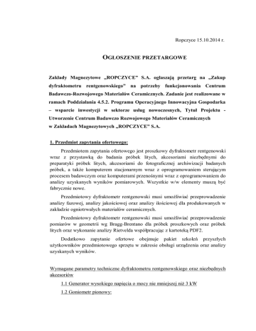 Ropczyce 15.10.2014 r. OGŁOSZENIE PRZETARGOWE Zakłady Magnezytowe „ROPCZYCE” S.A. ogłaszają przetarg na „Zakup dyfraktometru rentgenowskiego” na potrzeby funkcjonowania Centrum Badawczo-Rozwojowego Materiałów Ceramicznych. Zadanie jest realizowane w ramach Poddziałania 4.5.2. Programu Operacyjnego Innowacyjna Gospodarka – wsparcie inwestycji w sektorze usług nowoczesnych, Tytuł Projektu Utworzenie Centrum Badawczo Rozwojowego Materiałów Ceramicznych w Zakładach Magnezytowych „ROPCZYCE” S.A. 1. Przedmiot zapytania ofertowego: Przedmiotem zapytania ofertowego jest proszkowy dyfraktometr rentgenowski wraz z przystawką do badania próbek litych, akcesoriami niezbędnymi do preparatyki próbek litych, akcesoriami do fotograficznej archiwizacji badanych próbek, a także komputerem stacjonarnym wraz z oprogramowaniem sterującym procesem badawczym oraz komputerami przenośnymi wraz z oprogramowaniem do analizy uzyskanych wyników pomiarowych. Wszystkie w/w elementy muszą być fabrycznie nowe. Przedmiotowy dyfraktometr rentgenowski musi umożliwiać przeprowadzenie analizy fazowej, analizy jakościowej oraz analizy ilościowej dla produkowanych w zakładzie ogniotrwałych materiałów ceramicznych. Przedmiotowy dyfraktometr rentgenowski musi umożliwiać przeprowadzenie pomiarów w geometrii wg Bragg-Brentano dla próbek proszkowych oraz próbek litych oraz wykonanie analizy Rietvelda współpracując z kartoteką PDF2. Dodatkowo zapytanie ofertowe obejmuje pakiet szkoleń przyszłych użytkowników przedmiotowego sprzętu w zakresie obsługi urządzenia oraz analizy uzyskanych wyników. Wymagane parametry techniczne dyfraktometru rentgenowskiego oraz niezbędnych akcesoriów 1.1 Generator wysokiego napięcia o mocy nie mniejszej niż 3 kW 1.2 Goniometr pionowy: minimalny programowalny krok pomiarowy - nie większy niż 0,001° zakres kątowy 2θ - nie węższy niż zakres od -110° do plus 168° niezależny, sterowalny ruch ramion lampy i detektora dostępna geometria urządzenia: Theta-Theta oraz Theta-2Theta automatyczna adjustacja po zmianie konfiguracji geometrii urządzenia 1.3 Lampa rentgenowska o anodzie miedzianej (Cu) komplet filtrów Kβ odpowiednich dla lampy Cu + 1 komplet zapasowy moc lampy – nie mniejsza niż 2,0 kW gwarantowany czas pracy lampy – nie krótszy niż 2000 h możliwość zmiany ogniska punktowego na liniowe i odwrotnie bez konieczności re-justowania dyfraktometru ani wyjmowania lampy z obudowy zapasowa lampa Cu identyczna z powyższą, dostarczana na żądanie w ciągu 7 dni roboczych 1.4 Lampa rentgenowska o anodzie kobaltowej (Co) komplet filtrów Kβ odpowiednich dla lampy Co + 1 komplet zapasowy moc lampy – nie mniejsza niż 1,8 kW gwarantowany czas pracy lampy – nie krótszy niż 2000 h możliwość zmiany ogniska punktowego na liniowe i odwrotnie bez konieczności re-justowania dyfraktometru ani wyjmowania lampy z obudowy 1.5 Optyka wiązki pierwotnej komplet szczelin Sollera dla wiązki pierwotnej i wtórnej o szerokości 0,04 radiana oraz 0,02 radiana programowalna szczelina przeciwrozproszeniowa 1.6 Optyka wiązki ugiętej oraz detekcja programowalna szczelina przeciwrozproszeniowa detektor półprzewodnikowy rastrowy z maksymalną średnicą pojedynczego piksela nie większą niż 60 μm detektor pracujący w trybach 0D i 1D 1.7 Konsola/obudowa dyfraktometru konsola dyfraktometru z obudową przeciwradiacyjną, spełniającą normy bezpieczeństwa, spełniającą warunek promieniowania < 1µSv/godz. w odległości 10 cm od obudowy 1.8 Stoliki próbek uchwyt stalowy do próbek proszkowych o średnicy nie mniejszej niż 25 mm oraz nie większej niż 30 mm w ilości 9 sztuk uchwyt stalowy do próbek proszkowych o średnicy nie mniejszej niż 14 mm oraz nie większej niż 18 mm w ilości 3 sztuk uchwyt stalowy do próbek litych, o głębokości nie mniejszej niż 60 mm w ilości 3 sztuk stolik odbiciowo-transmisyjny z obracarką próbek przesłona nożowa do stolika z obracarką stolik do prasowania próbek proszkowych w uchwytach pierścieniowych zmieniarka próbek - na minimalną ilość 15 próbek 1.9 Komora wysokotemperaturowa możliwość prowadzenia pomiaru w temperaturze do 2000°C platynowy element grzejny + 1 sztuka zapasowa wolframowy element grzejny + 1 sztuka zapasowa 1.10 Układ chłodzący układ chłodzenia zapewniający chłodzenie dyfraktometru pracujący w trybie woda-woda – musi zapewniać odpowiednią wydajność również w przypadku pracy dyfraktometru z komorą wysokotemperaturową 1.11 Przecinarka precyzyjna do przygotowania próbek litych moc silnika nie mniejsza niż 2 kW prędkość obrotowa tarczy tnącej nie mniej niż 2500 rpm kompatybilność z tarczami tnącymi o średnicy 200 lub 250 mm stół roboczy przecinarki nie mniejszy niż 200x300 mm głębokość cięcia – nie mniej niż 80 mm uchwyty imadłowy szybkomocujący oraz uchwyt sprężynowy do precyzyjnego wycinania kostek z kształtek materiałów ceramicznych - umożliwiające wycięcie kostek o wymiarach 15x15x5 mm ściernica diamentowa przystosowana do cięcia materiałów ceramicznych – ilość ściernic w zestawie nie mniej niż 2 sztuki 1.12 Komputer stacjonarny sterujący procesem pomiarowym wraz z drukarką czterordzeniowy procesor co najmniej klasy Core i7 (lub równoważny) o częstotliwości minimum 3,6 GHz pamięć operacyjna minimum 16 GB dysk twardy o pojemności minimalnej 1TB nagrywarka DVD karta sieciowa WLAN klawiatura + mysz gwarancja minimum 36 miesięcy system operacyjny kompatybilny z dostarczonym oprogramowaniem sterującym do dyfraktometru rentgenowskiego oraz z dostarczonym oprogramowaniem do analizy dyfraktogramów rentgenowskich drukarka kolorowa laserowa monitor spełniający poniższe kryteria: - przekątna ekranu nie mniejsza niż 27 cali - rozdzielczość ekranu 2560x1440 punktów - typ matrycy: PLS lub IPS lub AH-IPS - złącza: DisplayPort, DVI-D, HDMI, USB - gwarancja: minimum 36 miesięcy 1.13 Komp
