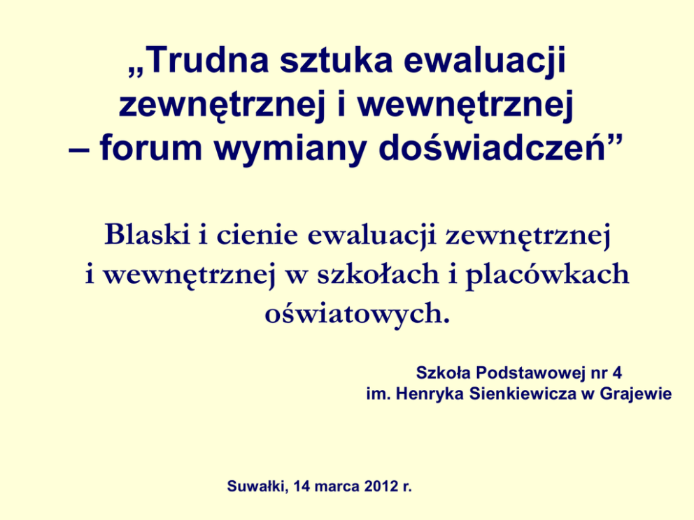 „Trudna sztuka ewaluacji zewnętrznej i wewnętrznej – forum wymiany doświadczeń” Blaski i cienie ewaluacji zewnętrznej i wewnętrznej w szkołach i placówkach oświatowych. Szkoła Podstawowej nr 4 im. Henryka Sienkiewicza w Grajewie Suwałki, 14 marca 2012 r. W roku szkolnym 2011/2012 w dniach od 7 października 2011 do 6 listopada 2011 w szkole została przeprowadzona ewaluacja zewnętrzna w obszarze Zarządzanie „Gdy nie jesteś pewien dokąd zmierzasz, łatwo wylądujesz gdzie indziej i nawet się o tym nie dowiesz." Robert Mayer Trud określenia wartości własnych działań w wybranym obszarze; rola ewaluatora i decydenta Uczymy się Ulepszamy jakieś obszary własnej pracy Ewaluacja wewnętrzna Aktualne potrzeby szkoły Proponowanie rozwiązań, które mogą przyczynić się do poprawy jakiegoś obszaru pracy szkoły Dostarczanie prawdziwej informacji o stanie faktycznym badanych obszarów Ewaluacja wewnętrzna (właściwa osoba na właściwym miejscu) • Znajomość warunków pracy szkoły • Znajomość środowiska lokalnego • Zdolność przewidywania problemów, które mogą wystąpić • Zdolność podejmowania decyzji • Łatwość komunikowania się z innymi • Dyspozycyjność Oswajanie problemów niebezpieczeństwo wybielania rzeczywistości, omijania występujących trudności (ewaluacja pozorna) • Brak gotowości metodologicznej do prowadzenia ewaluacji (niezbędne minimum teorii na temat istoty ewaluacji, umiejętność formułowania pytań kluczowych, umiejętność konstruowania narzędzi badawczych, umiejętność analizowania danych i wyciągania wniosków, przygotowywanie raportu i jego wykorzystanie) - Prof. Henryk Mizerek „Konieczne jest budowanie pytań o możliwie wysokim stopniu ogólności” (?) - niezbyt długa lista pytań kluczowych, bo jak potem uporać się z raportem • Problemy w skutecznym działaniu zespołowym nauczycieli • Powszechne ukierunkowanie szkół na wymagania Państwa zamiast na własne potrzeby • Błędna interpretacja dotycząca pozyskiwania materiału badawczego (nie wiązać z faktem, że będę oceniony i „rozliczony”) • „Sztuka dla sztuki”, czyli brak wykorzystania wniosków z ewaluacji wewnętrznej w praktyce bądź pozostawienie ich realizacji na barkach dyrekcji Radość ewaluatora (odnajdywanie zaufania do siebie) • Podkreślenie roli Rady Pedagogicznej • Integrująca funkcja prowadzonych działań i czynności • Wykorzystywanie swojego potencjału intelektualnego (każdy stawia swoją cegiełkę) • Praca zespołowa bardziej efektywna i ukierunkowana na cel • Utożsamianie się z wynikami ewaluacji • Nastawienie na rzeczywisty rozwój ucznia, a nie tworzenie dokumentów • Refleksyjne spojrzenie na swoją pracę Są takie wartości tkwiące w ewaluacji, które są zawsze aktualne (niezależnie od trendów, rozporządzeń, wymogów Państwa) tu: - praca zespołowa/komunikowanie się - autorefleksja - postawa aktywna - swoista czujność dotycząca własnej pracy i funkcjonowania szkoły Ewaluacja zewnętrzna, czyli poziom spełniania wymagań przez szkołę (zanim przyjedzie wizytator ewaluator) • Przypomnienie rozporządzenia MEN z dnia 7 października 2009 r. w sprawie nadzoru pedagogicznego z wyeksponowaniem treści Załącznika • Dyskusje koleżeńsko – dyrektorskie oraz rodzicielskie dotyczące organizacji badań ich wagi i konsekwencji w życiu szkoły i środowiska lokalnego (przygotowanie pracowni komputerowych, organizacja dyżurów i zastępstw, organizacja pracy dyrektora i wicedyrektorów, harmonogram obserwacji zajęć i analizy dokumentów, harmonogram spotkań z przedstawicielami Rady Pedagogicznej, Komitetu Rodzicielskiego, przedstawicielami administracji i obsługi oraz środowiska lokalnego) • Ogarnięcie refleksją swojej przynależności zespołowej – zestawienie rodzajów zespołów nauczycieli pracujących w szkole w ciągu ostatnich dwóch lat ( dyrekcja + nauczyciele) Ewaluacja zewnętrzna, czyli poziom spełniania wymagań przez szkołę (zanim przyjedzie wizytator ewaluator) • Zestawienie efektów pracy zespołowej • Spotkanie z liderami zespołów przedmiotowo zadaniowych odnośnie ewaluacji zewnętrznej i jej organizacji • Spotkanie z przedstawicielami administracji i obsługi ukierunkowane na omówienie istoty ewaluacji zewnętrznej w odróżnieniu od ewaluacji wewnętrznej, a także udzielenie wszechstronnej pomocy wizytatorom ewaluatorom • Przygotowanie dokumentów zawierających informacje z obszaru Zarządzanie • Dyskusje koleżeńskie nad pytaniami, które mogą się pojawić podczas prowadzenia ewaluacji zewnętrznej (analiza opublikowanych raportów, fora internetowe) Ewaluacja zewnętrzna, czyli wizytatorzy ewaluatorzy już w szkole • Wielki takt i życzliwość w przeprowadzaniu wszelkich czynności ewaluacyjnych • Precyzyjne, merytoryczne ustalenie kolejnych czynności wespół z dyrektorem • Docenienie zdania uczniów o szkole, ich zadowolenie i refleksyjne spojrzenie na tę szkołę • Pytania kierowane do pracowników były precyzyjnie formułowane i nie sprawiały trudności w prowadzeniu rozmowy • Umocnienie pozycji szkoły w środowisku lokalnym (szkoła otwarta na współpracę z innymi) • Uroczyste podsumowanie ewaluacji zewnętrznej z udziałem dyrektora Delegatury KO w Suwałkach (każdy poczuł się doceniony i stałoby się tak również w przypadku uzyskania niższego poziomu wymagań; praca szkoły widziana przez pryzmat pojedynczego człowieka) Ewaluacja zewnętrzna Okiem dyrektora • • • • • • • • Dyspozycyjność Utrudnienie w załatwianiu spraw bieżących Przygotowywanie dokumentów (ich mnogość) Obawa, czy ankietowani rodzice uczniów klas V dostrzegają mój wysiłek w poprawę bazy materialnej szkoły i jej wyposażenie Nieprzemyślana, nietrafiona wersja ankiety dla rodziców (1 pytanie; przerost formy nad treścią) Budowa ankiet (zdecydowanie najsłabsza strona) - bra