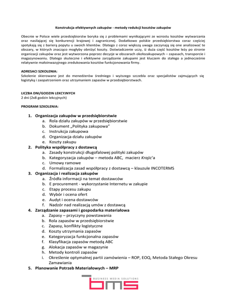 Konstrukcja efektywnych zakupów - metody redukcji kosztów zakupów Obecnie w Polsce wiele przedsiębiorstw boryka się z problemami wynikającymi ze wzrostu kosztów wytwarzania oraz nasilającej się konkurencji krajowej i zagranicznej. Dodatkowo polskie przedsiębiorstwa coraz częściej spotykają się z barierą popytu u swoich klientów. Dlatego z coraz większą uwaga zaczynają się one analizować te obszary, w których znacząco mogłyby obniżyć koszty. Doświadczenie uczy, iż duża część kosztów leży po stronie organizacji zakupów oraz jest wytworzona poprzez decyzje w obszarach okołozakupowych – zapasach, transporcie i magazynowaniu. Dlatego skuteczne i efektywne zarządzanie zakupami jest kluczem do stałego a jednocześnie relatywnie małoinwazyjnego zredukowania kosztów funkcjonowania firmy. ADRESACI SZKOLENIA: Szkolenie skierowane jest do menedżerów średniego i wyższego szczebla oraz specjalistów zajmujących się logistyką i zaopatrzeniem oraz utrzymaniem zapasów w przedsiębiorstwach. LICZBA DNI/GODZIN LEKCYJNYCH 2 dni (2x8 godzin lekcyjnych) PROGRAM SZKOLENIA: 1. Organizacja zakupów w przedsiębiorstwie a. Rola działu zakupów w przedsiębiorstwie b. Dokument „Polityka zakupowa” c. Instrukcja zakupowa d. Organizacja działu zakupów e. Koszty zakupu 2. Polityka współpracy z dostawcą a. Zasady konstrukcji długofalowej polityki zakupów b. Kategoryzacja zakupów – metoda ABC, macierz Krajic'a c. Umowy ramowe d. Formalizacja zasad współpracy z dostawcą – klauzule INCOTERMS 3. Organizacja i realizacja zakupów a. Źródła informacji na temat dostawców b. E procurement - wykorzystanie Internetu w zakupie c. Etapy procesu zakupu d. Wybór i ocena ofert e. Audyt i ocena dostawców f. Nadzór nad realizacją umów z dostawcą 4. Zarządzanie zapasami i gospodarka materiałowa a. Zapasy – przyczyny powstawania b. Rola zapasów w przedsiębiorstwie c. Zapasy, konflikty logistyczne d. Koszty utrzymania zapasów e. Kategoryzacja funkcjonalna zapasów f. Klasyfikacja zapasów metodą ABC g. Alokacja zapasów w magazynie h. Metody kontroli zapasów i. Określenie optymalnej partii zamówienia – ROP, EOQ, Metoda Stałego Okresu Zamawiania 5. Planowanie Potrzeb Materiałowych – MRP a. Koncepcja MRP b. Planowanie MRP c. LRP 6. Transport w zakupach a. Kryteria wyboru środka transportu; wybór transportu swój - obcy b. Konsolidacja w transporcie c. Ocena przewoźnika 7. Minimalizacja ryzyka w zakupach a. Źródła ryzyka związanego z zakupami b. Ryzyko związane z dostawcą c. Ocena ryzyka d. Metody uniezależnienia się od dostawcy, dostawcy alternatywni e. Zasady postępowania z dużymi dostawcami lub monopolistami ELE SZKOLENIA: Celem szkolenia jest: Poznanie nowoczesnych metod redukcji kosztów zakupów Identyfikacja bezpośrednich i pośrednich czynników wpływających na decyzję o zakupie Przedstawienie zasad konstrukcji łańcuchów dostaw Zwrócenie uwagi na koszty powstające w łańcuchu dostaw Zapoznanie się z technikami oceny i kwalifikacji dostawców Zasady radzenia sobie z monopolem po stronie dostawcy Przedstawienie zachodnioeuropejskich rozwiązań w zakresie zaopatrzenia Poznanie metod kalkulacji cen przez dostawców Przedstawienie metod kalkulacji kosztów logistyki oraz identyfikacja konfliktów kosztowych w przedsiębiorstwie Poznanie nowoczesnych metod konstrukcji i lokalizacji działu zaopatrzenia w strukturze organizacyjnej przedsiębiorstwa Poznanie reguł funkcjonowania łańcuchów dostaw Redukcja kosztów funkcjonowania łańcuchów dostaw METODYKA: Poza częścią merytoryczną prowadzoną w postaci warsztatów, w trakcie szkolenia wykorzystuje się szereg przypadków symulacyjnych. Wybrane z podpunkty szkolenia są ilustrowane stosownym casem (przypadkiem). Uczestnicy na tej podstawie mogą, pod kontrolą prowadzących szkolenie, przeprowadzić symulację rozwiązania określonego problemu czy to związanego z gospodarką zapasami, strategią zakupów czy też transportem. Czas i charakter tych caseów jest zróżnicowany w zależności od danego tematu. W takcie szkolenia wykorzystuje się grę decyzyjną, podczas której uczestnicy mogą sami we własnym zakresie przeprowadzić symulację podstawowych decyzji w zakresie zakupów, kosztów zapasów a także poziomu obsługi klienta. Na tej podstawie, po zakończeniu gry omówione są wnioski z przeprowadzonej symulacji. Wszystkie zagadnienia są wzbogacone przykładami z rzeczywistych firm polskich i zagranicznych. DOŚWIADCZENIE PRAKTYCZNE PRELEGENTA W DANEJ TEMATYCE SZKOLENIA: W trakcie szkolenia zaprezentowane zostaną praktyczne doświadczenia prelegenta z kierowania i uczestnictwa w kilkudziesięciu projektach z zakresu logistyki zaopatrzenia, produkcji oraz redukcji zapasów. POTRZEBNY SPRZĘT DO PRZEPROWADZEIA SZKOLENIA: Rzutnik multimedialny, kalkulatory, flipchart
