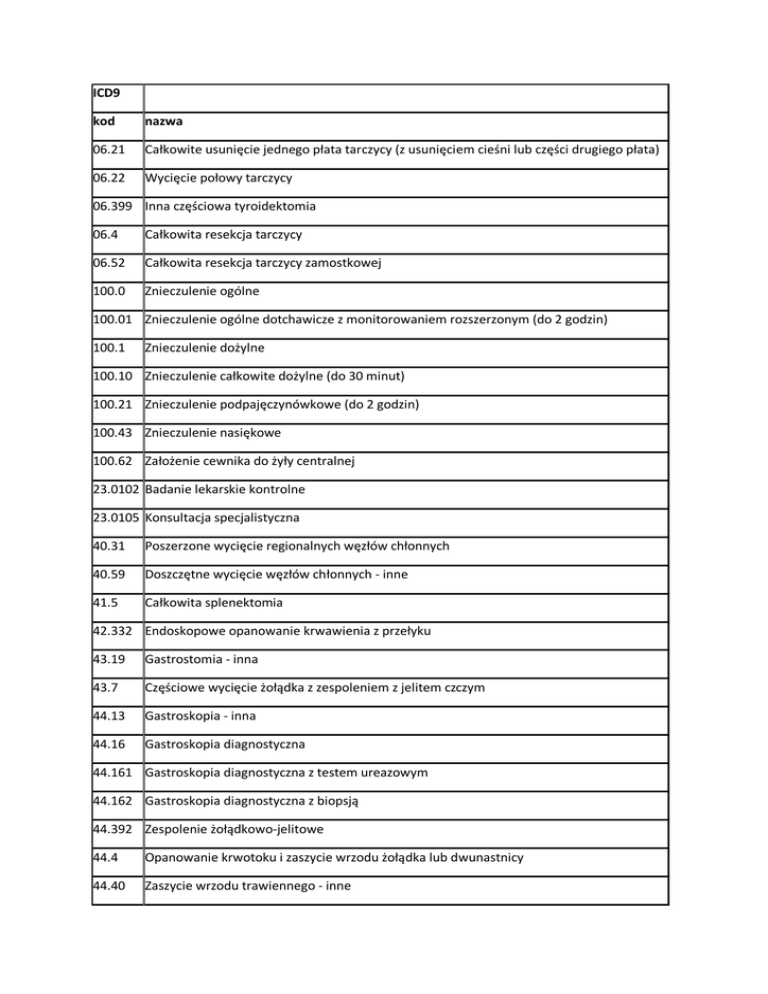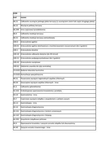 ICD9 kod nazwa 06.21 Całkowite usunięcie jednego płata tarczycy (z usunięciem cieśni lub części drugiego płata) 06.22 Wycięcie połowy tarczycy 06.399 Inna częściowa tyroidektomia 06.4 Całkowita resekcja tarczycy 06.52 Całkowita resekcja tarczycy zamostkowej 100.0 Znieczulenie ogólne 100.01 Znieczulenie ogólne dotchawicze z monitorowaniem rozszerzonym (do 2 godzin) 100.1 Znieczulenie dożylne 100.10 Znieczulenie całkowite dożylne (do 30 minut) 100.21 Znieczulenie podpajęczynówkowe (do 2 godzin) 100.43 Znieczulenie nasiękowe 100.62 Założenie cewnika do żyły centralnej 23.0102 Badanie lekarskie kontrolne 23.0105 Konsultacja specjalistyczna 40.31 Poszerzone wycięcie regionalnych węzłów chłonnych 40.59 Doszczętne wycięcie węzłów chłonnych - inne 41.5 Całkowita splenektomia 42.332 Endoskopowe opanowanie krwawienia z przełyku 43.19 Gastrostomia - inna 43.7 Częściowe wycięcie żołądka z zespoleniem z jelitem czczym 44.13 Gastroskopia - inna 44.16 Gastroskopia diagnostyczna 44.161 Gastroskopia diagnostyczna z testem ureazowym 44.162 Gastroskopia diagnostyczna z biopsją 44.392 Zespolenie żołądkowo-jelitowe 44.4 Opanowanie krwotoku i zaszycie wrzodu żołądka lub dwunastnicy 44.40 Zaszycie wrzodu trawiennego - inne 44.41 Zaszycie wrzodu żołądka 44.42 Zaszycie wrzodu dwunastnicy 44.43 Endoskopowe opanowanie krwawienia żołądek/ dwunastnica 44.61 Szycie rozerwania żołądka 44.639 Zamknięcie przetoki żołądka - inne 44.91 Podwiązanie żylaków wpustu żołądka 44.99 Operacje żołądka - inne 45.01 Nacięcie dwunastnicy 45.02 Nacięcie jelita cienkiego - inne 45.622 Resekcja jelita czczego 45.623 Resekcja jelita krętego 45.629 Częściowa resekcja jelita cienkiego - inna 45.7 Częściowe wycięcie jelita grubego 45.73 Hemikolektomia prawostronna 45.733 Hemikolektomia prawostronna 45.74 Resekcja poprzecznicy 45.75 Hemikolektomia lewostronna 45.76 Sigmoidektomia 45.8 Totalna śródbrzuszna kolektomia 45.91 Zespolenie jelito cienkie-jelito cienkie 45.93 Zespolenie jelito cienkie-jelito grube - inne 45.94 Zespolenie jelito grube-jelito grube 46.011 Ileostomia pętlowa 46.032 Kolostomia pętlowa 46.11 Czasowa kolostomia 46.13 Stała kolostomia 46.19 Kolostomia - inna 46.29 Ileostomia - inna 46.32 Przezskórna (endoskopowa) jejunostomia [PEJ] 46.4 Rewizja przetoki jelitowej 46.42 Usunięcie przepukliny okołokolostomijnej 46.71 Szycie rozerwanej dwunastnicy 46.73 Szycie jelita cienkiego za wyjątkiem dwunastnicy 46.81 Śródbrzuszne manipulacje na jelicie cienkim 46.85 Rozszerzenie jelita 46.999 Operacje jelitowe - inne 47.0 Appendektomia 47.01 Appendektomia laparoskopowo 47.09 Inna appendektomia 47.99 Operacje wyrostka robaczkowego - inne 48.29 Inne zabiegi diagnostyczne w zakresie odbytnicy, esicy i tkankach okołoodbytniczych 48.32 Elektrokoagulacja zmiany odbytnicy - inna 48.5 Brzuszno-kroczowa amputacja odbytnicy 48.63 Przednia resekcja odbytnicy - inna 48.691 Częściowe wycięcie odbytnicy 48.71 Szycie rozerwania odbytnicy 48.73 Zamknięcie przetoki odbytniczej - inne 48.752 Operacja wypadającego odbytu metodą Ripsteina 48.761 Operacja wypadającego odbytu metodą Delorme 48.81 Nacięcie okołoodbytnicze 48.99 Operacja odbytnicy/ tkanek okołoodbytniczych - inna 49.0 Nacięcie lub wycięcie tkanki w okolicy odbytu 49.01 Nacięcie ropnia okołoodbytowego 49.11 Przecięcie przetoki odbytu 49.12 Wycięcie przetoki odbytu 49.3 Miejscowe wycięcie lub zniszczenie zmiany lub tkanki odbytu - inne 49.31 Endoskopowe wycięcie/ zniszczenie zmiany/ tkanki odbytu 49.39 Miejscowe wycięcie/ zniszczenie zmiany/ tkanki odbytu - inne 49.46 Wycięcie hemoroidów 49.59 Nacięcie zwieracza odbytu - inne 49.7 Zabiegi naprawcze w zakresie odbytu 49.71 Szycie rany odbytu 49.79 Zabieg naprawczy zwieracza odbytu - inny 49.95 Opanowanie krwotoku z odbytu (po operacji) 50.01 Nacięcie ropnia wątroby 51.2 Cholecystektomia 51.219 Częściowa cholecystektomia - inna 51.22 Cholecystektomia 51.23 Laparoskopowa cholecystektomia 51.239 Laparoskopowa cholecystektomia - inna 51.43 Wprowadzenie drenu do przewodu żółciowego wspólnego/ wątrobowego celem odbarczenia 52.42 Wytworzenie przetoki torbieli trzustki z żołądkiem 52.93 Endoskopowe wprowadzenie protezy do przewodu trzustkowego 53.03 Operacja prostej przepukliny pachwinowej (wszczep) 53.04 Operacja skośnej przepukliny pachwinowej (wszczep) 53.05 Operacja przepukliny pachwinowej (wszczep) - inna 53.09 Jednostronna operacja przepukliny pachwinowej - inna 53.16 Obustronna operacja przepukliny pachwinowej prostej/ skośnej (wszczep) 53.21 Jednostronna operacja przepukliny udowej (wszczep) 53.29 Jednostronna operacja przepukliny udowej - inna 53.4 Operacja przepukliny pępkowej 53.41 Operacja przepukliny pępkowej (wszczep) 53.49 Operacja przepukliny pępkowej - inna 53.5 Operacja innych przepuklin przedniej ściany jamy brzusznej (bez wszczepu) 53.51 Operacja przepukliny z otwarciem worka 53.59 Operacja przepukliny ściany jamy brzusznej - inne 53.591 Operacja przepukliny nadbrzusza 53.592 Operacja przepukliny podbrzusza 53.594 Operacja przepukliny w bliźnie pooperacyjnej 53.61 Operacja przepukliny z otwarciem worka/ materiał sztuczny 53.69 Operacja przepukliny przedniej ściany jamy brzusznej (wszczep) 53.99 Operacja naprawcza przepukliny - inna 54.01 Drenaż ściany jamy brzusznej 54.02 Drenaż ropnia zewnątrzotrzewnowego 54.03 Drenaż ropnia przestrzeni zaotrzewnowej 54.11 Laparotomia zwiadowcza 54.12 Laparotomia przez ranę pooperacyjną 54.123 Laparotomia przez ranę operacyjną w celu nacięcia krwiaka 54.19 Laparotomia - inna 54.31 Chirurgiczne oczyszczenie ściany jamy brzusznej 54.51 Usunięcie zrostów otrzewnowych - metoda otwarta 54.512 Uwolnienie otrzewnowych zrostów jelitowych metodą otwartą 54.514 Uwolnienie zrostów otrzewnowych otrzewnej miednicy metodą otwartą 54.515 Uwolnienie zrostów otrzewnowych otrzewnej metodą otwartą 54.516 Uwolnienie zrostów otrzewnowych śledziony metodą otwa