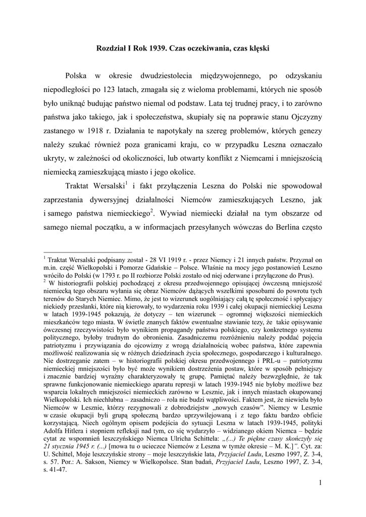Rozdział I Rok 1939. Czas oczekiwania, czas klęski Polska w okresie dwudziestolecia międzywojennego, po odzyskaniu niepodległości po 123 latach, zmagała się z wieloma problemami, których nie sposób było uniknąć budując państwo niemal od podstaw. Lata tej trudnej pracy, i to zarówno państwa jako takiego, jak i społeczeństwa, skupiały się na poprawie stanu Ojczyzny zastanego w 1918 r. Działania te napotykały na szereg problemów, których genezy należy szukać również poza granicami kraju, co w przypadku Leszna oznaczało ukryty, w zależności od okoliczności, lub otwarty konflikt z Niemcami i mniejszością niemiecką zamieszkującą miasto i jego okolice. Traktat Wersalski1 i fakt przyłączenia Leszna do Polski nie spowodował zaprzestania dywersyjnej działalności Niemców zamieszkujących Leszno, jak i samego państwa niemieckiego2. Wywiad niemiecki działał na tym obszarze od samego niemal początku, a w informacjach przesyłanych wówczas do Berlina często Traktat Wersalski podpisany został - 28 VI 1919 r. - przez Niemcy i 21 innych państw. Przyznał on m.in. część Wielkopolski i Pomorze Gdańskie – Polsce. Właśnie na mocy jego postanowień Leszno wróciło do Polski (w 1793 r. po II rozbiorze Polski zostało od niej oderwane i przyłączone do Prus). 2 W historiografii polskiej pochodzącej z okresu przedwojennego opisującej ówczesną mniejszość niemiecką tego obszaru wyłania się obraz Niemców dążących wszelkimi sposobami do powrotu tych terenów do Starych Niemiec. Mimo, że jest to wizerunek uogólniający całą tę społeczność i spłycający niekiedy przesłanki, które nią kierowały, to wydarzenia roku 1939 i całej okupacji niemieckiej Leszna w latach 1939-1945 pokazują, że dotyczy – ten wizerunek – ogromnej większości niemieckich mieszkańców tego miasta. W świetle znanych faktów ewentualne stawianie tezy, że takie opisywanie ówczesnej rzeczywistości było wynikiem propagandy państwa polskiego, czy konkretnego systemu politycznego, byłoby trudnym do obronienia. Zasadniczemu rozróżnieniu należy poddać pojęcia patriotyzmu i przywiązania do ojcowizny z wrogą działalnością wobec państwa, które zapewnia możliwość realizowania się w różnych dziedzinach życia społecznego, gospodarczego i kulturalnego. Nie dostrzeganie zatem – w historiografii polskiej okresu przedwojennego i PRL-u – patriotyzmu niemieckiej mniejszości było być może wynikiem dostrzeżenia postaw, które w sposób pełniejszy i znacznie bardziej wyraźny charakteryzowały tę grupę. Pamiętać należy bezwzględnie, że tak sprawne funkcjonowanie niemieckiego aparatu represji w latach 1939-1945 nie byłoby możliwe bez wsparcia lokalnych mniejszości niemieckich zarówno w Lesznie, jak i innych miastach okupowanej Wielkopolski. Ich niechlubna – zasadniczo – rola nie budzi wątpliwości. Faktem jest, że niewielu było Niemców w Lesznie, którzy rezygnowali z dobrodziejstw „nowych czasów”. Niemcy w Lesznie w czasie okupacji byli grupą społeczną bardzo uprzywilejowaną i z tego faktu bardzo obficie korzystającą. Niech ogólnym opisem podejścia do sytuacji Leszna w latach 1939-1945, polityki Adolfa Hitlera i stopniem refleksji nad tym, co się wydarzyło – widzianego okiem Niemca – będzie cytat ze wspomnień leszczyńskiego Niemca Ulricha Schittela: „(...) Te piękne czasy skończyły się 21 stycznia 1945 r. (...) [mowa tu o ucieczce Niemców z Leszna w tymże okresie – M. K.]”. Cyt. za: U. Schittel, Moje leszczyńskie strony – moje leszczyńskie lata, Przyjaciel Ludu, Leszno 1997, Z. 3-4, s. 57. Por.: A. Sakson, Niemcy w Wielkopolsce. Stan badań, Przyjaciel Ludu, Leszno 1997, Z. 3-4, s. 41-47. 1 1 pojawiała się nazwa „Lissa”3. Pojawiały się m.in. informacje o leszczyńskim garnizonie. Przykładem takiej działalności może być osoba Antoniego Zgorzalewicza, którego do działań na rzecz Abwehry4 namówili w 1934 r. leszczyńscy Niemcy. Umożliwił on zdobywanie przez tenże wywiad informacji o wspomnianym garnizonie. Taką samą rolę dla niemieckiego wywiadu pełnił od 1936 r. Zygmunt Bojanowski. Przekazywał m.in. dane dotyczące miejscowego wojska, jak i o polskich działaczach narodowych5. Według akt Oddziału II Sztabu Głównego Wojska Polskiego na dzień 01.06.1938 r. w powiecie leszczyńskim żyło 10240 Niemców, co stanowiło 15,8% ogółu ludności. W większości byli to tzw. volksdeutsche, którzy po Powstaniu Wielkopolskim, wygranym przez Polaków, postanowili pozostać w Polsce. Należeli oni do grupy ludności raczej majętnej, której nie sposób znaleźć na przedwojennych listach bezrobotnych, czy też wśród osób korzystających z zasiłków lub pomocy państwa polskiego. Mniejszość niemiecka w pełni czerpała z możliwości, które stwarzało prawodawstwo polskie. Posiadała własne organizacje, gazety, banki, przedsiębiorstwa, spółdzielnie, zrzeszenia, jak również kościoły i szkoły. Kościół ewangelicki, który nie uznawał zwierzchności państwa polskiego przyczyniał się do utrzymywania izolacji Niemców od pozostałych obywateli Leszna6. Wszystkie te struktury pozostające wyłącznie w gestii leszczyńskich Niemców umożliwiały im jeszcze lepsze umacnianie swojej odrębności. O sile mniejszości niemieckiej w Lesznie nie stanowiła zatem jej ilość, ale prężność i zdolność organizowania się 7. Ponadto wśród leszczyńskich Niemców niewielu było tych, którzy nieprzyjaźnie odnosili się w późniejszym okresie, tj. w latach 30-tych XX w., do hitlerowskich Niemiec. Zdecydowanie można stwierdzić, że takowi stanowili w tej grupie Lissa – to niemiecki odpowiednik polskiej nazwy Leszna. Do tej nazwy Niemcy wrócili już w początkach września 1939 r. 4 Abwehra – (niem. Abwehr) – niemiecki wywiad wojskowy zorganizowany po I wojnie światowej, którego znaczenie wzrosło, gdy na jego czele stanął w 1935 r. admirał W