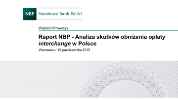 Wojciech Krawczyk Raport NBP - Analiza skutków obniżenia opłaty interchange w Polsce Warszawa / 15 października 2015 Analiza skutków obniżenia opłaty interchange w Polsce Agenda 1. Przesłanki przeprowadzenia analizy obniżki opłat interchange przez NBP 2. Główne źródła dla dokonania analizy 3. Historia prac nad obniżeniem opłat interchange w latach 2011-2015 4. Wysokość opłat interchange w latach 2011-2015 5. Oczekiwane w latach 2012-2013 skutki obniżenia opłat interchange 6. Rzeczywiste oczekiwane i nieoczekiwane skutki obniżenia opłat interchange 7. Wstępna ocena skutków obniżenia opłat interchange w styczniu 2015 r. 8. Inne niż poziom opłat interchange bariery ograniczające rozwój sieci akceptacji i rozwój płatności bezgotówkowych w Polsce 9. Podsumowanie 2 Analiza skutków obniżenia opłaty interchange w Polsce Przesłanki przeprowadzenia analizy obniżki opłat interchange przez NBP ■ Potrzeba neutralnej i obiektywnej oceny obniżki opłat interchange od lipca 2014 r. ■ Zaangażowanie NBP w próbę znalezienia kompromisu rynkowego i przygotowanie samoregulacji ■ Udział NBP na wszystkich etapach prac parlamentarnych nad regulacyjnym obniżeniem opłat interchange ■ Zbieranie danych statystycznych z rynku kartowego przez NBP ■ Możliwość zebrania uzupełniających informacji w ramach badania ankietowego od wszystkich zainteresowanych podmiotów 3 Analiza skutków obniżenia opłaty interchange w Polsce Główne źródła dla dokonania analizy ■ Dane statystyczne za okres III i IV kwartału 2014 r. wraz z ich porównaniem do kwartałów wcześniejszych ■ 30 odpowiedzi na ankietę przygotowaną przez NBP ■ Analiza uzasadnienia do ustawy o zmianie ustawy o usługach płatniczych oraz stanowisk zaprezentowanych w trakcie prac parlamentarnych ■ Badanie pt. Badanie obrotu kartowego wśród przedsiębiorców w Polsce zrealizowane na zlecenie Fundacji Rozwoju Obrotu Bezgotówkowego przez instytut badawczy Ipsos pod kierownictwem dra Jakuba Górki ■ Dodatkowe analizy na podstawie informacji od podmiotów rynkowych ■ Analizy własne NBP 4 Analiza skutków obniżenia opłaty interchange w Polsce 5 Historia prac nad obniżeniem opłat interchange w latach 2011-2015 Próba samoregulacji prowadzona przez NBP Wejście w życie ustawy z dnia 30 sierpnia 2013 r. i początek 6-miesięcznego okresu przejściowego Próba samoregulacji prowadzona przez ZBP Planowany termin wejścia w życie MIF Regulation Wprowadzenie w życie obniżki interchange do poziomu max 0,5% 1.07.2014 2011 Indywidualne obniżki opłat dokonane przez Visa i MasterCard 2012 2013 Prace parlamentarne nad projektem regulacji interchange fee Visa Commitment 29.01.2015 2014 Prace parlamentarne nad nową ustawą regulującą interchange fee 2015 Wejście w życie ustawy i rozpoczęcie 3miesięcznego okresu przejściowego dla starych umów Analiza skutków obniżenia opłaty interchange w Polsce 6 Poziom opłat interchange w Polsce w latach 2011-2015 1,80% 1,64% 1,60% 1,60% 1,50% 1,45% 1,40% 1,30% 1,25% 1,29% 1,24% IX 2011 1,20% VII 2013 1,00% 0,80% 0,60% VII 2014 0,50% 0,50% 0,50% 0,50% II 2015 0,40% 0,30% 0,20% 0,30% 0,20% 0,20% 0,00% VISA Debet VISA Kredyt MasterCard Debet MasterCard Kredyt Źródło: Opracowanie własne na podstawie danych Visa i MasterCard * Stawki MasterCard w 2011 r. przedstawione na wykresie wyliczone zostały dla średniej kwoty transakcji bezgotówkowej w 2011 roku w wysokości 97,7 zł. Analiza skutków obniżenia opłaty interchange w Polsce 7 Porównanie stawek opłaty interchange w krajach Unii Europejskiej - karty debetowe Visa IX 2011 Polska Niemcy Cypr Hiszpania Słowenia Grecja Rumunia Estonia Czechy Austria Portugalia Litwa UE Słowacja Włochy Francja Łotwa Irlandia Bułgaria Wielka Brytania Dania Luxemburg Holandia Węgry Szwecja Malta Belgia Finlandia 0,00% VII 2013 1,60% 1,58% 1,50% 1,42% Niemcy Hiszpania Cypr Grecja Polska Chorwacja Słowenia Rumunia Estonia Czechy Austria Litwa Portugalia UE Włochy Francja Słowacja Bułgaria Irlandia Wielka Brytania Dania Luksemburg Szwecja Węgry Malta Łotwa Holandia Belgia Finlandia 1,10% 1,05% 1,00% 1,00% 1,00% 1,00% 0,90% 0,90% 0,72% 0,70% 0,66% 0,63% 0,55% 0,41% 0,40% 0,37% 0,30% 0,25% 0,25% 0,21% 0,21% 0,21% 0,21% 0,19% 0,50% 1,00% 1,50% 2,00% Źródło: Opracowanie własne na podstawie danych Visa (wrzesień 2011 r.) 0,00% 1,58% 1,55% 1,50% 1,26% 1,25% 1,20% 1,10% 1,00% 1,00% 1,00% 1,00% 0,90% 0,88% 0,75% 0,73% 0,70% 0,70% 0,70% 0,48% 0,48% 0,30% 0,27% 0,22% 0,22% 0,22% 0,22% 0,22% 0,22% 0,19% 0,50% 1,00% 1,50% 2,00% Źródło: Opracowanie własne na podstawie danych Visa (lipiec 2013 r.) Analiza skutków obniżenia opłaty interchange w Polsce 8 Porównanie stawek opłaty interchange w krajach Unii Europejskiej - karty debetowe Visa VII 2014 Hiszpania Cypr Grecja Chorwacja Słowenia Rumunia Niemcy Estonia Czechy Austria Litwa Portugalia Włochy Słowacja Bułgaria UE Polska Irlandia Wielka… Francja Dania Szwecja Malta Luxemburg Holandia Belgia Węgry Finlandia Łotwa 0,00% 1,55% 1,50% 1,26% 1,20% 1,10% 1,00% 1,00% 1,00% 1,00% 1,00% 0,90% 0,88% 0,73% 0,70% 0,70% 0,70% 0,50% 0,48% 0,48% 0,32% 0,30% 0,22% 0,22% 0,22% 0,22% 0,22% 0,20% 0,19% 0,18% 0,50% 1,00% 1,50% Źródło: Opracowanie własne na podstawie danych Visa (lipiec 2014 r.) II 2015 Cypr Grecja Chorwacja Słowenia Austria Niemcy Estonia Czechy Rumunia Litwa Włochy Bułgaria Słowacja Portugalia UE Irlandia Wielka Brytania Francja Dania Belgia Szwecja Holandia Malta Luxemburg Węgry Hiszpania Polska Finlandia Łotwa 2,00% 0,00% 1,50% 1,26% 1,20% 1,10% 1,00% 1,00% 1,00% 1,00% 1,00% 0,90% 0,73% 0,70% 0,70% 0,70% 0,62% 0,48% 0,48% 0,32% 0,30% 0,22% 0,22% 0,22% 0,22% 0,22% 0,20% 0,20% 0,20% 0,19% 0,18% 0,50% 1,00% 1,50% 2,00% Źródło: Opracowanie własne na podstawie danych Visa (luty 2015 r.) Analiza skutków obniżenia opłaty interchange w Polsce Oczekiwane w latach 2012-2013 skutki obniżenia opłat interchange Lp. Skutek 1. Wzros