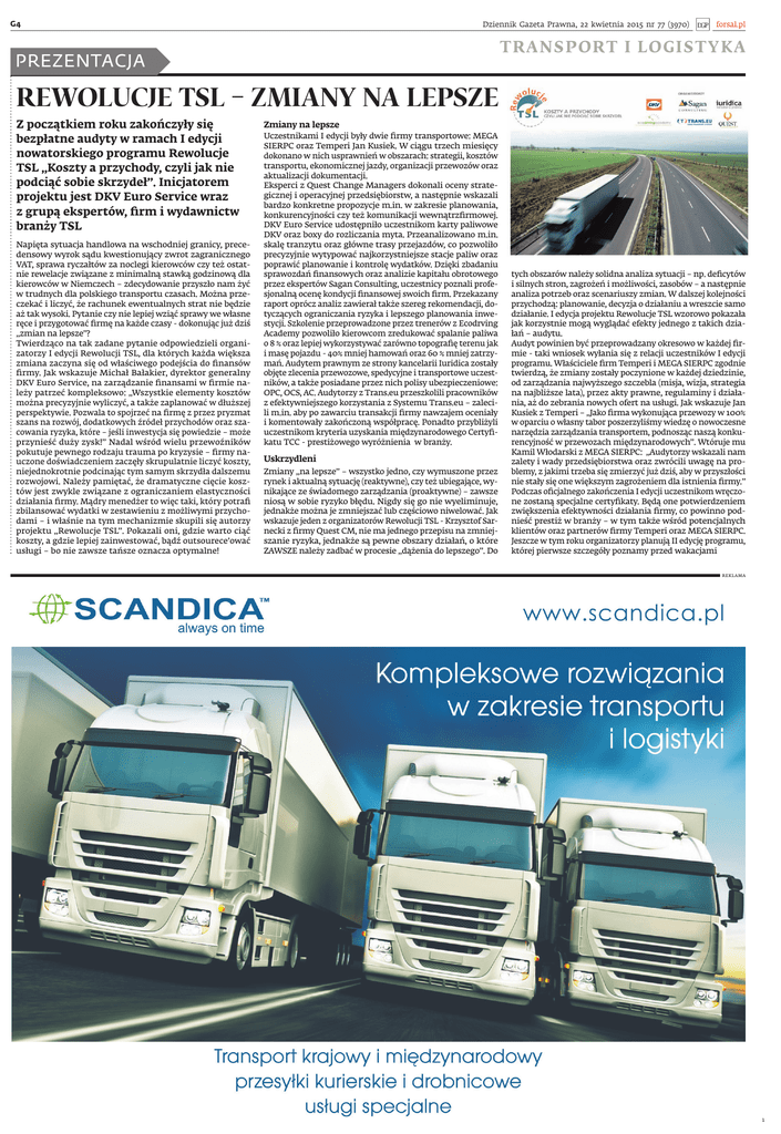 G4 Dziennik Gazeta Prawna, 22 kwietnia 2015 nr 77 (3970) forsal.pl T r a n s p or T i l o g i s T y k a prezentacja Rewolucje TSl – zmiany na lepSze Z początkiem roku zakończyły się bezpłatne audyty w ramach I edycji nowatorskiego programu Rewolucje TSL „Koszty a przychody, czyli jak nie podciąć sobie skrzydeł”. Inicjatorem projektu jest DKV Euro Service wraz z grupą ekspertów, firm i wydawnictw branży TSL Napięta sytuacja handlowa na wschodniej granicy, precedensowy wyrok sądu kwestionujący zwrot zagranicznego VaT, sprawa ryczałtów za noclegi kierowców czy też ostatnie rewelacje związane z minimalną stawką godzinową dla kierowców w Niemczech – zdecydowanie przyszło nam żyć w trudnych dla polskiego transportu czasach. można przeczekać i liczyć, że rachunek ewentualnych strat nie będzie aż tak wysoki. Pytanie czy nie lepiej wziąć sprawy we własne ręce i przygotować firmę na każde czasy - dokonując już dziś „zmian na lepsze”? Twierdząco na tak zadane pytanie odpowiedzieli organizatorzy I edycji rewolucji TSl, dla których każda większa zmiana zaczyna się od właściwego podejścia do finansów firmy. Jak wskazuje michał Bałakier, dyrektor generalny DkV euro Service, na zarządzanie finansami w firmie należy patrzeć kompleksowo: „Wszystkie elementy kosztów można precyzyjnie wyliczyć, a także zaplanować w dłuższej perspektywie. Pozwala to spojrzeć na firmę z przez pryzmat szans na rozwój, dodatkowych źródeł przychodów oraz szacowania ryzyka, które – jeśli inwestycja się powiedzie – może przynieść duży zysk!” Nadal wśród wielu przewoźników pokutuje pewnego rodzaju trauma po kryzysie – firmy nauczone doświadczeniem zaczęły skrupulatnie liczyć koszty, niejednokrotnie podcinając tym samym skrzydła dalszemu rozwojowi. Należy pamiętać, że dramatyczne cięcie kosztów jest zwykle związane z ograniczaniem elastyczności działania firmy. mądry menedżer to więc taki, który potrafi zbilansować wydatki w zestawieniu z możliwymi przychodami – i właśnie na tym mechanizmie skupili się autorzy projektu „rewolucje TSl”. Pokazali oni, gdzie warto ciąć koszty, a gdzie lepiej zainwestować, bądź outsourece’ować usługi – bo nie zawsze tańsze oznacza optymalne! Zmiany na lepsze Uczestnikami I edycji były dwie firmy transportowe: meGa SIerPC oraz Temperi Jan kusiek. W ciągu trzech miesięcy dokonano w nich usprawnień w obszarach: strategii, kosztów transportu, ekonomicznej jazdy, organizacji przewozów oraz aktualizacji dokumentacji. eksperci z Quest Change managers dokonali oceny strategicznej i operacyjnej przedsiębiorstw, a następnie wskazali bardzo konkretne propozycje m.in. w zakresie planowania, konkurencyjności czy też komunikacji wewnątrzfirmowej. DkV euro Service udostępniło uczestnikom karty paliwowe DkV oraz boxy do rozliczania myta. Przeanalizowano m.in. skalę tranzytu oraz główne trasy przejazdów, co pozwoliło precyzyjnie wytypować najkorzystniejsze stacje paliw oraz poprawić planowanie i kontrolę wydatków. Dzięki zbadaniu sprawozdań finansowych oraz analizie kapitału obrotowego przez ekspertów Sagan Consulting, uczestnicy poznali profesjonalną ocenę kondycji finansowej swoich firm. Przekazany raport oprócz analiz zawierał także szereg rekomendacji, dotyczących ograniczania ryzyka i lepszego planowania inwestycji. Szkolenie przeprowadzone przez trenerów z ecodrving academy pozwoliło kierowcom zredukować spalanie paliwa o 8 % oraz lepiej wykorzystywać zarówno topografię terenu jak i masę pojazdu - 40% mniej hamowań oraz 60 % mniej zatrzymań. audytem prawnym ze strony kancelarii Iuridica zostały objęte zlecenia przewozowe, spedycyjne i transportowe uczestników, a także posiadane przez nich polisy ubezpieczeniowe: OPC, OCS, aC. audytorzy z Trans.eu przeszkolili pracowników z efektywniejszego korzystania z Systemu Trans.eu – zalecili m.in. aby po zawarciu transakcji firmy nawzajem oceniały i komentowały zakończoną współpracę. Ponadto przybliżyli uczestnikom kryteria uzyskania międzynarodowego Certyfikatu TCC - prestiżowego wyróżnienia w branży. Uskrzydleni Zmiany „na lepsze” – wszystko jedno, czy wymuszone przez rynek i aktualną sytuację (reaktywne), czy też ubiegające, wynikające ze świadomego zarządzania (proaktywne) – zawsze niosą w sobie ryzyko błędu. Nigdy się go nie wyeliminuje, jednakże można je zmniejszać lub częściowo niwelować. Jak wskazuje jeden z organizatorów rewolucji TSl - krzysztof Sarnecki z firmy Quest Cm, nie ma jednego przepisu na zmniejszanie ryzyka, jednakże są pewne obszary działań, o które ZaWSZe należy zadbać w procesie „dążenia do lepszego”. Do tych obszarów należy solidna analiza sytuacji – np. deficytów i silnych stron, zagrożeń i możliwości, zasobów – a następnie analiza potrzeb oraz scenariuszy zmian. W dalszej kolejności przychodzą: planowanie, decyzja o działaniu a wreszcie samo działanie. I edycja projektu rewolucje TSl wzorowo pokazała jak korzystnie mogą wyglądać efekty jednego z takich działań – audytu. audyt powinien być przeprowadzany okresowo w każdej firmie - taki wniosek wyłania się z relacji uczestników I edycji programu. Właściciele firm Temperi i meGa SIerPC zgodnie twierdzą, że zmiany zostały poczynione w każdej dziedzinie, od zarządzania najwyższego szczebla (misja, wizja, strategia na najbliższe lata), przez akty prawne, regulaminy i działania, aż do zebrania nowych ofert na usługi. Jak wskazuje Jan kusiek z Temperi – „Jako firma wykonująca przewozy w 100% w oparciu o własny tabor poszerzyliśmy wiedzę o nowoczesne narzędzia zarządzania transportem, podnosząc naszą konkurencyjność w przewozach międzynarodowych”. Wtóruje mu kamil Włodarski z meGa SIerPC: „audytorzy wskazali nam zalety i wady przedsiębiorstwa oraz zwrócili uwagę na problemy, z jakimi trzeba się zmierz