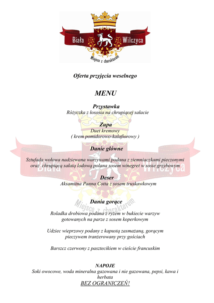Oferta przyjęcia weselnego MENU Przystawka Różyczka z łososia na chrupiącej sałacie Zupa Duet kremowy ( krem pomidorowo-kalafiorowy ) Danie główne Sztufada wołowa nadziewana warzywami podana z ziemniaczkami pieczonymi oraz chrupiącą sałatą lodową polana sosem winegret w sosie grzybowym Deser Aksamitna Panna Cotta z sosem truskawkowym Dania gorące Roladka drobiowa podana z ryżem w bukiecie warzyw gotowanych na parze z sosem koperkowym Udziec wieprzowy podany z kapustą zasmażaną, gorącym pieczywem tranżerowany przy gościach Barszcz czerwony z pasztecikiem w cieście francuskim NAPOJE Soki owocowe, woda mineralna gazowana i nie gazowana, pepsi, kawa i herbata BEZ OGRANICZEŃ! STÓŁ SZWEDZKI ( możliwość zimnej płyty na stołach według Państwa życzenia ) Łosoś pieczony w całości Śledź w oleju i śledź w śmietanie Plastry drobiu w balsamicznej zalewie w bukiecie ziół Pasztet zapiekany w cieście francuskim Pieczony schab wieprzowy marynowany w czerwonym pieprzu z ziołami Karczek wieprzowy w oliwie czosnkowej z kminkiem Roladki wieprzowe z zielonym groszkiem owinięte wędzonym boczkiem Szynka, kabanos Jajka faszerowane Tarty z ciasta francuskiego zapieczone z serami pleśniowymi Deski serów zdobione świeżymi owocami bakaliami Sałatka grecka z sosem jogurtowo-czosnkowym Sałatka z pora Sałatka z kurczaka z ananasem Tymbaliki wieprzowe Tymbaliki drobiowe Sos cumberland, cacyki Pieczywo Tort weselny (smak do wyboru) Ciasta i owoce : - sernik wiedeński - migdałowiec - jubileuszowe - bananowiec - babeczki owocowe - ciasteczka bankietowe W cenie również chleb weselny dla Państwa Młodych oraz kieliszki dla Państwa Młodych wino musujące na powitanie gości i wzniesienie toastu, salwy armatnie oraz Pokój dla Państwa Młodych ze śniadaniem Cena 240zł / osobę ( sobota ) 220zł / osobę ( niedziela-piątek ) Biała Wilczyca Anna i Marek Osiakowscy Wilków 90 32-010 Kocmyrzów tel. 515 838 965 tel./fax 012 685 21 31 [email protected] www.bialawilczyca.pl