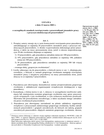 ©Kancelaria Sejmu s. 1/10 USTAWA z dnia 13 marca 2003 r. Opracowano na podstawie: Dz.U. z 2003 r. Nr 90, poz. 844, Nr o szczególnych zasadach rozwiązywania z pracownikami stosunków pracy 213, poz. 2081, Nr 1) z przyczyn niedotyczących pracowników 223, poz. 2217, z 2004 r. Nr 96, poz. 959, z 2005 r. Nr 62, poz. 551, z 2006 r. Nr 79, Art. 1. poz. 550, Nr 149, poz. 1. Przepisy ustawy stosuje się w razie konieczności rozwiązania przez pracodawcę 1077, z 2008 r. Nr 86, poz. 525, Nr 237, poz. zatrudniającego co najmniej 20 pracowników stosunków pracy z przyczyn nie- 1654. dotyczących pracowników, w drodze wypowiedzenia dokonanego przez pracodawcę, a także na mocy porozumienia stron, jeżeli w okresie nieprzekraczającym 30 dni zwolnienie obejmuje co najmniej: 1) 10 pracowników, gdy pracodawca zatrudnia mniej niż 100 pracowników, 2) 10% pracowników, gdy pracodawca zatrudnia co najmniej 100, jednakże mniej niż 300 pracowników, 3) 30 pracowników, gdy pracodawca zatrudnia co najmniej 300 lub więcej pracowników - zwanego dalej „grupowym zwolnieniem”. 2. Liczby odnoszące się do pracowników, o których mowa w ust. 1, obejmują pracowników, z którymi w ramach grupowego zwolnienia następuje rozwiązanie stosunków pracy z inicjatywy pracodawcy na mocy porozumienia stron, jeżeli dotyczy to co najmniej 5 pracowników. Art. 2. 1. Pracodawca jest obowiązany skonsultować zamiar przeprowadzenia grupowego zwolnienia z zakładowymi organizacjami związkowymi działającymi u tego pracodawcy. 2. Konsultacja, o której mowa w ust. 1, dotyczy w szczególności możliwości uniknięcia lub zmniejszenia rozmiaru grupowego zwolnienia oraz spraw pracowniczych związanych z tym zwolnieniem, w tym zwłaszcza możliwości przekwalifikowania lub przeszkolenia zawodowego, a także uzyskania innego zatrudnienia przez zwolnionych pracowników. 3. Pracodawca jest obowiązany zawiadomić na piśmie zakładowe organizacje związkowe o przyczynach zamierzonego grupowego zwolnienia, liczbie zatrudnionych pracowników i grupach zawodowych, do których oni należą, grupach zawodowych pracowników objętych zamiarem grupowego zwolnienia, okresie, 1) Niniejsza ustawa dokonuje w zakresie swojej regulacji wdrożenia dyrektywy 98/59/WE z dnia 20 lipca 1998 r. w sprawie zbliżenia ustawodawstw państw członkowskich odnoszących się do zwolnień grupowych (Dz.Urz. WE L 225 z 12.08.1998). Dane dotyczące ogłoszenia aktów prawa Unii Europejskiej, zamieszczone w niniejszej ustawie - z dniem uzyskania przez Rzeczpospolitą Polską członkostwa w Unii Europejskiej - dotyczą ogłoszenia tych aktów w Dzienniku Urzędowym Unii Europejskiej - wydanie specjalne. 2012-06-14 ©Kancelaria Sejmu s. 2/10 w ciągu którego nastąpi takie zwolnienie, proponowanych kryteriach doboru pracowników do grupowego zwolnienia, kolejności dokonywania zwolnień pracowników, propozycjach rozstrzygnięcia spraw pracowniczych związanych z zamierzonym grupowym zwolnieniem, a jeżeli obejmują one świadczenia pieniężne, pracodawca jest obowiązany dodatkowo przedstawić sposób ustalania ich wysokości. 4. Pracodawca przekazuje zakładowym organizacjom związkowym informacje, o których mowa w ust. 3, w terminie umożliwiającym tym organizacjom zgłoszenie w ramach konsultacji propozycji dotyczących spraw określonych w ust. 2. 5. W trakcie konsultacji pracodawca jest obowiązany przekazać zakładowym organizacjom związkowym także inne niż określone w ust. 3 informacje, jeżeli mogą one mieć wpływ na przebieg konsultacji oraz treść porozumienia, o którym mowa w art. 3. 6. Pracodawca przekazuje na piśmie właściwemu powiatowemu urzędowi pracy informacje, o których mowa w ust. 3, z wyłączeniem informacji dotyczących sposobu ustalania wysokości świadczeń pieniężnych przysługujących pracownikom. 7. Jeżeli u danego pracodawcy nie działają zakładowe organizacje związkowe, uprawnienia tych organizacji w zakresie wynikającym z ust. 1-5 przysługują przedstawicielom pracowników wyłonionym w trybie przyjętym u danego pracodawcy. Art. 3. 1. W terminie nie dłuższym niż 20 dni od dnia zawiadomienia, o którym mowa w art. 2 ust. 3, pracodawca i zakładowe organizacje związkowe zawierają porozumienie. 2. W porozumieniu, o którym mowa w ust. 1, określa się zasady postępowania w sprawach dotyczących pracowników objętych zamiarem grupowego zwolnienia, a także obowiązki pracodawcy w zakresie niezbędnym do rozstrzygnięcia innych spraw pracowniczych związanych z zamierzonym grupowym zwolnieniem. 3. Jeżeli nie jest możliwe uzgodnienie treści porozumienia ze wszystkimi zakładowymi organizacjami związkowymi, pracodawca uzgadnia treść porozumienia z organizacjami związkowymi reprezentatywnymi w rozumieniu art. 24125a Kodeksu pracy. 4. Jeżeli nie jest możliwe zawarcie porozumienia zgodnie z ust. 1 i 3, zasady postępowania w sprawach dotyczących pracowników objętych zamiarem grupowego zwolnienia ustala pracodawca w regulaminie, uwzględniając, w miarę możliwości, propozycje przedstawione w ramach konsultacji przez zakładowe organizacje związkowe. 5. Jeżeli u danego pracodawcy nie działają zakładowe organizacje związkowe, zasady postępowania w sprawach dotyczących pracowników objętych zamiarem grupowego zwolnienia ustala pracodawca w regulaminie, po konsultacji z przedstawicielami pracowników wyłonionymi w trybie przyjętym u danego pracodawcy. Art. 4. 1. Pracodawca – po zawarciu porozumienia, a w razie niezawarcia porozumienia po spełnieniu obowiązku, o którym mowa w art. 3 ust. 4 lub 5 – zawiadamia na piśmie właściwy powiatowy urząd pracy o przyjętych ustaleniach dotyczących 2012-06-14 ©Kancelaria Sejmu s. 3/10 grupowego zwolnienia, w tym o liczbie zatrudnionych i zwalnianych pracowników oraz o przyczynach ich zwolnienia, okresie, w ciągu którego ma być dokonane zwolnienie, a także o przeprowadzonej konsultacji zamierzonego grupowego zwolni