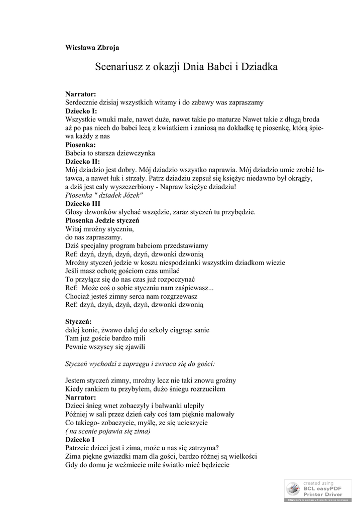 Wiesława Zbroja Scenariusz z okazji Dnia Babci i Dziadka Narrator: Serdecznie dzisiaj wszystkich witamy i do zabawy was zapraszamy Dziecko I: Wszystkie wnuki małe, nawet duże, nawet takie po maturze Nawet takie z długą broda aż po pas niech do babci lecą z kwiatkiem i zaniosą na dokładkę tę piosenkę, którą śpiewa każdy z nas Piosenka: Babcia to starsza dziewczynka Dziecko II: Mój dziadzio jest dobry. Mój dziadzio wszystko naprawia. Mój dziadzio umie zrobić latawca, a nawet łuk i strzały. Patrz dziadziu zepsuł się księżyc niedawno był okrągły, a dziś jest cały wyszczerbiony - Napraw księżyc dziadziu! Piosenka " dziadek Józek" Dziecko III Głosy dzwonków słychać wszędzie, zaraz styczeń tu przybędzie. Piosenka Jedzie styczeń Witaj mroźny styczniu, do nas zapraszamy. Dziś specjalny program babciom przedstawiamy Ref: dzyń, dzyń, dzyń, dzyń, dzwonki dzwonią Mroźny styczeń jedzie w koszu niespodzianki wszystkim dziadkom wiezie Jeśli masz ochotę gościom czas umilać To przyłącz się do nas czas już rozpoczynać Ref: Może coś o sobie styczniu nam zaśpiewasz... Chociaż jesteś zimny serca nam rozgrzewasz Ref: dzyń, dzyń, dzyń, dzyń, dzwonki dzwonią Styczeń: dalej konie, żwawo dalej do szkoły ciągnąc sanie Tam już goście bardzo mili Pewnie wszyscy się zjawili Styczeń wychodzi z zaprzęgu i zwraca się do gości: Jestem styczeń zimny, mroźny lecz nie taki znowu groźny Kiedy rankiem tu przybyłem, dużo śniegu rozrzuciłem Narrator: Dzieci śnieg wnet zobaczyły i bałwanki ulepiły Później w sali przez dzień cały coś tam pięknie malowały Co takiego- zobaczycie, myślę, ze się ucieszycie ( na scenie pojawia się zima) Dziecko I Patrzcie dzieci jest i zima, może u nas się zatrzyma? Zima piękne gwiazdki mam dla gości, bardzo różnej są wielkości Gdy do domu je weźmiecie miłe światło mieć będziecie Narrator O zajączki idą jeszcze, dobrze że dotarły wreszcie Zajączki My zwierzęta leśne życzenia składamy Jak tylko umiemy pięknie się kłaniamy Niechaj wszystkie wnuki zawsze was kochają Każdą wolna chwilę z wami niech spędzają Dzieci razem babuniu, dziadziuniu w dniu Waszego święta życzenia składają Wam wszystkie wnuczęta Dziecko I Wy zawsze wszystko najlepiej wiecie Dziecko II Smutno by było bez was na świecie Dzieci razem bardzo, ach bardzo Was za to kochamy i piękną piosenkę teraz zaśpiewamy Piosenka „Kochamy Was” Czy wy wiecie moi mili, czy wy wiecie ile babć i dziadków jest na całym świecie. Właśnie wielkie święto dzisiaj swoje mają więc wnuczęta im piosenkę śpiewać chcą Ref: Kochamy was, kochamy całym sercem I radości chcemy wam dać jak najwięcej Nasze buzie uśmiechnięte, niech życzenia ślą przepiękne Żyj babuniu, żyj dziadziuniu latek sto. Babcia z dziadkiem czas nam ciągle umilają Zawsze dla nas niespodzianek wiele mają Dziś w piosence miłość wielka wyrażamy Głośno teraz podziękować chcemy Narrator A teraz naszym babciom, dziadkom przypomnimy lata ich młodości Chłopaki O rety dziewuchy, siedzicie gadacie a nas do tańca nic nie zapraszacie Dziewczyny O rety chłopaki cóż to za przyczyna, że do tańca prosić ma dziewczyna Piosenka Czerwone jabłuszko przekrojone na krzyż Czemu ty dziewczyno krzywo na mnie patrzysz Gęsi za wodą, kaczki za wodą, uciekaj dziewczyno bo cię pobodą. Ja ci buzi dam ty mi buzi dasz, ja cię nie wydam, ty mnie nie wydasz Mazurek, mazureczek, oberek, obereczek, kujawiak, kujawiaczek Chodźże Maryś chodźże, chodź, chodź }2 razy Czerwone jabłuszko po ziemi się toczy tego chłopca kocham co ma czarne oczy Gęsi za wodą , kaczki za wodą, uciekaj dziewczyno bo cię pobodą Ja ci buzi dam ty mi buzi dasz, ja cię nie wydam, ty mnie nie wydasz Mazurek, mazureczek, oberek, obereczek, kujawiak, kujawiaczek Chodźże Maryś chodźże, chodź, chodź }2 razy ( raz śpiewają chłopcy, raz dziewczyny) Chłopcy śpiewaja piosenkę „Furman” ( dwóch chłopców przebranych za konie, furman trzyma lejce jada) Wszystkich dziś ciekawość budzi, kto jest najszczęśliwszym z ludzi A ja mówię że nad pana najszczęśliwszy los furmana Hej wio, hetta wio! Hetta stary młody jary Hej wio, hetta wio hejta wiśta prrr Czy to z góry czy pod górę cztery konie ciągną furę a ja myślę że nad pana najszczęśliwszy los furmana hej wio.......... (wchodzi góral i śpiewa) hej górol jo ci górol hej od samiutkich tater hej na dzień babci z dziadkiem przygónił mnie tu wiater hej szepnął mi do ucha nie jesteś tu przypadkiem bo w Krzemniewicach w szkole jest dzisiaj babcia z dziadkiem (taniec trojak) Zasiali górale owies, owies od końca do końca tak jest, tak jest Zasiali górale żyto, żyto, od końca do końca wszystko, wszystko A mam ci ja mendelicek w domu dwa, w domu dwa, U sąsiada swarnych dziewek gromada, gromada A mam ci ja trzy mendele w domu dwa, w domu dwa, Żadna mi się nie podoba tylko ta, tylko ta Pożeli górale owies, owies od końca do końca tak jest, tak jest Pożeli górale żyto, żyto, od końca do końca wszystko, wszystko A na polu góraleczek gromada, gromada Czemużeś się wydawała kiej młoda, kiej młoda Czemużeś się wydawała kiej mała, kiej mała Będzie z ciebie gospodyni niedbała, Piosenka Za górami, za lasami za dolinami, pobili się dwaj górale ciupagami Hej górale nie bijta się ma góralka dwa warkocze podzielita się A teraz zapraszamy babcie i dziadków do wspólnej zabawy Konkursy: Randka w ciemno - Nagroda bilet MPK i piosenka zespołu „Ich Troje” Babciu, dziadku piosenkę wam napisałem Blisko usiąść wam kazałem Nie przyszliście zawołałem Dziś wasze wielkie święto jest Droga babciu, drogi dziadku Posłuchajcie swoich wnuków a my wam zaśpiewamy tak posłuchajcie Ref zawsze z wami chcemy być babciu i dziadku Bo wy macie zawsze czas dla swoich wnuków Zawsze z wami chcemy być gdy nie ma mamy Bo my bardzo mocno was bardzo koch