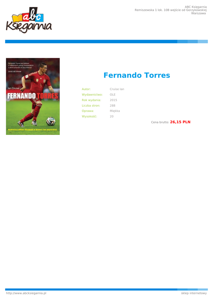 ABC Księgarnia Remiszewska 1 lok. 10B wejście od Gorzykowskiej Warszawa Fernando Torres Autor: Cruise Ian Wydawnictwo: OLE Rok wydania: 2015 Liczba stron: 288 Oprawa: Miękka Wysokość: 20 Cena brutto: http://www.abcksiegarnia.pl 26,15 PLN sklep internetowy