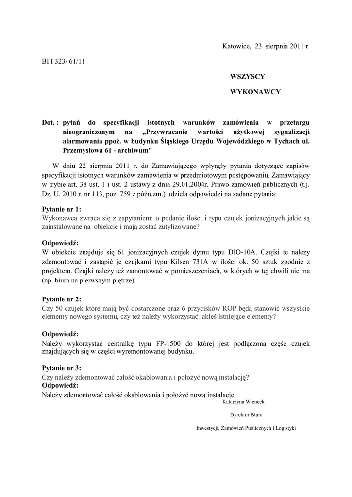 Katowice, 23 sierpnia 2011 r. BI I 323/ 61/11 WSZYSCY WYKONAWCY Dot. : pytań do specyfikacji istotnych warunków zamówienia w przetargu nieograniczonym na „Przywracanie wartości użytkowej sygnalizacji alarmowania ppoż. w budynku Śląskiego Urzędu Wojewódzkiego w Tychach ul. Przemysłowa 61 - archiwum” W dniu 22 sierpnia 2011 r. do Zamawiającego wpłynęły pytania dotyczące zapisów specyfikacji istotnych warunków zamówienia w przedmiotowym postępowaniu. Zamawiający w trybie art. 38 ust. 1 i ust. 2 ustawy z dnia 29.01.2004r. Prawo zamówień publicznych (t.j. Dz. U. 2010 r. nr 113, poz. 759 z późn.zm.) udziela odpowiedzi na zadane pytania: Pytanie nr 1: Wykonawca zwraca się z zapytaniem: o podanie ilości i typu czujek jonizacyjnych jakie są zainstalowane na obiekcie i mają zostać zutylizowane? Odpowiedź: W obiekcie znajduje się 61 jonizacyjnych czujek dymu typu DIO-10A. Czujki te należy zdemontować i zastąpić je czujkami typu Kilsen 731A w ilości ok. 50 sztuk zgodnie z projektem. Czujki należy też zamontować w pomieszczeniach, w których w tej chwili nie ma (np. biura na pierwszym piętrze). Pytanie nr 2: Czy 50 czujek które mają być dostarczone oraz 6 przycisków ROP będą stanowić wszystkie elementy nowego systemu, czy też należy wykorzystać jakieś istniejące elementy? Odpowiedź: Należy wykorzystać centralkę typu FP-1500 do której jest podłączona część czujek znajdujących się w części wyremontowanej budynku. Pytanie nr 3: Czy należy zdemontować całość okablowania i położyć nową instalację? Odpowiedź: Należy zdemontować całość okablowania i położyć nową instalację. Katarzyna Wiencek Dyrektor Biura Inwestycji, Zamówień Publicznych i Logistyki