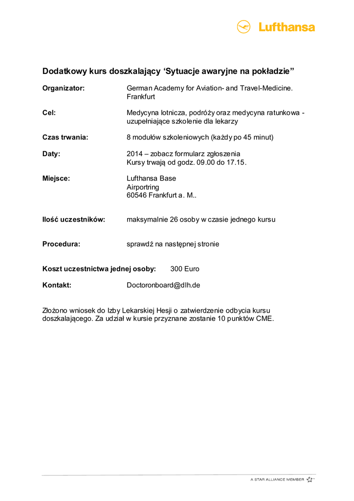 Dodatkowy kurs doszkalający ‘Sytuacje awaryjne na pokładzie” Organizator: German Academy for Aviation- and Travel-Medicine. Frankfurt Cel: Medycyna lotnicza, podróży oraz medycyna ratunkowa uzupełniające szkolenie dla lekarzy Czas trwania: 8 modułów szkoleniowych (każdy po 45 minut) Daty: 2014 – zobacz formularz zgłoszenia Kursy trwają od godz. 09.00 do 17.15. Miejsce: Lufthansa Base Airportring 60546 Frankfurt a. M.. Ilość uczestników: maksymalnie 26 osoby w czasie jednego kursu Procedura: sprawdź na następnej stronie Koszt uczestnictwa jednej osoby: Kontakt: 300 Euro [email protected] Złożono wniosek do Izby Lekarskiej Hesji o zatwierdzenie odbycia kursu doszkalającego. Za udział w kursie przyznane zostanie 10 punktów CME. Plan szkolenia Czas Temat 09.00 – 09.15 Powitanie Wstęp do fizjologii lotniczej 09.15 – 10.00 Fizjologia na dużych wysokościach, środowisko kabiny samolotu Sytuacje awaryjne na pokładzie 10.00 – 11.00 Częstotliwość, symptomy, priorytety Leczenie i komunikacja Skutki nieregularnego przebiegu lotu Zdatny do lotu – charakterystyka chorych i niepełnosprawnych pasażerów 11.00 – 11.20 11.20 – 12.20 12.20 – 13.15 13.15 – 14.15 14.15 – 15.15 15.15 – 15.30 15.30 – 16.30 16.30 – 17.00 Przerwa Wyposażenie medyczne na pokładzie Pokaz i zapoznanie się ze sprzętem Przerwa Ćwiczenia praktyczne Reanimacja na pokładzie Ćwiczenia praktyczna Opieka nad pacjentem w kabinie Przerwa Symulator kabiny / zapobieganie infekcji na pokładzie (dwie grupy zmieniające się po 30 minutach) Wnioski końcowe, dyskusja, zakończenie