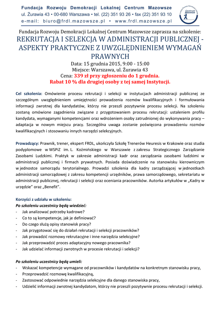 Fundacja Rozwoju Demokracji Lokalnej Centrum Mazowsze zaprasza na szkolenie: REKRUTACJA I SELEKCJA W ADMINISTRACJI PUBLICZNEJ ASPEKTY PRAKTYCZNE Z UWZGLĘDNIENIEM WYMAGAŃ PRAWNYCH Data: 15 grudnia 2015, 9:00 - 15:00 Miejsce: Warszawa, ul. Żurawia 43 Cena: 339 zł przy zgłoszeniu do 1 grudnia. Rabat 10 % dla drugiej osoby z tej samej Instytucji. Cel szkolenia: Omówienie procesu rekrutacji i selekcji w instytucjach administracji publicznej ze szczególnym uwzględnieniem umiejętności prowadzenia rozmów kwalifikacyjnych i formułowania informacji zwrotnej dla kandydatów, którzy nie przeszli pozytywnie procesu selekcji. Na szkoleniu zostaną omówione zagadnienia związane z przygotowaniem procesu rekrutacji: ustaleniem profilu kandydata, wymaganymi kompetencjami oraz wdrożeniem osoby zatrudnionej do wykonywania pracy – adaptacja w nowym miejscu pracy. Szczególna uwaga zostanie poświęcona prowadzeniu rozmów kwalifikacyjnych i stosowaniu innych narzędzi selekcyjnych. Prowadzący: Prawnik, trener, ekspert FRDL, ukończyła Szkołę Trenerów Heuresis w Krakowie oraz studia podyplomowe w WSPiZ im. L. Koźmińskiego w Warszawie z zakresu Strategicznego Zarządzanie Zasobami Ludzkimi. Praktyk w zakresie administracji kadr oraz zarządzania zasobami ludzkimi w administracji publicznej i firmach prywatnych. Posiada doświadczenie na stanowisku kierowniczym w jednostce samorządu terytorialnego. Prowadzi szkolenia dla kadry zarządzającej w jednostkach administracji samorządowej z zakresu kompetencji urzędników, prawa samorządowego, sekretariatu w administracji publicznej, rekrutacji i selekcji oraz oceniania pracowników. Autorka artykułów w „Kadry w urzędzie” oraz „Benefit”. Korzyści z udziału w szkoleniu: Po szkoleniu uczestnicy będą wiedzieć: - Jak analizować potrzeby kadrowe? - Co to są kompetencje, jak je definiować? - Do czego służą opisy stanowisk pracy? - Jak przygotować się do działań rekrutacji i selekcji pracowników? - Jak prowadzić rozmowy rekrutacyjne i inne narzędzia selekcyjne? - Jak przeprowadzić proces adaptacyjny nowego pracownika? - Jak udzielać informacji zwrotnych w procesie rekrutacji i selekcji? Po szkoleniu uczestnicy będą umieli: - Wskazać kompetencje wymagane od pracowników i kandydatów na konkretnym stanowisku pracy, - Przeprowadzić rozmowę kwalifikacyjną, - Zastosować odpowiednie narzędzia selekcyjne dla danego stanowiska pracy, - Udzielić informacji zwrotnej kandydatom, którzy nie przeszli pozytywnie procesu rekrutacji i selekcji. Szczegółowy program: 1. Jak sprawnie i skutecznie wybrać dobrego kandydata zgodnie z prawem i standardami rekrutacji? 2. Opis stanowiska pracy ze szczególnym uwzględnieniem definicji kompetencji, jako podstawowe narzędzie w rozpoczęciu procesu rekrutacji. Przykłady kompetencji dostosowanych do poszczególnych stanowisk w administracji samorządowej. 3. Które metody i narzędzia selekcji można zastosować w administracji publicznej? Skuteczność poszczególnych metod i narzędzi. 4. Jak prawidłowo i efektywnie wykorzystać spotkanie z kandydatem podczas rozmowy rekrutacyjnej? Przygotowanie schematu rozmowy. Jak dobrze zadawać pytania by zweryfikować kompetencje wymagane na danym stanowisku pracy? Jak prowadzić rozmowę by nie narazić się na zarzut dyskryminacji i nierównego traktowania? 5. Zakończenie rekrutacji. Informacja zwrotna dla uczestników procesu rekrutacji. Opracowanie wzoru informacji dla kandydatów. 6. Kompetencje i inne wymagania w stosunku do osób przeprowadzających rekrutację w administracji samorządowej. ZGŁOSZENIE REKRUTACJA I SELEKCJA W ADMINISTRACJI PUBLICZNEJ ASPEKTY PRAKTYCZNE Z UWZGLĘDNIENIEM WYMAGAŃ PRAWNYCH Data: 15 grudnia 2015, 9:00 - 15:00 Miejsce: Warszawa, ul. Żurawia 43 Cena: 339 zł przy zgłoszeniu do 1 grudnia. Rabat 10 % dla drugiej osoby z tej samej Instytucji. Instytucja (dane do faktury): · Adres: ................................................................................................................................. NIP: ..................................................................................................................................... L.p. Imię i nazwisko Wydział tel. e-mail 1.......................................................................................................................................... 2.......................................................................................................................................... 3.......................................................................................................................................... ........................................................... podpis i pieczątka osoby delegującej Zgłoszenia prosimy przesyłać do 8 grudnia 2015 r. fax: (22) 351 93 10, e-mail: [email protected] lub wybrać opcje zapisu przez stronę www.frdl.mazowsze.pl Przy zgłoszeniu w ramach Forów prosimy o wpisanie w uwagach: „Zgłoszenie w ramach Forum (nazwa odpowiedniego Forum)”. Ewentualną rezygnację ze szkolenia można zgłosić najpóźniej na dwa dni przed szkoleniem. W przypadku niewykorzystania zgłoszonego uczestnictwa - Urząd będzie zobowiązany do sfinansowania 60% odpłatności za uczestnictwo i materiały. FRDL zastrzega sobie prawo odwołania szkolenia. Miejsce szkolenia: Warszawa, ul. Żurawia 43. Lokalizacja 300 metrów od Metra Centrum. Cena: 339 zł netto przy zgłoszeniu do 1 grudnia. Cena po 1 grudnia to 389 zł. Rabat 10 % dla drugiej osoby z tej samej Instytucji. Zwolnienie z VAT w przypadku finansowania ze środków publicznych. W cenie materiały szkoleniowe, zaświadczenie, lunch oraz przerwy kawowe. Płatność przelewem, na podstawie faktury wystawionej w dniu szkolenia. Szkolenia realizujemy również w formie zamkniętej na terenie Instytucji. Zapytania prosimy kierować na adres e-mail: [email protected]