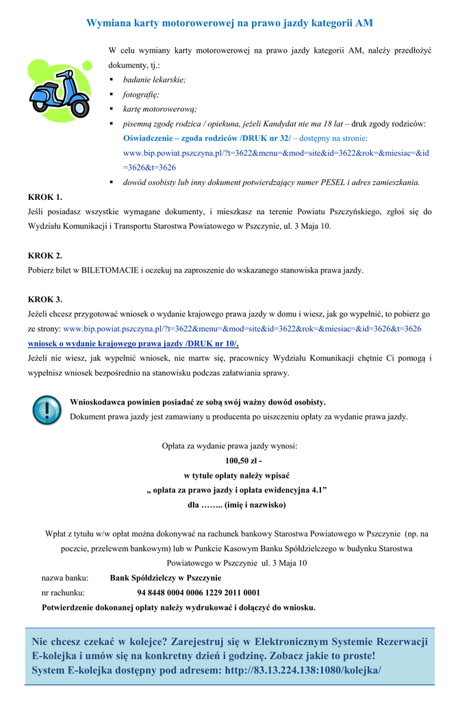 Wymiana karty motorowerowej na prawo jazdy kategorii AM W celu wymiany karty motorowerowej na prawo jazdy kategorii AM, należy przedłożyć dokumenty, tj.: badanie lekarskie; fotografię; kartę motorowerową; pisemną zgodę rodzica / opiekuna, jeżeli Kandydat nie ma 18 lat – druk zgody rodziców: Oświadczenie – zgoda rodziców /DRUK nr 32/ – dostępny na stronie: www.bip.powiat.pszczyna.pl/?t=3622&menu=&mod=site&id=3622&rok=&miesiac=&id =3626&t=3626 dowód osobisty lub inny dokument potwierdzający numer PESEL i adres zamieszkania. KROK 1. Jeśli posiadasz wszystkie wymagane dokumenty, i mieszkasz na terenie Powiatu Pszczyńskiego, zgłoś się do Wydziału Komunikacji i Transportu Starostwa Powiatowego w Pszczynie, ul. 3 Maja 10. KROK 2. Pobierz bilet w BILETOMACIE i oczekuj na zaproszenie do wskazanego stanowiska prawa jazdy. KROK 3. Jeżeli chcesz przygotować wniosek o wydanie krajowego prawa jazdy w domu i wiesz, jak go wypełnić, to pobierz go ze strony: www.bip.powiat.pszczyna.pl/?t=3622&menu=&mod=site&id=3622&rok=&miesiac=&id=3626&t=3626 wniosek o wydanie krajowego prawa jazdy /DRUK nr 10/. Jeżeli nie wiesz, jak wypełnić wniosek, nie martw się, pracownicy Wydziału Komunikacji chętnie Ci pomogą i wypełnisz wniosek bezpośrednio na stanowisku podczas załatwiania sprawy. Wnioskodawca powinien posiadać ze sobą swój ważny dowód osobisty. Dokument prawa jazdy jest zamawiany u producenta po uiszczeniu opłaty za wydanie prawa jazdy. Opłata za wydanie prawa jazdy wynosi: 100,50 zł w tytule opłaty należy wpisać „ opłata za prawo jazdy i opłata ewidencyjna 4.1” dla …….. (imię i nazwisko) Wpłat z tytułu w/w opłat można dokonywać na rachunek bankowy Starostwa Powiatowego w Pszczynie (np. na poczcie, przelewem bankowym) lub w Punkcie Kasowym Banku Spółdzielczego w budynku Starostwa Powiatowego w Pszczynie ul. 3 Maja 10 nazwa banku: nr rachunku: Bank Spółdzielczy w Pszczynie 94 8448 0004 0006 1229 2011 0001 Potwierdzenie dokonanej opłaty należy wydrukować i dołączyć do wniosku. Nie chcesz czekać w kolejce? Zarejestruj się w Elektronicznym Systemie Rezerwacji E-kolejka i umów się na konkretny dzień i godzinę. Zobacz jakie to proste! System E-kolejka dostępny pod adresem: http://83.13.224.138:1080/kolejka/