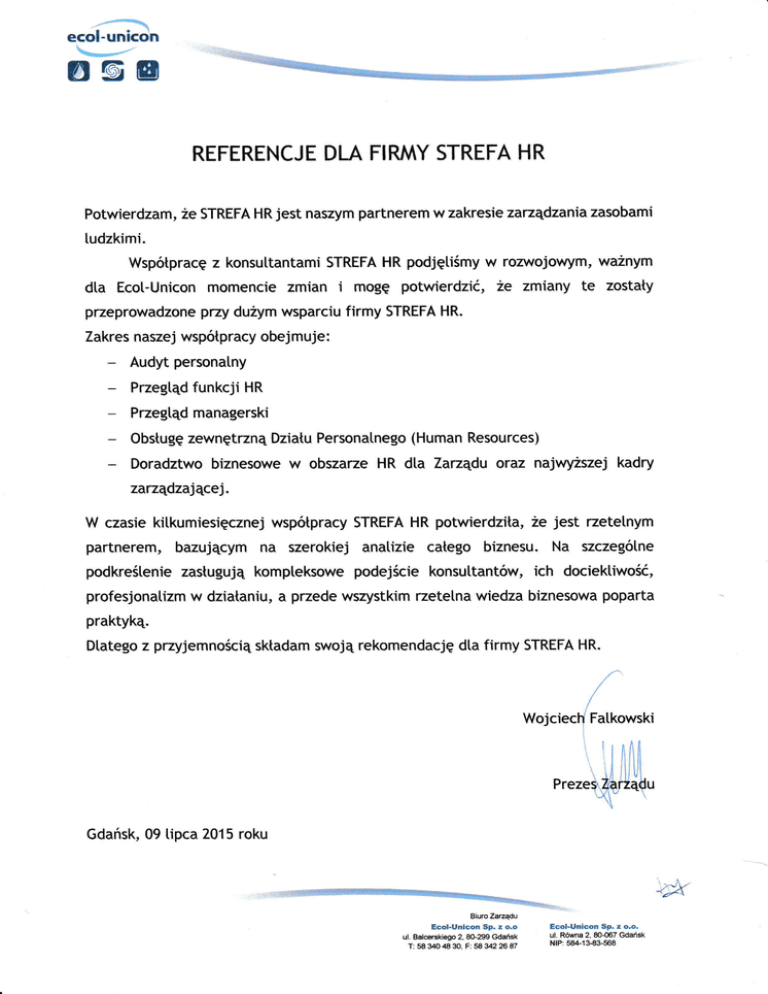 Dlatego z przyjemnością sktadąm §woją rekomendację dta firmy STREFA HR.