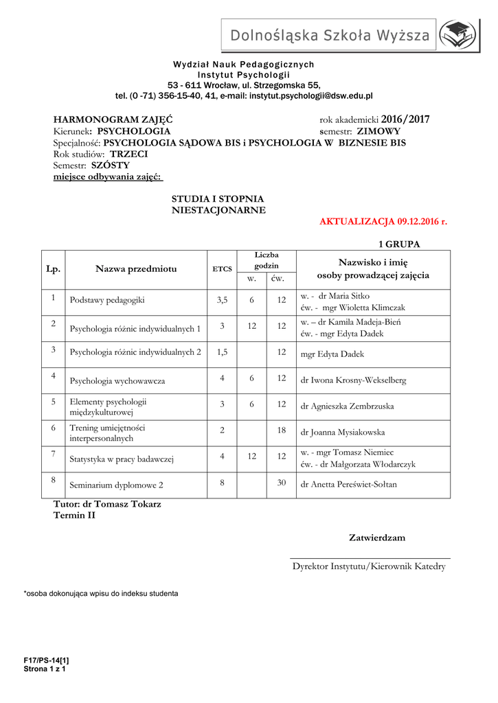 Wydział Nauk Pedagogicznych Instytut Psychologii 53 - 611 Wrocław, ul. Strzegomska 55, tel. (0 -71) 356-15-40, 41, e-mail: [email protected] HARMONOGRAM ZAJĘĆ rok akademicki 2016/2017 Kierunek: PSYCHOLOGIA semestr: ZIMOWY Specjalność: PSYCHOLOGIA SĄDOWA BIS i PSYCHOLOGIA W BIZNESIE BIS Rok studiów: TRZECI Semestr: SZÓSTY miejsce odbywania zajęć: STUDIA I STOPNIA NIESTACJONARNE AKTUALIZACJA 09.12.2016 r. 1 GRUPA Lp. 1 2 3 4 Nazwa przedmiotu ETCS Liczba godzin Nazwisko i imię osoby prowadzącej zajęcia w. ćw. 3,5 6 12 w. - dr Maria Sitko ćw. - mgr Wioletta Klimczak Psychologia różnic indywidualnych 1 3 12 12 w. – dr Kamila Madeja-Bień ćw. - mgr Edyta Dadek Psychologia różnic indywidualnych 2 1,5 12 mgr Edyta Dadek Podstawy pedagogiki Psychologia wychowawcza 4 6 12 dr Iwona Krosny-Wekselberg 5 Elementy psychologii międzykulturowej 3 6 12 dr Agnieszka Zembrzuska 6 Trening umiejętności interpersonalnych 2 18 dr Joanna Mysiakowska Statystyka w pracy badawczej 4 12 w. - mgr Tomasz Niemiec ćw. - dr Małgorzata Włodarczyk Seminarium dyplomowe 2 8 30 dr Anetta Pereświet-Sołtan 7 8 12 Tutor: dr Tomasz Tokarz Termin II Zatwierdzam ________________________________ Dyrektor Instytutu/Kierownik Katedry *osoba dokonująca wpisu do indeksu studenta F17/PS-14[1] Strona 1 z 1 Psychologia sądowa bis i psychologia w biznesie bis 3 rok 6 semestr 9.00 – 11.15 sobota 24.09.16 r. niedziela 25.09.16 r. sobota 8.10.16 r. niedziela 9.10.16 r. sobota 22.10.16 r. niedziela 23.10.16 r. Tutorial dr T. Tokarz s. 206 ul. Strzegomska 55 Psychologia różnic indywidualnych1 wykład (1) dr K. Madeja-Bień s. 206 ul. Strzegomska 55 9.00 – 11.15 Elementy psychologii międzykulturowej ćwiczenia (1) dr A. Zembrzuska s. 307 ul. Strzegomska 55 Psychologia różnic indywidualnych1 wykład (2) dr K. Madeja-Bień s. 06 ul. Strzegomska 47 9.00 – 11.15 Statystyka w pracy badawczej wykład (2) mgr T. Niemiec s. 111 ul. Strzegomska 55 Elementy psychologii międzykulturowej wykład (1) dr A. Zembrzuska s. 126 ul. SZKOCKA 64 Zjazd nr 1 (24, 25 września 2016 r.) 11.30 – 13.45 14.00 - 16.15 Psychologia różnic Psychologia różnic indywidualnych1 indywidualnych1 (1) (2) mgr E. Dadek mgr E. Dadek s. 206 s. 206 ul. Strzegomska 55 ul. Strzegomska 55 Trening umiejętności interpersonalnych (1) dr J. Mysiakowska s. 206 ul. Strzegomska 55 Podstawy pedagogiki ćwiczenia (1) mgr W. Klimczak s. 206 ul. Strzegomska 55 Zjazd nr 2 (8, 9 października 2016 r.) 11.30 – 13.45 14.00 - 16.15 Trening umiejętności interpersonalnych (2) dr J. Mysiakowska s. 307 ul. Strzegomska 55 Psychologia wychowawcza ćwiczenia (2) dr I. Krosny-Wekselberg s. 307 ul. Strzegomska 55 Statystyka w pracy badawczej wykład (1) mgr T. Niemiec s. 03 ul. Strzegomska 47 Statystyka w pracy badawczej ćwiczenia (1) dr M. Włodarczyk s. 216 ul. Strzegomska 47 Zjazd nr 3 (22, 23 października 2016 r.) 11.30 – 13.45 14.00 - 16.15 Statystyka w pracy Elementy psychologii badawczej międzykulturowej ćwiczenia ćwiczenia (2) (2) dr M. Włodarczyk dr A. Zembrzuska s. 216 s. 205 ul. Strzegomska 47 ul. Strzegomska 47 Elementy psychologii Seminarium dyplomowe międzykulturowej (3) ćwiczenia dr A. Pereświet-Sołtan (3) s. 126 dr A. Zembrzuska ul. SZKOCKA 64 s. 126 ul. SZKOCKA 64 16.30 - 18.45 Seminarium dyplomowe (1) dr A. Pereświet-Sołtan s. 206 ul. Strzegomska 55 Psychologia wychowawcza ćwiczenia (1) dr I. Krosny-Wekselberg s. 206 ul. Strzegomska 55 16.30 - 18.45 Podstawy pedagogiki wykład (1) dr M. Sitko s. 03 ul. Strzegomska 47 Seminarium dyplomowe (2) dr A. Pereświet-Sołtan s. 06 ul. Strzegomska 47 16.30 - 18.45 Psychologia wychowawcza wykład (1) dr I. Krosny-Wekselberg s. 27 aula ul. Strzegomska 55 Seminarium dyplomowe (4) dr A. Pereświet-Sołtan s. 126 ul. SZKOCKA 64 Psychologia sądowa bis i psychologia w biznesie bis 3 rok 6 semestr sobota 5.11.16 r. niedziela 6.11.16 r. sobota 26.11.16 r. niedziela 27.11.16 r. sobota 10.12.16 r. niedziela 11.12.16 r. 9.00 – 11.15 Statystyka w pracy badawczej ćwiczenia (3) dr M. Włodarczyk s. 216 ul. Strzegomska 47 Psychologia wychowawcza ćwiczenia (3) dr I. Krosny-Wekselberg s.106 ul. Strzegomska 55 9.00 – 11.15 Elementy psychologii międzykulturowej wykład (2) dr A. Zembrzuska s. 106 ul. Strzegomska 55 Trening umiejętności interpersonalnych (4) dr J. Mysiakowska s. 205 ul. Strzegomska 47 Zjazd nr 4 (5, 6 listopada 2016 r.) 11.30 – 13.45 14.00 - 16.15 16.30 - 18.45 Psychologia różnic indywidualnych1 (3) mgr E. Dadek s.205 ul. Strzegomska 47 Psychologia różnic indywidualnych1 (4) mgr E. Dadek s.205 ul. Strzegomska 47 Trening umiejętności interpersonalnych (3) dr J. Mysiakowska s.205 ul. Strzegomska 47 Podstawy pedagogiki ćwiczenia (2) W. Klimczak s. 106 ul. Strzegomska 55 Seminarium dyplomowe (5) dr A. Pereświet-Sołtan s. 106 ul. Strzegomska 55 Seminarium dyplomowe (6) dr A. Pereświet-Sołtan s. 106 ul. Strzegomska 55 Zjazd nr 5 (26, 27 listopada 2016 r.) 11.30 – 13.45 14.00 - 16.15 Elementy psychologii Psychologia wychowawcza międzykulturowej ćwiczenia ćwiczenia (4) (4) dr I. Krosny-Wekselberg dr A. Zembrzuska s. 106 s. 106 ul. Strzegomska 55 ul. Strzegomska 55 Seminarium dyplomowe Seminarium dyplomowe (7) (8) dr A. Pereświet-Sołtan dr A. Pereświet-Sołtan s. 205 s. 205 ul. Strzegomska 47 ul. Strzegomska 47 9.00 – 11.15 Podstawy pedagogiki ćwiczenia (3) W. Klimczak s. 126 ul. SZKOCKA 64 Zjazd nr 6 (10, 11 grudnia 2016 r.) 11.30 – 13.45 14.00 - 16.15 Psychologia różnic Psychologia różnic indywidualnych2 indywidualnych2 (1) (2) mgr E. Dadek mgr E. Dadek s. 126 s. 126 ul. SZKOCKA 64 ul. SZKOCKA 64 Podstawy pedagogiki wykład (2) dr M. Sitko s. 27 aula ul. Strzegomska 55 Trening umiejętności interpersonalnych (5) dr J. Mysiakowska s.317 ul. Strzegomska 47 Psychologia różnic indywidualnych1 wykład (3) dr K. Madeja-Bień s. 203 ul. Strzegomska 55 16.30 - 18.45 Statystyka w pracy badawczej wykład (3) mgr T. Niemiec s. 05 ul. Strzegomska 47 Tutorial dr T. Tok