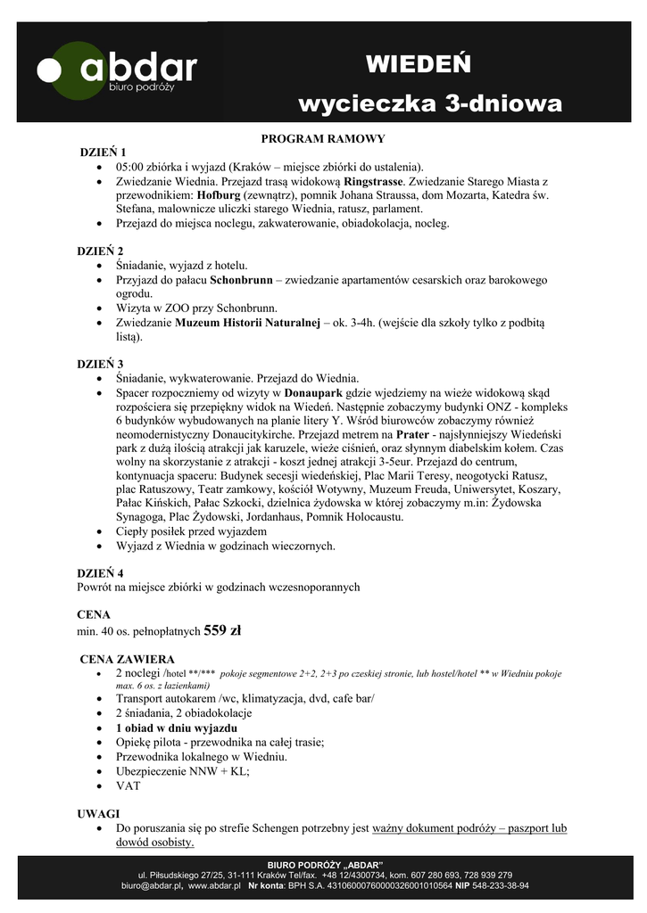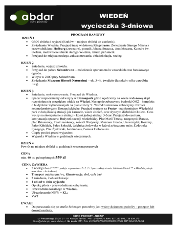 WIEDEŃ wycieczka 3-dniowa PROGRAM RAMOWY DZIEŃ 1 05:00 zbiórka i wyjazd (Kraków – miejsce zbiórki do ustalenia). Zwiedzanie Wiednia. Przejazd trasą widokową Ringstrasse. Zwiedzanie Starego Miasta z przewodnikiem: Hofburg (zewnątrz), pomnik Johana Straussa, dom Mozarta, Katedra św. Stefana, malownicze uliczki starego Wiednia, ratusz, parlament. Przejazd do miejsca noclegu, zakwaterowanie, obiadokolacja, nocleg. DZIEŃ 2 Śniadanie, wyjazd z hotelu. Przyjazd do pałacu Schonbrunn – zwiedzanie apartamentów cesarskich oraz barokowego ogrodu. Wizyta w ZOO przy Schonbrunn. Zwiedzanie Muzeum Historii Naturalnej – ok. 3-4h. (wejście dla szkoły tylko z podbitą listą). DZIEŃ 3 Śniadanie, wykwaterowanie. Przejazd do Wiednia. Spacer rozpoczniemy od wizyty w Donaupark gdzie wjedziemy na wieże widokową skąd rozpościera się przepiękny widok na Wiedeń. Następnie zobaczymy budynki ONZ - kompleks 6 budynków wybudowanych na planie litery Y. Wśród biurowców zobaczymy również neomodernistyczny Donaucitykirche. Przejazd metrem na Prater - najsłynniejszy Wiedeński park z dużą ilością atrakcji jak karuzele, wieże ciśnień, oraz słynnym diabelskim kołem. Czas wolny na skorzystanie z atrakcji - koszt jednej atrakcji 3-5eur. Przejazd do centrum, kontynuacja spaceru: Budynek secesji wiedeńskiej, Plac Marii Teresy, neogotycki Ratusz, plac Ratuszowy, Teatr zamkowy, kościół Wotywny, Muzeum Freuda, Uniwersytet, Koszary, Pałac Kińskich, Pałac Szkocki, dzielnica żydowska w której zobaczymy m.in: Żydowska Synagoga, Plac Żydowski, Jordanhaus, Pomnik Holocaustu. Ciepły posiłek przed wyjazdem Wyjazd z Wiednia w godzinach wieczornych. DZIEŃ 4 Powrót na miejsce zbiórki w godzinach wczesnoporannych CENA min. 40 os. pełnopłatnych 559 zł CENA ZAWIERA 2 noclegi /hotel **/*** pokoje segmentowe 2+2, 2+3 po czeskiej stronie, lub hostel/hotel ** w Wiedniu pokoje max. 6 os. z łazienkami) Transport autokarem /wc, klimatyzacja, dvd, cafe bar/ 2 śniadania, 2 obiadokolacje 1 obiad w dniu wyjazdu Opiekę pilota - przewodnika na całej trasie; Przewodnika lokalnego w Wiedniu. Ubezpieczenie NNW + KL; VAT UWAGI Do poruszania się po strefie Schengen potrzebny jest ważny dokument podróży – paszport lub dowód osobisty. BIURO PODRÓŻY „ABDAR” ul. Piłsudskiego 27/25, 31-111 Kraków Tel/fax. +48 12/4300734, kom. 607 280 693, 728 939 279 [email protected], www.abdar.pl Nr konta: BPH S.A. 43106000760000326001010564 NIP 548-233-38-94 WIEDEŃ wycieczka 3-dniowa Program jest ramowy i może ulec zmianie w zależności od godzin otwarcia obiektów i warunków atmosferycznych. Koszty dodatkowe związane z realizacją programu: ok. 35 euro (Prater płatny dodatkowo) BIURO PODRÓŻY „ABDAR” ul. Piłsudskiego 27/25, 31-111 Kraków Tel/fax. +48 12/4300734, kom. 607 280 693, 728 939 279 [email protected], www.abdar.pl Nr konta: BPH S.A. 43106000760000326001010564 NIP 548-233-38-94