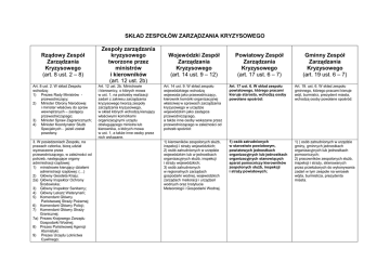 SKŁAD ZESPOŁÓW ZARZĄDZANIA KRYZYSOWEGO Rządowy Zespół Zarządzania Kryzysowego (art. 8 ust. 2 – 8) Art. 8 ust. 2. W skład Zespołu wchodzą: 1) Prezes Rady Ministrów przewodniczący; 2) Minister Obrony Narodowej i minister właściwy do spraw wewnętrznych – zastępcy przewodniczącego; 3) Minister Spraw Zagranicznych; 4) Minister Koordynator SłuŜb Specjalnych - jeŜeli został powołany. 3. W posiedzeniach Zespołu, na prawach członka, biorą udział wyznaczone przez przewodniczącego, w zaleŜności od potrzeb, następujące organy administracji rządowej: 1) ministrowie kierujący działami administracji rządowej: (…) 2) Główny Geodeta Kraju; 2a) Główny Inspektor Ochrony Środowiska; 3) Główny Inspektor Sanitarny; 4) Główny Lekarz Weterynarii; 5) Komendant Główny Państwowej StraŜy PoŜarnej; 6) Komendant Główny Policji; 7) Komendant Główny StraŜy Granicznej; 7a) Prezes Krajowego Zarządu Gospodarki Wodnej; 8) Prezes Państwowej Agencji Atomistyki; 9) Prezes Urzędu Lotnictwa Cywilnego; Zespoły zarządzania kryzysowego tworzone przez ministrów i kierowników (art. 12 ust. 2b) Art. 12 ust. 2b. Ministrowie i kierownicy, o których mowa w ust. 1, na potrzeby realizacji zadań z zakresu zarządzania kryzysowego tworzą zespoły zarządzania kryzysowego, w skład których wchodzą kierujący właściwymi komórkami organizacyjnymi urzędu obsługującego ministra lub kierownika, o których mowa w ust. 1, a takŜe inne osoby przez nich wskazane. Wojewódzki Zespół Zarządzania Kryzysowego (art. 14 ust. 9 – 12) Powiatowy Zespół Zarządzania Kryzysowego (art. 17 ust. 6 – 7) Gminny Zespół Zarządzania Kryzysowego (art. 19 ust. 6 – 7) Art. 14 ust. 9. W skład zespołu wojewódzkiego wchodzą wojewoda jako przewodniczący, kierownik komórki organizacyjnej właściwej w sprawach zarządzania kryzysowego w urzędzie wojewódzkim jako zastępca przewodniczącego, a takŜe inne osoby wskazane przez przewodniczącego w zaleŜności od potrzeb spośród: Art. 17 ust. 6. W skład zespołu powiatowego, którego pracami kieruje starosta, wchodzą osoby powołane spośród: Art. 19. ust. 6. W skład zespołu gminnego, którego pracami kieruje wójt, burmistrz, prezydent miasta, wchodzą osoby powołane spośród: 1) kierowników zespolonych słuŜb, inspekcji i straŜy wojewódzkich; 2) osób zatrudnionych w urzędzie wojewódzkim lub w jednostkach organizacyjnych słuŜb, inspekcji i straŜy wojewódzkich; 3) osób zatrudnionych w regionalnych zarządach gospodarki wodnej, wojewódzkich zarządach melioracji i urządzeń wodnych oraz Instytucie Meteorologii i Gospodarki Wodnej. 1) osób zatrudnionych w starostwie powiatowym, powiatowych jednostkach organizacyjnych lub jednostkach organizacyjnych stanowiących aparat pomocniczy kierowników zespolonych słuŜb, inspekcji i straŜy powiatowych; 1) ) osób zatrudnionych w urzędzie gminy, gminnych jednostkach organizacyjnych lub jednostkach pomocniczych; 2) pracowników zespolonych słuŜb, inspekcji i straŜy, skierowanych przez przełoŜonych do wykonywania zadań w tym zespole na wniosek wójta, burmistrza, prezydenta miasta. 10) Szef Agencji Bezpieczeństwa Wewnętrznego; 11) Szef Agencji Wywiadu; 12) Szef Obrony Cywilnej Kraju; 13) Szef SłuŜby Kontrwywiadu Wojskowego; 14) Szef SłuŜby Wywiadu Wojskowego; 4. Prezydent Rzeczypospolitej Polskiej moŜe skierować do prac Zespołu, na prawach członka, Szefa Biura Bezpieczeństwa Narodowego lub innego przedstawiciela. 5. Przewodniczący moŜe zapraszać do udziału w posiedzeniach Zespołu, na prawach członka, inne osoby. 6. W przypadku nieobecności przewodniczącego, pracami Zespołu kieruje wyznaczony przez niego zastępca albo członek Zespołu, w którego właściwości - wynikającej z kierowania danym działem administracji rządowej – pozostaje rodzaj zaistniałej sytuacji kryzysowej. 10. Przewodniczący moŜe postanowić o włączeniu w skład zespołu wojewódzkiego Szefa Wojewódzkiego Sztabu Wojskowego lub jego przedstawiciela 2) przedstawicieli społecznych organizacji ratowniczych. 3) przedstawicieli społecznych organizacji ratowniczych. 7. W skład zespołu powiatowego mogą wchodzić inne osoby zaproszone przez starostę. 7. W skład zespołu gminnego mogą wchodzić inne osoby zaproszone przez wójta, burmistrza, prezydenta miasta. 11. W skład zespołu wojewódzkiego moŜe wchodzić przedstawiciel samorządu województwa, wyznaczony przez marszałka województwa. 7. Członkowie Zespołu mogą wyznaczyć do udziału w jego pracach swoich przedstawicieli: 1) Prezes Rady Ministrów – wiceprezesa Rady Ministrów; 2) ministrowie – sekretarza lub podsekretarza stanu; 3) organy, o których mowa w ust. 3 pkt 2 – 14 – swojego zastępcę. 12. W skład zespołu wojewódzkiego mogą wchodzić inne osoby zaproszone przez przewodniczącego.