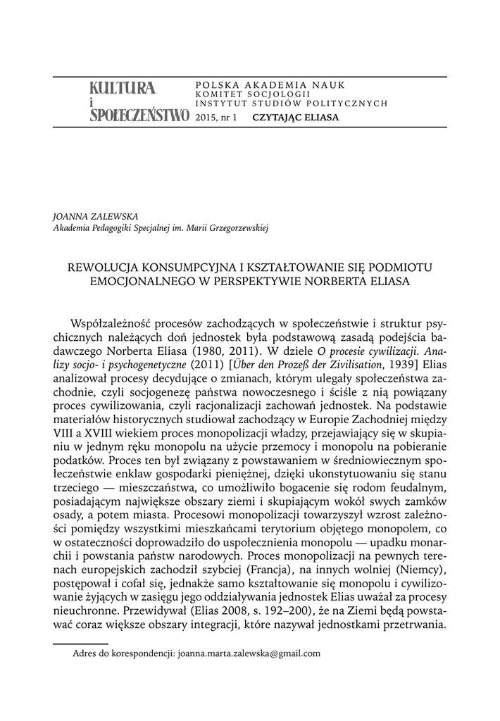 POLSKA AKADEMIA NAUK KOMITET SOCJOLOGII INSTYTUT STUDIÓW POLITYCZNYCH 2015, nr 1 CZYTAJĄC ELIASA JOANNA ZALEWSKA Akademia Pedagogiki Specjalnej im. Marii Grzegorzewskiej REWOLUCJA KONSUMPCYJNA I KSZTAŁTOWANIE SIĘ PODMIOTU EMOCJONALNEGO W PERSPEKTYWIE NORBERTA ELIASA Współzależność procesów zachodzących w społeczeństwie i struktur psychicznych należących doń jednostek była podstawową zasadą podejścia badawczego Norberta Eliasa (1980, 2011). W dziele O procesie cywilizacji. Analizy socjo- i psychogenetyczne (2011) [Über den Prozeß der Zivilisation, 1939] Elias analizował procesy decydujące o zmianach, którym ulegały społeczeństwa zachodnie, czyli socjogenezę państwa nowoczesnego i ściśle z nią powiązany proces cywilizowania, czyli racjonalizacji zachowań jednostek. Na podstawie materiałów historycznych studiował zachodzący w Europie Zachodniej między VIII a XVIII wiekiem proces monopolizacji władzy, przejawiający się w skupianiu w jednym ręku monopolu na użycie przemocy i monopolu na pobieranie podatków. Proces ten był związany z powstawaniem w średniowiecznym społeczeństwie enklaw gospodarki pieniężnej, dzięki ukonstytuowaniu się stanu trzeciego — mieszczaństwa, co umożliwiło bogacenie się rodom feudalnym, posiadającym największe obszary ziemi i skupiającym wokół swych zamków osady, a potem miasta. Procesowi monopolizacji towarzyszył wzrost zależności pomiędzy wszystkimi mieszkańcami terytorium objętego monopolem, co w ostateczności doprowadziło do uspołecznienia monopolu — upadku monarchii i powstania państw narodowych. Proces monopolizacji na pewnych terenach europejskich zachodził szybciej (Francja), na innych wolniej (Niemcy), postępował i cofał się, jednakże samo kształtowanie się monopolu i cywilizowanie żyjących w zasięgu jego oddziaływania jednostek Elias uważał za procesy nieuchronne. Przewidywał (Elias 2008, s. 192–200), że na Ziemi będą powstawać coraz większe obszary integracji, które nazywał jednostkami przetrwania. Adres do korespondencji: [email protected] 116 JOANNA ZALEWSKA Sądził, że obecnie jesteśmy na drodze do wykształcenia się jednostki przetrwania na poziomie całej ludzkości. Współcześnie rywalizacja między jednostkami zachodzi tylko w sferze ekonomicznej, dzięki temu, że państwa mają monopol na przemoc fizyczną, co usuwa zagrożenie bezpośrednich walk między rywalizującymi (Elias 2011). W momencie, w którym Elias kończy swoją analizę: gdy monopol na użycie przemocy i pobieranie podatków przechodzi z rąk monarchy w ręce obywateli, a konkretnie burżuazji, czyli w momencie ukonstytuowania się państwa nowoczesnego, studia rozpoczynają historycy ekonomiczni i socjologowie — zauważają, że w tym okresie dokonała się tzw. rewolucja konsumpcyjna. Rewolucja konsumpcyjna jest pojęciem, za pomocą którego — podobnie jak w teorii Eliasa — próbuje się połączyć dwa porządki: makro- i mikrospołeczny. Składające się na nią procesy są bowiem odpowiedzialne za popyt na dobra produkowane masowo dzięki rewolucji przemysłowej. Rewolucja konsumpcyjna jest to rozprzestrzenienie się gospodarki pieniężnej na wszystkie sektory społeczeństw zachodnich, czemu towarzyszy rozwój rynków narodowych (McKendrick, Brewer, Plumb 1982), które stają się areną walk o monopol w sferze ekonomicznej. Rewolucja konsumpcyjna wiąże się również z przemianą struktury psychicznej jednostki, z postępowaniem — analizowanego przez Eliasa — procesu racjonalizacji, która zaczyna dotyczyć również sfery emocji. W okresie opisywanym przez Eliasa emocje i popędy były wytłumiane i spychane do podświadomości. Pisząc o genezie rewolucji konsumpcyjnej Colin Campbell (1987) twierdzi, że emocje przestają być traktowane jako zewnętrzne siły targające człowiekiem, zostają umiejscowione we wnętrzu jednostki, a ich odczuwanie ma przynosić jednostkom indywidualną przyjemność. Tę przemianę od wytłumiania i spychania do podświadomości do otwartego wyrażania emocji można wytłumaczyć za pomocą Eliasowskiej analogii stosunku do spania. W XIX wieku czynność spania jako potrzeba fizjologiczna była ukryta w prywatnej strefie sypialni. Zmieniło się to w XX wieku i — jak wskazuje Elias — nie wynika z cofnięcia się procesu cywilizowania, lecz wręcz przeciwnie. Społeczeństwo stworzyło odpowiednie formy pozwalające ucywilizować to zachowanie, czyli piżamy. Podobnie można myśleć o emocjach: w XVIII wieku na dworze królewskim były wytłumiane, w XX wieku zaś stały się otwarcie wyrażane, ponieważ powstały odpowiednie formy, by je ucywilizować. Opisywana przez Eliasa (2011) stopniowa przemiana struktury psychicznej jednostek, która wiązała się ze wzrostem samokontroli i podniesieniem progu wstydu, odpowiada za zachodzący od końca średniowiecza proces cywilizowania. Na dworze królewskim rodziły się coraz bardziej wyrafinowane formy zachowania, jak jedzenie widelcem i używanie chusteczki do nosa. Rywalizacja kulturowa między słabnącą pod względem ekonomicznym arystokracją i bogacącą się burżuazją powołała do życia modę. Gdy tylko przedstawiciele burżuazji zaczynali naśladować zdobycze cywilizacyjne arystokracji, członkowie arystokracji znajdowali nowe formy wyrazu, by się odróżnić. W procesie REWOLUCJA KONSUMPCYJNA I KSZTAŁTOWANIE SIĘ EMOCJONALNEGO PODMIOTU 117 rewolucji konsumpcyjnej moda objęła wszystkie warstwy społeczne, stając się instrumentem rywalizacji między członkami społeczeństw nowoczesnych. Moim celem jest analiza ważnego momentu rewolucji konsumpcyjnej w Polsce — okresu po drugiej wojnie światowej, kiedy duże grupy ludności przenosiły się ze wsi do miast, znajdując zatrudnienie w przemyśle. Władze Polski Ludowej wdrażały nowe technologie w przemyśle i w mieszkalnictwie, propagowały ideologię postępu, która realizować się miała w r