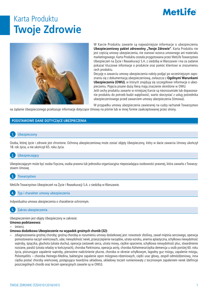 Karta Produktu Twoje Zdrowie W Karcie Produktu zawarte są najważniejsze informacje o ubezpieczeniu Ubezpieczeniowy pakiet zdrowotny „Twoje Zdrowie”. Karta Produktu nie jest częścią umowy ubezpieczenia, nie stanowi wzorca umownego ani materiału marketingowego. Karta Produktu została przygotowana przez MetLife Towarzystwo Ubezpieczeń na Życie i Reasekuracji S.A. z siedzibą w Warszawie i ma za zadanie pokazać kluczowe informacje o produkcie oraz pomóc klientowi w zrozumieniu cech produktu. Decyzję o zawarciu umowy ubezpieczenia należy podjąć po wcześniejszym zapoznaniu się z dokumentacją ubezpieczeniową, zwłaszcza z Ogólnymi Warunkami Ubezpieczenia (OWU), w których znajdują się szczegółowe informacje o ubezpieczeniu. Pojęcia pisane dużą literą mają znaczenie określone w OWU. Jeśli cechy produktu zawarte w niniejszej Karcie są niezrozumiałe lub dopasowanie produktu do potrzeb budzi wątpliwość, warto skorzystać z usług pośrednika ubezpieczeniowego przed zawarciem umowy ubezpieczenia (Umowa). W przypadku umowy ubezpieczenia zawieranej na cudzy rachunek Towarzystwo na żądanie Ubezpieczonego przekazuje informacje dotyczące Umowy na piśmie lub w innej formie zaakceptowanej przez strony. PODSTAWOWE DANE DOTYCZĄCE UBEZPIECZENIA 1. Ubezpieczony Osoba, której życie i zdrowie jest chronione. Ochroną ubezpieczeniową może zostać objęty Ubezpieczony, który w dacie zawarcia Umowy ukończył 18. rok życia, a nie ukończył 65. roku życia. 2. Ubezpieczający Ubezpieczającym może być osoba fizyczna, osoba prawna lub jednostka organizacyjna nieposiadająca osobowości prawnej, która zawarła z Towarzystwem Umowę. 3. Towarzystwo MetLife Towarzystwo Ubezpieczeń na Życie i Reasekuracji S.A. z siedzibą w Warszawie. 4. Typ i charakter umowy ubezpieczenia Indywidualna umowa ubezpieczenia o charakterze ochronnym. 5. Zakres ubezpieczenia Ubezpieczeniem jest objęty Ubezpieczony w zakresie: Umowa podstawowa: –śmierci, Umowa dodatkowa Ubezpieczenie na wypadek groźnych chorób (32): – zdiagnozowania groźnej choroby; groźną chorobą w rozumieniu umowy dodatkowej jest: nowotwór złośliwy, zawał mięśnia sercowego, operacja pomostowania naczyń wieńcowych, udar, niewydolność nerek, przeszczepienie narządów, utrata wzroku, anemia aplastyczna, schyłkowa niewydolność wątroby, śpiączka, głuchota (utrata słuchu), operacja zastawek serca, utrata mowy, ciężkie oparzenie, schyłkowa niewydolność płuc, stwardnienie rozsiane, paraliż (utrata władzy w kończynach), choroba Parkinsona, operacja aorty, choroba Alzheimera/ciężka demencja u osób poniżej 60. roku życia, piorunujące zapalenie wątroby, pierwotne nadciśnienie płucne, choroba w okresie schyłkowym, łagodny guz mózgu, zapalenie mózgu, Poliomyelitis – choroba Heinego-Medina, bakteryjne zapalenie opon mózgowo-rdzeniowych, ciężki uraz głowy, zespół odmóżdżeniowy, inna ciężka postać choroby wieńcowej, postępująca twardzina układowa, układowy toczeń rumieniowaty z toczniowym zapaleniem nerek (definicje poszczególnych chorób oraz leczeń operacyjnych zawarte są w OWU). TWOJE ZDROWIE (TZD/01012016/V01) 1 6. Początek ochrony ubezpieczeniowej Umowa podstawowa Odpowiedzialność Towarzystwa rozpoczyna się od daty wejścia w życie Umowy (data rozpoczęcia ochrony ubezpieczeniowej), pod warunkiem zawarcia Umowy, i wskazana jest w Szczegółowej Umowie Ubezpieczenia (polisie). Warunkiem zawarcia Umowy jest otrzymanie i zaakceptowanie przez Towarzystwo: a) podpisanego przez Ubezpieczającego wniosku o zawarcie umowy ubezpieczenia oraz b) kwoty na poczet pierwszej składki opłaconej przez Ubezpieczającego, oraz c) wszystkich wymaganych przez Towarzystwo dokumentów niezbędnych do podjęcia decyzji o objęciu Ubezpieczonego ochroną ubezpieczeniową. Data zawarcia Umowy jest datą odebrania polisy przez Ubezpieczającego, dlatego ważne jest, by jak najszybciej odebrać polisę. Umowa dodatkowa Odpowiedzialność Towarzystwa rozpoczyna się od daty wejścia w życie umowy dodatkowej wskazanej w Szczegółowej Umowie Ubezpieczenia, pod warunkiem zawarcia umowy dodatkowej oraz opłacenia składki. 7. Koniec ochrony ubezpieczeniowej Umowa podstawowa 1. Umowa zawierana jest na jeden z wybranych przez Ubezpieczającego okresów ochrony ubezpieczeniowej trwający odpowiednio: 5 lat, 10 lat lub do rocznicy Umowy następującej bezpośrednio po 65. urodzinach Ubezpieczonego. 2. Umowa wygasa w każdym z następujących przypadków: a) w dniu śmierci Ubezpieczonego lub b) odstąpienia od Umowy – z dniem otrzymania przez Ubezpieczyciela wniosku o odstąpienie od Umowy, lub c) z datą wygaśnięcia umowy podstawowej wskazanej w Szczegółowej Umowie Ubezpieczenia, lub d) nieopłacenia składki, z upływem okresu karencji, nie wcześniej jednak niż w ciągu 7 dni od daty otrzymania wezwania do zapłaty składki, lub e) z dniem rozwiązania Umowy w związku z wypowiedzeniem Umowy przez Ubezpieczającego, lub f) w rocznicę Umowy następującą bezpośrednio po 65. urodzinach Ubezpieczonego. Umowa dodatkowa 1. Umowa dodatkowa zawierana jest na okres, za który Ubezpieczający opłaca składkę oraz następujący po nim okres karencji określony w umowie podstawowej, z tym, że nie dłużej niż do końca okresu obowiązywania umowy podstawowej. 2. Umowa dodatkowa wygasa, a obowiązek opłacania składek z jej tytułu ustaje w każdym z poniższych przypadków: a) którakolwiek składka z tytułu Umowy nie została opłacona do końca okresu karencji przewidzianego w Umowie, lecz nie wcześniej niż dnia następnego po upływie 7 dni od daty otrzymania wezwania do opłacenia składki lub b) umowa podstawowa wygasła, lub c) powstania obowiązku wypłaty przez Towarzystwo świadczenia z tytułu groźnej choroby, lub d) Ubezpieczający został w trakcie trwania umowy dodatkowej uznany za niepoczytalnego – z dniem powstania stanu niepoczytalności, lub e) Ubezpiecz
