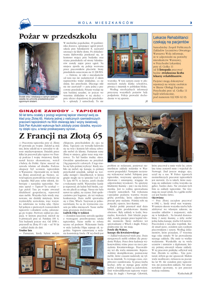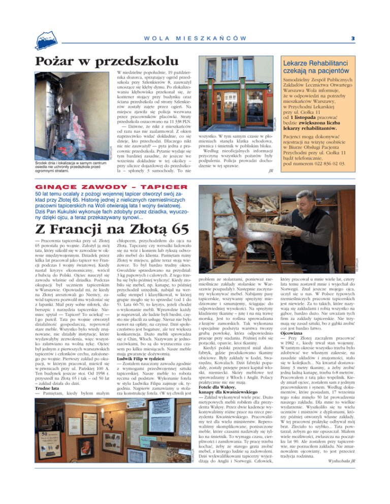 W O L A M I E S Z K A Ń C Ó W 3 REDAKCJA Pożar w przedszkolu Środek dnia i lokalizacja w samym centrum osiedla nie uchroniły przedszkola przed ogromnymi stratami. Lekarze Rehabilitanci czekają na pacjentów REDAKCJA W niedzielne popołudnie, 19 paździer− nika dozorca, sprzątający ogród przed− szkola przy Szlenkierów 8, zauważył unoszące się kłęby dymu. Po zlokalizo− waniu kłębowiska przekonał się, że kontener stojący przy budynku oraz ściana przedszkola od strony Szlenkie− rów zostały zajęte przez ogień. Na miejscu zjawiła się policja wezwana przez pracowników placówki. Straty przedszkola oszacowano na 11 338 PLN. — Dziwne, że nikt z mieszkańców od razu nas nie zaalarmował. Z okien naprzeciwko widać dokładnie, co się dzieje, kto przechodzi. Dlaczego nikt nic nie zauważył? — pyta jedna z pra− cownic przedszkola. Pytanie wydaje się tym bardziej zasadne, że jeszcze we wrześniu dokładnie w tej okolicy – przy uliczce dojazdowej do przedszko− la – spłonęły 3 samochody. To nie wszystko. W tym samym czasie w pło− mieniach stanęła klatka schodowa, piwnica i śmietnik w pobliskim bloku. Według nieoficjalnych informacji przyczyną wszystkich pożarów były podpalenia. Policja prowadzi docho− dzenie w tej sprawie. JR Samodzielny Zespół Publicznych Zakładów Lecznictwa Otwartego Warszawa Wola informuje, że w odpowiedzi na potrzeby mieszkańców Warszawy, w Przychodni Lekarskiej przy ul. Ciołka 11 od 1 listopada pracować będzie zwiększona liczba lekarzy rehabilitantów. Pacjenci mogą dokonywać rejestracji na wizytę osobiście w Biurze Obsługi Pacjenta Przychodni przy ul. Ciołka 11 bądź telefonicznie, pod numerem 022 836 02 03. GINĄCE ZAWODY – TAPICER 50 lat temu ocalały z pożogi wojennej tapicer otworzył swój zakład przy Złotej 65. Historię jednej z nielicznych rzemieślniczych pracowni tapicerskich na Woli otwierają lata I wojny światowej. Dziś Pan Kukulski wykonuje fach zdobyty przez dziadka, wyuczony dzięki ojcu, a teraz przekazywany synowi... chłopcem, przychodziłem do ojca na Złotą. Tapczany czy wersalki ładowało się na wóz i koniem lub rykszą odwo− ziło mebel do klienta. Pamiętam ruiny Złotej w miejscu, gdzie teraz stoją wie− żowce. To był bardzo trudny okres. Gwoździe sprzedawano na przydział: 3 kg papowych i calowych. Z tego trze− ba się było później wyliczyć. Kiedy zro− biło się mebel, np. kanapę, to później przychodził urzędnik, nabijał na wer− salkę stempel i klasyfikował, w której grupie mogło się to sprzedać (od 1 do 5). Lata 60−70, to kryzys, jeżeli chodzi o wykonanie mebli. Wprawdzie każdy je naprawiał, ale ludzie byli biedni, czę− sto nie płacili za usługę. Nieraz nie było nawet na opłaty, na czynsz. Dziś społe− czeństwo jest bogatsze, ale też większa konkurencja. Dużo mebli sprowadza się z Chin, Włoch. Nazywam je jedno− razówkami, bo są do wyrzucenia cza− sem po kilku miesiącach. Nasze meble mają gwarancję dożywotnią. Ludwik Filip w tydzień — Zostałem nauczony zawodu zgodnie z wymogami przedwojennej sztuki tapicerskiej. Nasze meble to robota ręczna od podstaw. Wykonanie fotela w stylu Ludwika Filipa zajmuje ok. ty− godnia. Najpierw zamawiamy u stola− rza konstrukcję fotela. (W tej chwili jest REDAKCJA — Pracownia tapicerska przy ul. Złotej 65 powstała po wojnie. Założył ją mój tata, który szkolił się w zawodzie w ok− resie międzywojennym. Dziadek przez kilka lat pracował jako tapicer we Fran− cji podczas I wojny światowej. Kiedy nastał kryzys ekonomiczny, wrócił z babcią do Polski. Ojciec nauczył się zawodu właśnie od dziadka. Podczas okupacji był uczniem tapicerskim w Warszawie. Opowiadał mi, że kiedy na Złotej aresztowali go Niemcy, za− wód tapicera pozwolił mu wydostać się z łapanki. Miał przy sobie młotek, du− berszpic i narzędzia tapicerskie. Nie− miec spytał — Tapicer? To uciekaj! — I go puścił. Tata po wojnie otworzył działalność gospodarczą, reperował stare meble. Wszystko było wtedy zruj− nowane, nie działały instytucje, które wydawałyby zezwolenia, więc wszyst− ko załatwiano na wolną rękę. Ojciec był jednym z pierwszych warszawskich tapicerów i członków cechu, założone− go po wojnie. Pierwszy zakład po oku− pacji, w którym pracował, mieścił się w piwnicach przy ul. Pańskiej 100 A. Ten budynek jeszcze stoi. Od 1958 r. przyszedł na Złotą 65 i tak – od 50 lat – zakład działa do dziś. Trudne lata — Pamiętam, kiedy byłem małym REDAKCJA Z Francji na Złotą 65 problem ze stolarzami, ponieważ rze− mieślnicze zakłady stolarskie w War− szawie poupadały). Następnie zaczyna− my wykonywać mebel. Nabijamy pasy tapicerskie, wszywamy sprężyny mie− dziowane i sznurujemy, ściągając do odpowiedniej wysokości. Na sprężyny kładziemy tkaninę – jutę i na nią trawę morską. Jest to roślina sprowadzana z krajów zamorskich. Tak wykonana i specjalnie podszyta warstwa tworzy grubą powłokę, która odpowiednio pracuje przy siadaniu. Później robi się porączki, oparcie, kroi tkaniny. Kiedyś polski przemysł miał dużo fabryk, gdzie produkowano tkaniny obiciowe. Były zakłady w Łodzi, Swa− rzędzu, Kowalach. Dziś fabryki popa− dały, zostały przejęte przez kapitał wło− ski, niemiecki. Skóry meblowe też sprowadzamy z Włoch i Anglii. Polacy praktycznie nic nie mają. Fotele dla Wałęsy, kanapy dla Kwaśniewskiego — Zakład wykonywał wiele prac. Dużo nietypowych mebli robiłem dla prezy− denta Wałęsy. Przez dwie kadencje wy− konywaliśmy różne prace na rzecz pre− zydenta Kwaśniewskiego. Pracowaliś− my też dla wielu ministerstw. Repero− waliśmy skomplikowane, poniszczone meble, które czasami nadawały się tyl− ko na śmietnik. To wymaga czasu, cier− pliwości i zamiłowania. Tę pracę trzeba kochać, żeby ze starego grata zrobić 