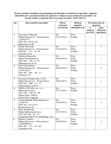 Wykaz punktów handlowych posiadających aktualne zezwolenie na sprzedaż napojów alkoholowych z przeznaczeniem do spożycia w miejscu i poza miejscem sprzedaży na terenie Gminy Legnickie Pole (wg stanu na dzień 31.03. 2014 r.) Lp. 1. 2. 3. 4. 5. 6. 7. 8. 9. Adres punktu sprzedaży Krzysztof Tołłoczko Sklep Spożywczo – Przemysłowy „DANUTA” NIP: 691- 203-01-46 Bartoszów nr 48 Stefan Stawarski Sklep Spożywczo –Przemysłowy NIP:691 – 131 – 10 -38 Taczalin nr 26 Mariusz Kukuczka Sklep Wielobranżowy NIP: 695 – 100 -15 -51 Mikołajowice nr 16 Dorota Brzuśnian Sklep Spożywczo – Przemysłowy „NATALIA” NIP: 691 – 001 – 40 - 77 Lubień nr 24 Krystyna Świątkowska F.H.U. Sklep Spożywczo – Przemysłowy NIP: 691 – 000 – 51 - 38 Gniewomierz nr 60 A SHELL POLSKA sp. z o.o. Sklep Spożywczy NIP: 526 – 100- 91 - 90 Stacja Paliw SHELL Nowa Wieś Legnicka Aneta Roberek Sklep Spożywczy „ANETA” NIP: 691 -212-37-87 Koskowice nr 43 Piotr Wasilewski Sklep Ogólnospożywczy NIP: 691-204 - 39 - 76 Legnickie Pole Pl. H. Pobożnego nr 8 Renata Tymków Sklep Spożywczo –Przemysłowy „DOMINIKA” NIP: 691 – 137 – 83 - 09 Taczalin nr 50 Okres ważności zezwolenia Rodzaj napojów alkoholowych Do 31.07.2016 r. Piwo Wódka Do: 31.05.2014 r. Piwo Wino Wódka Do: 30.06.2014 r. Przeznaczenie do spożycia w poza miejscu miejscem sprzedaży sprzedaży - + - + Piwo Wino Wódka - + Do: 30.06.2016 r. Piwo Wino Wódka - + Do: 30.06.2014 r. Piwo Wino Wódka - + Do: 31.07.2014 r. Piwo Wódka - + Do: 30.04.2015 r. Piwo Wino Wódka - + Do: 31.07.2014 r. Piwo Wino Wódka - + Do: 30.04.2014 r. Piwo Wino Wódka - + 10. 11. 12. 13. 14. 15. 16. 17. 18. 19. 20. 21. Danuta Laska, Barbara Halz s.c. Sklep Spożywczo-Przemysłowy NIP: 691- 241 – 16 - 70 Legnickie Pole ul. Piastowska nr 15 Agnieszka chochołem Sklep Spożywczo-Przemysłowy „Agnieszka” NIP: 691 - 233 – 50 - 06 Nowa Wieś Legnicka nr 63 Agnieszka Krzywdzińska „KADEX” Sklep Spożywczo –Przemysłowy NIP: 691 – 152 – 86 -02 Raczkowa nr 10 b Jadwiga Granda Handel Art. Spożyw. i Przemysłowymi - Sklep Mięsny NIP: 691 – 000 -78 - 70 Legnickie Pole Pl. H. Pobożnego nr 8 Agnieszka Krzywdzińska „KADEX” Sklep Spożywczy NIP: 691 – 152 – 86 -02 Nowa Wieś Legnicka /osiedle/ P.H.U. „BULIS” s.c. Jarosław Bulski, Barbara Bulska, Stanisław Bulski NIP: 991-994-28-27 Stacja Paliw Koskowice 72 Bernard Kamiński Hotel - Restauracja „DWOREK” NIP: 6911033800 Obręb Gniewomierz, 96 km autostrady Bernard Kamiński Hotel - Restauracja „DWOREK – BIS” NIP: 691 – 103 -38 - 00 Obręb Gniewomierz, 96 km autostrady Beata Kijowska PHU Gastronomiczno – Hotelowe NIP: 691-001 -47 -98 Legnickie Pole ul. Ks. Anny nr 9 Zdzisław Kaszczyszyn F H-U Bar „Pod Wierzbą” NIP: 691- 001- 97- 26 Koskowice nr 29 „SOUNDTRADE” s. c. Kamil Berkowski, Paweł Berkowski NIP: 899 - 255 – 92 - 74 Bartoszów nr 7 Krystyna Świątkowska F.H.U. Bar Gastronomiczny NIP: 691 – 000 -51 38 Gniewomierz nr 60A Do: 31.05.2015 r. Piwo Wino Wódka - + Do: 30.06.2016 r. Piwo Wino Wódka - + Do: 31.08.2015 r. Piwo Wino Wódka - + Do: 30.09.2015 r. Piwo - + Do: 30.06.2016 r. Piwo Wino Wódka - + Do: 31.05.2016 r. Piwo Wódka - + Do: 30.06.2016 r. Piwo Wino Wódka + - Do: 31.03.2016 r. Piwo Wino Wódka + - Do: 31.03.2016 r. Piwo + - Do: 31.10.2014 r. Piwo Wino Wódka + - Do: 11.02.2015 r. Piwo + - Do: 30.06.2017 r. Piwo + - 22. 23. 24. Lucyna Bobak Cukiernia „Paulinka” NIP: 695 – 103 – 33 - 44 Legnickie Pole Pl. H. Pobożnego nr 6 M. Pelc, A. Pelc „PLUS” s.c. Bar NIP: 691 – 100 -12 - 20 Stacja Paliw SHELL Lucyna Bobak Cukiernia „Paulinka” Mini - Bar NIP: 695 – 103 – 33 - 44 Legnickie Pole ul. H. Brodatego nr 7 R A Z E M : 24 Sporządziła: Jadwiga Gawron Inspektor ds. społecznych i przedsiębiorczości Do: 31.07.2016 r. Piwo + - Do: 31.05.2016 r. Piwo + - Do: 31.08.2016 r. Piwo + - 9 15