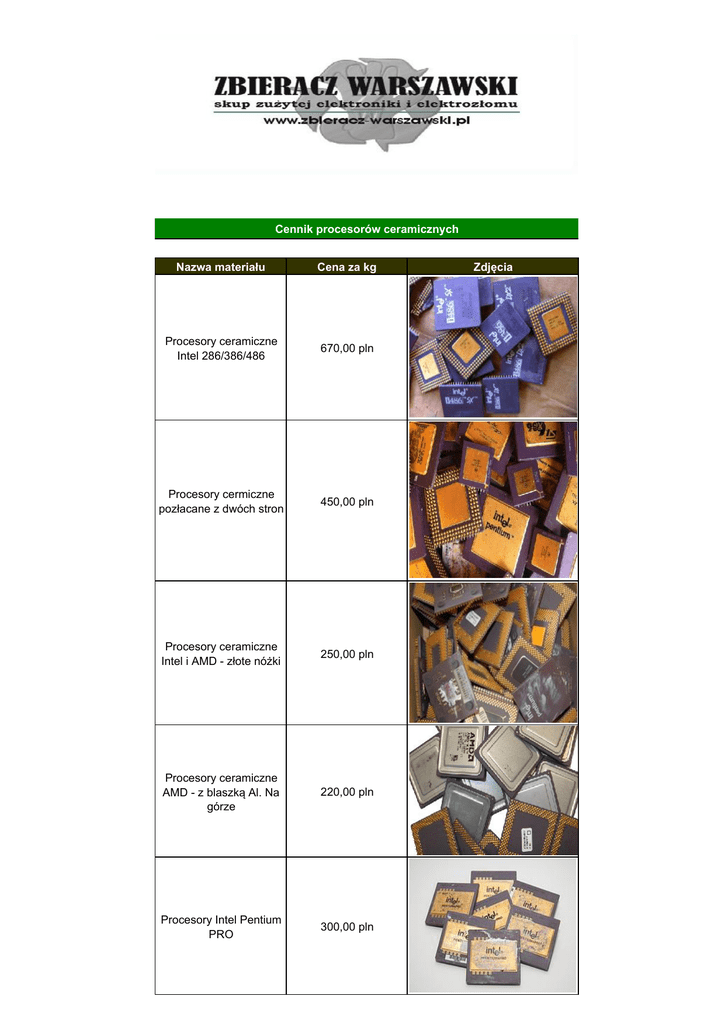 Cennik procesorów ceramicznych Nazwa materiału Cena za kg Procesory ceramiczne Intel 286/386/486 670,00 pln Procesory cermiczne pozłacane z dwóch stron 450,00 pln Procesory ceramiczne Intel i AMD - złote nóżki 250,00 pln Procesory ceramiczne AMD - z blaszką Al. Na górze 220,00 pln Procesory Intel Pentium PRO 300,00 pln Zdjęcia Procesory ceramiczne pozłacane tylko z góry 350,00 pln Procesory ceramiczne MIX 300,00 pln Procesory ceramiczne AMD i inne 286/386/486 400,00 pln Procesory ceramiczne pozłacane tylko z dołu 550,00 pln Przy dużych ilościach możliwość negocjacji ceny Kontakt: e-mail: [email protected] [email protected] telefon: 694 150 760 - Sebastian Dudecki 606 267 435 - Marek Dudecki 513 138 109 - Hubert Dudecki Zbieracz Warszawski jest marką firmy Electronic Wizards S.C. S. Dudecki, M. Dudecki mieszczącej się w Warszawie przy ulicy Mianowskiego 24/34 02-044 Warszawa NIP: 7010323174 REGON: 145876850 GIOŚ: E0016576Z