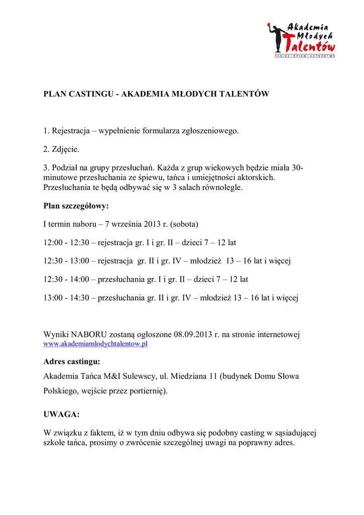 PLAN CASTINGU - AKADEMIA MŁODYCH TALENTÓW 1. Rejestracja – wypełnienie formularza zgłoszeniowego. 2. Zdjęcie. 3. Podział na grupy przesłuchań. Każda z grup wiekowych będzie miała 30minutowe przesłuchania ze śpiewu, tańca i umiejętności aktorskich. Przesłuchania te będą odbywać się w 3 salach równolegle. Plan szczegółowy: I termin naboru – 7 września 2013 r. (sobota) 12:00 - 12:30 – rejestracja gr. I i gr. II – dzieci 7 – 12 lat 12:30 - 13:00 – rejestracja gr. II i gr. IV – młodzież 13 – 16 lat i więcej 12:30 - 14:00 – przesłuchania gr. I i gr. II – dzieci 7 – 12 lat 13:00 - 14:30 – przesłuchania gr. II i gr. IV – młodzież 13 – 16 lat i więcej Wyniki NABORU zostaną ogłoszone 08.09.2013 r. na stronie internetowej www.akademiamlodychtalentow.pl Adres castingu: Akademia Tańca M&I Sulewscy, ul. Miedziana 11 (budynek Domu Słowa Polskiego, wejście przez portiernię). UWAGA: W związku z faktem, iż w tym dniu odbywa się podobny casting w sąsiadującej szkole tańca, prosimy o zwrócenie szczególnej uwagi na poprawny adres.